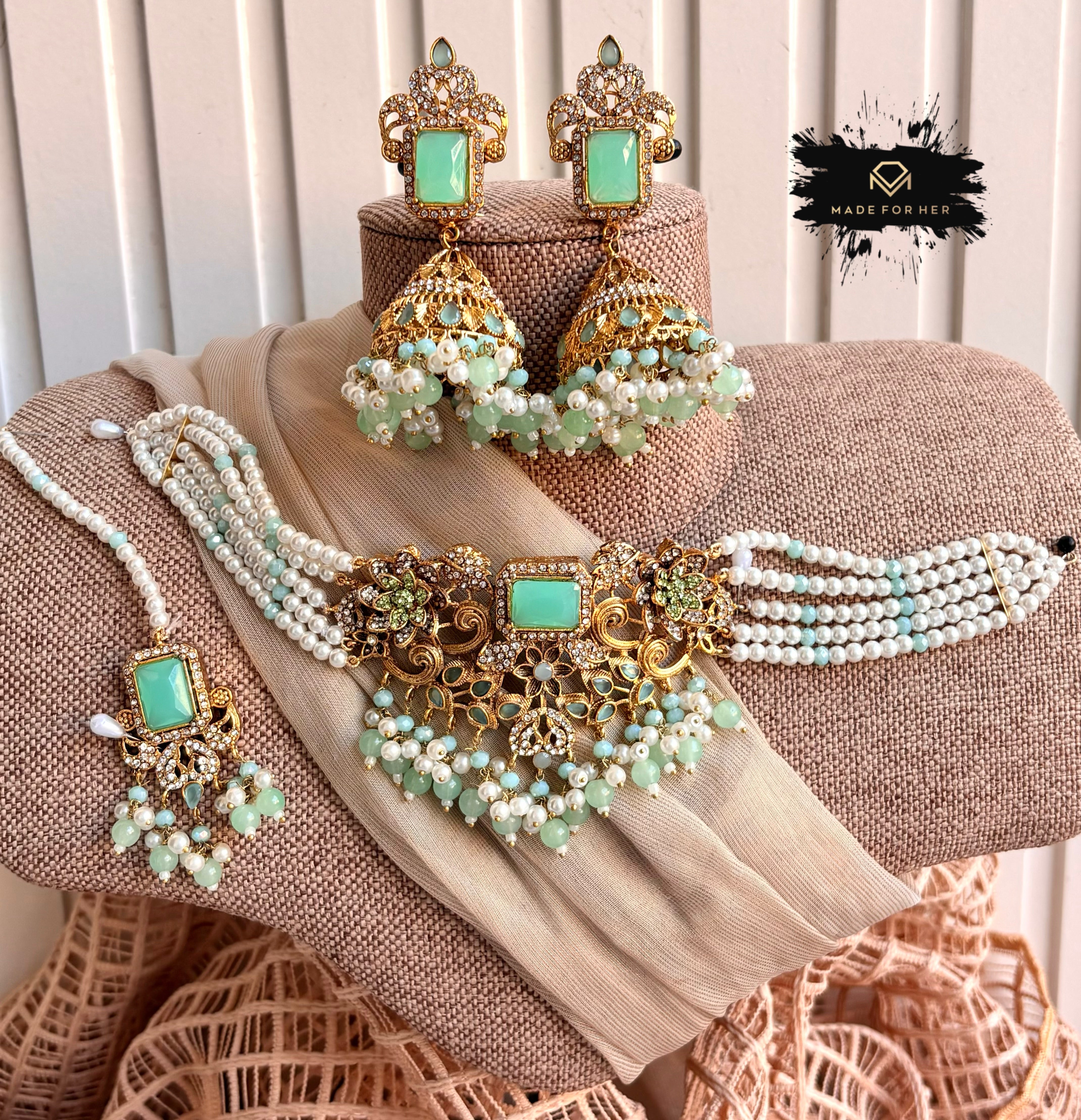 A beautifully crafted choker set designed to add elegance and sparkle to your festive look. The Zirelle Choker Set features finely set zircon stones that create a graceful shimmer, making it a perfect choice for weddings, festive occasions, and evening wear. The balanced design sits comfortably on the neckline while the matching earrings complete the look with effortless charm.