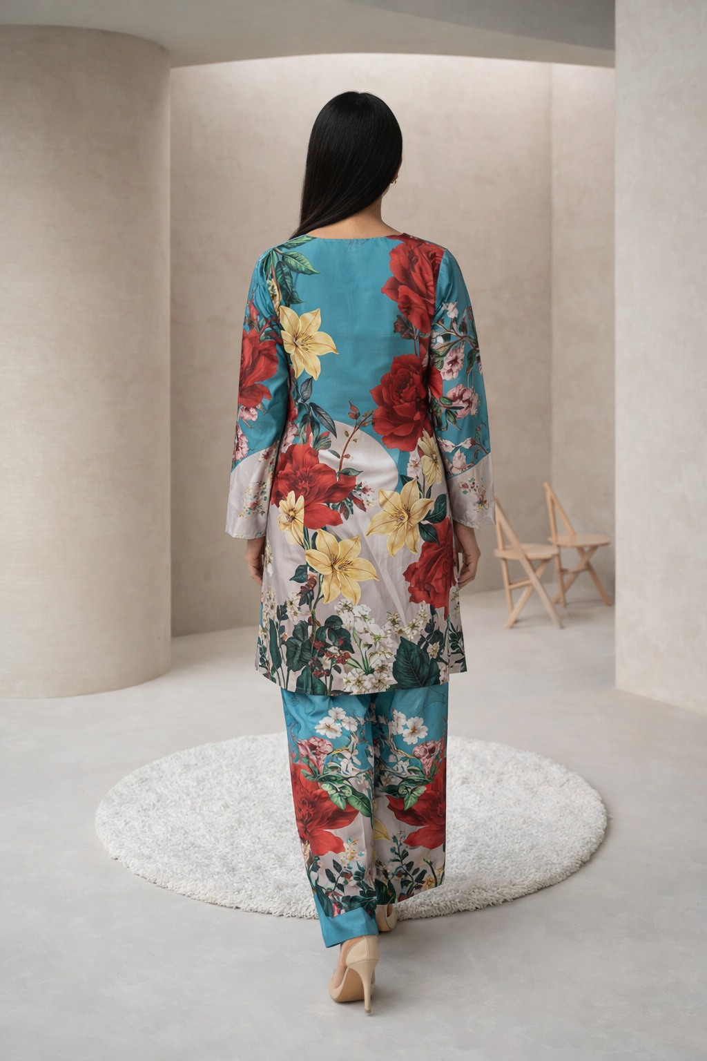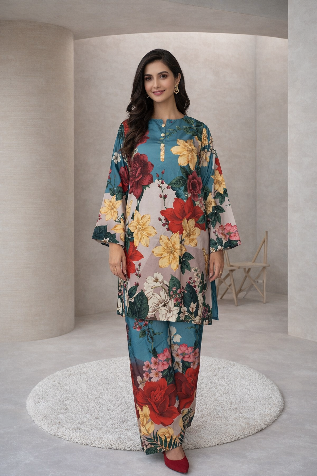 2-piece co-ord set crafted from soft, breathable malai cotton, featuring vibrant digital floral prints in soothing yet statement tones. Designed for everyday comfort with an elevated look, this set includes a relaxed-fit printed shirt paired with matching trousers for easy styling.