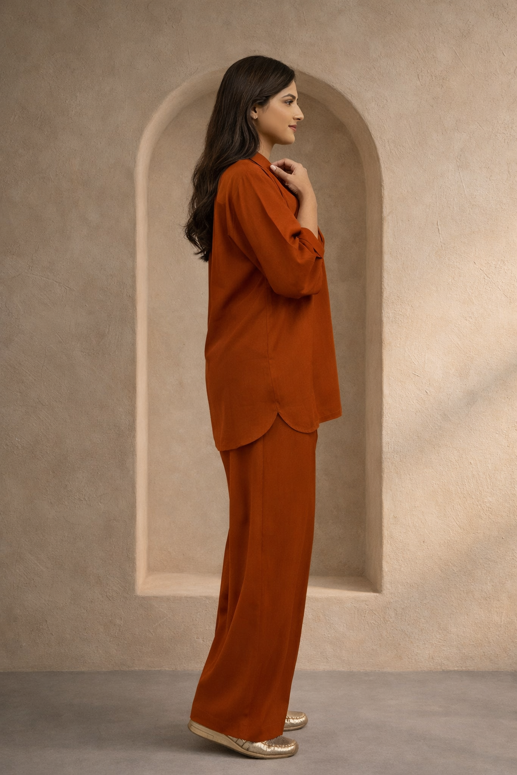 Stone Age is a timeless 2-piece co-ord set designed in a rich rust hue, crafted for effortless everyday elegance. Featuring a relaxed-fit shirt paired with matching trousers, this set offers a clean silhouette with a comfortable, breathable feel?perfect for elevated casual wear.