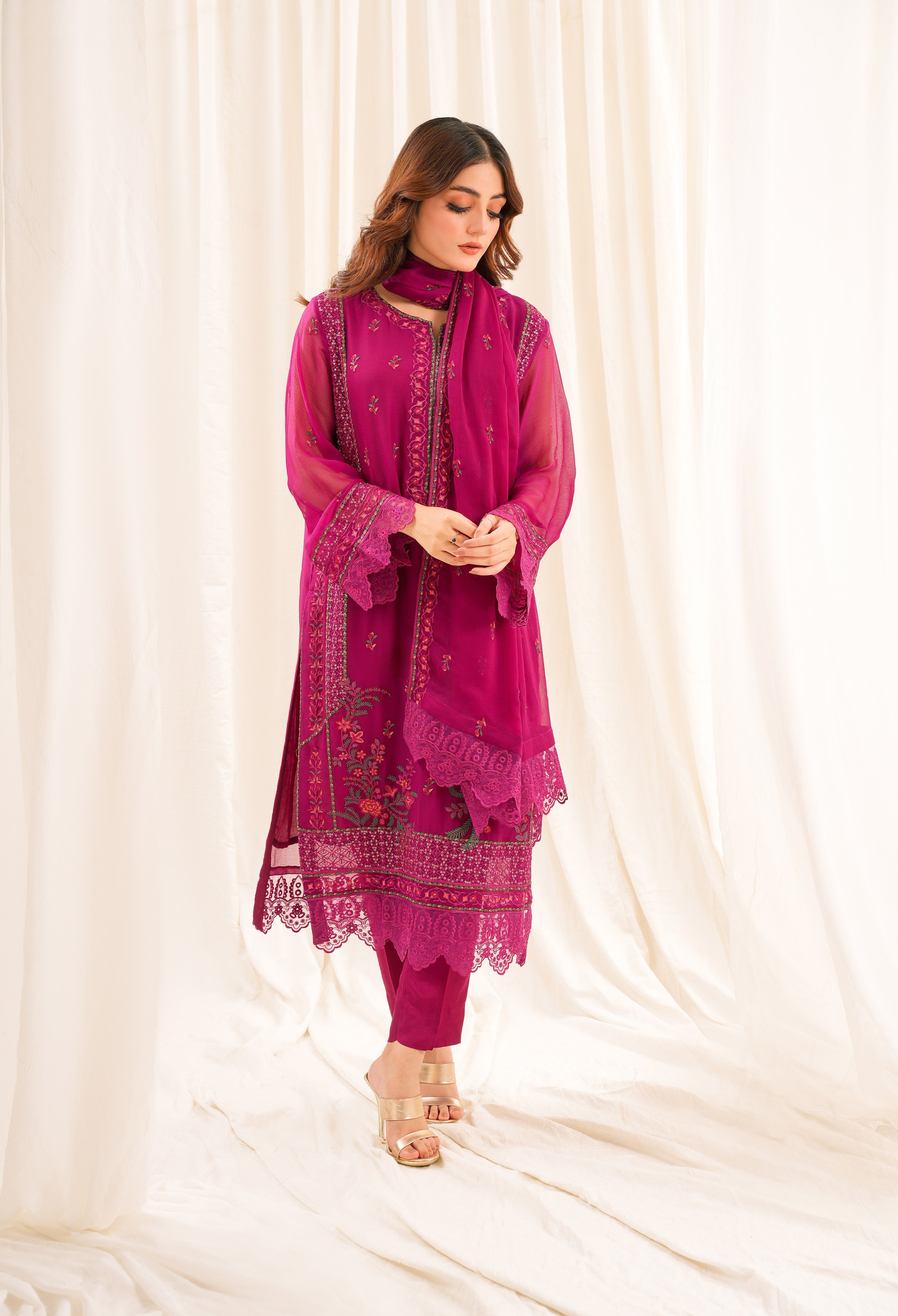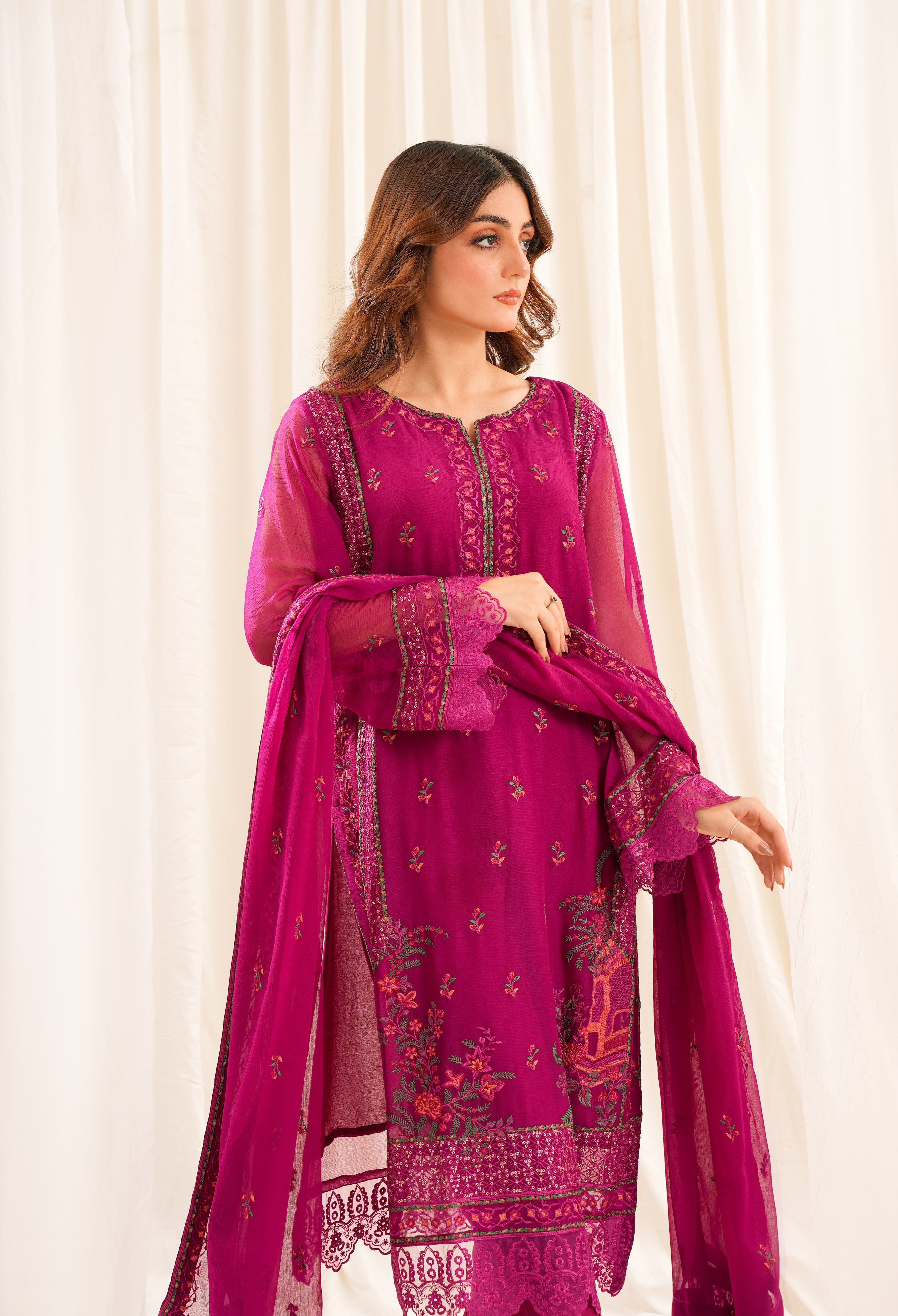 Experience luxury with our Magenta 3 piece suit made from fine chiffon and intricately embroidered. Elevate your style and stand out in any occasion.