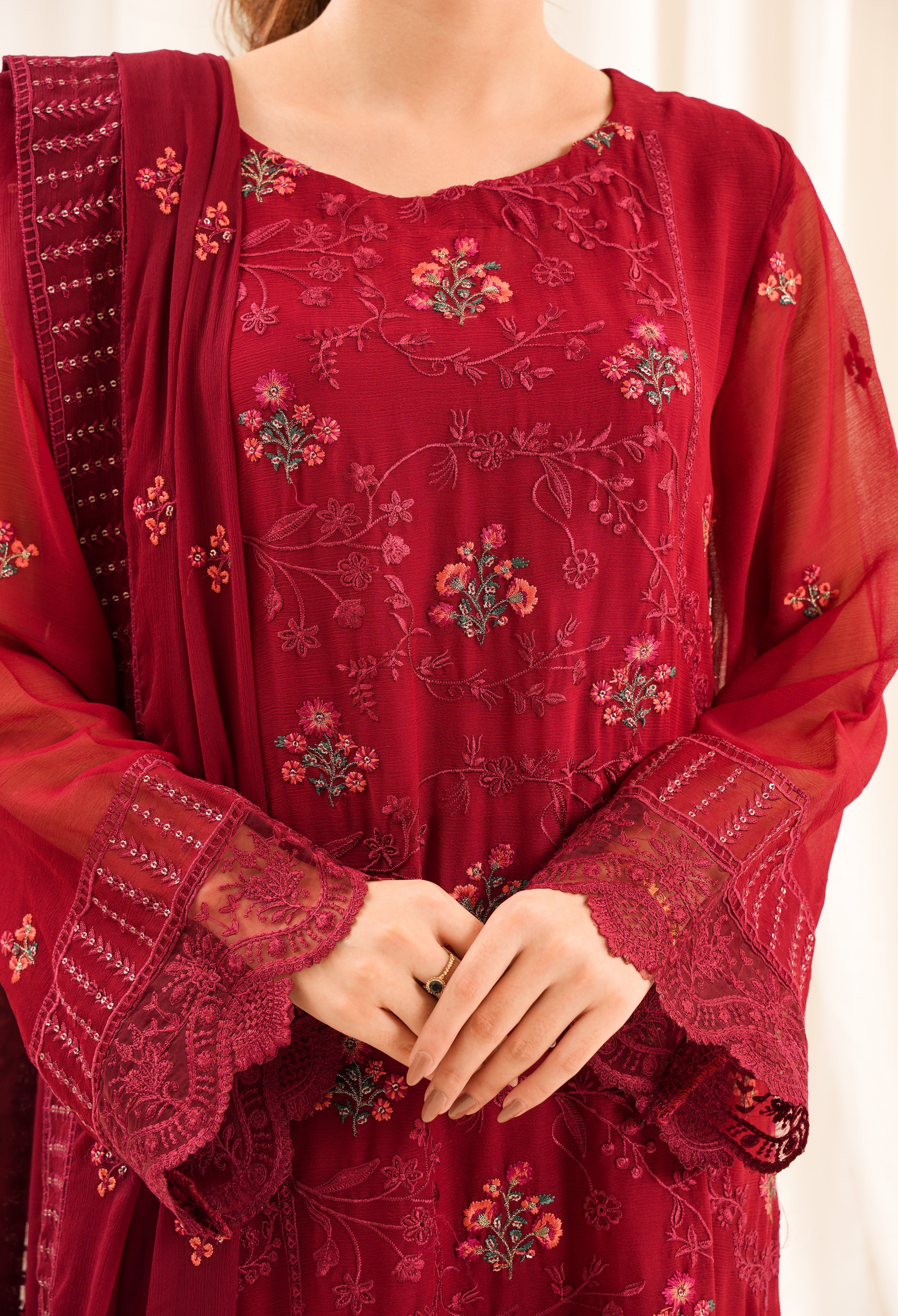 Experience luxury with our Maroon Scarlet 3 piece suit made from fine chiffon and intricately embroidered. Elevate your style and stand out in any occasion.