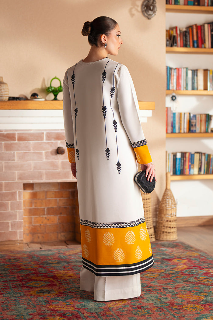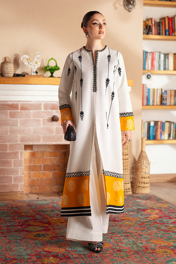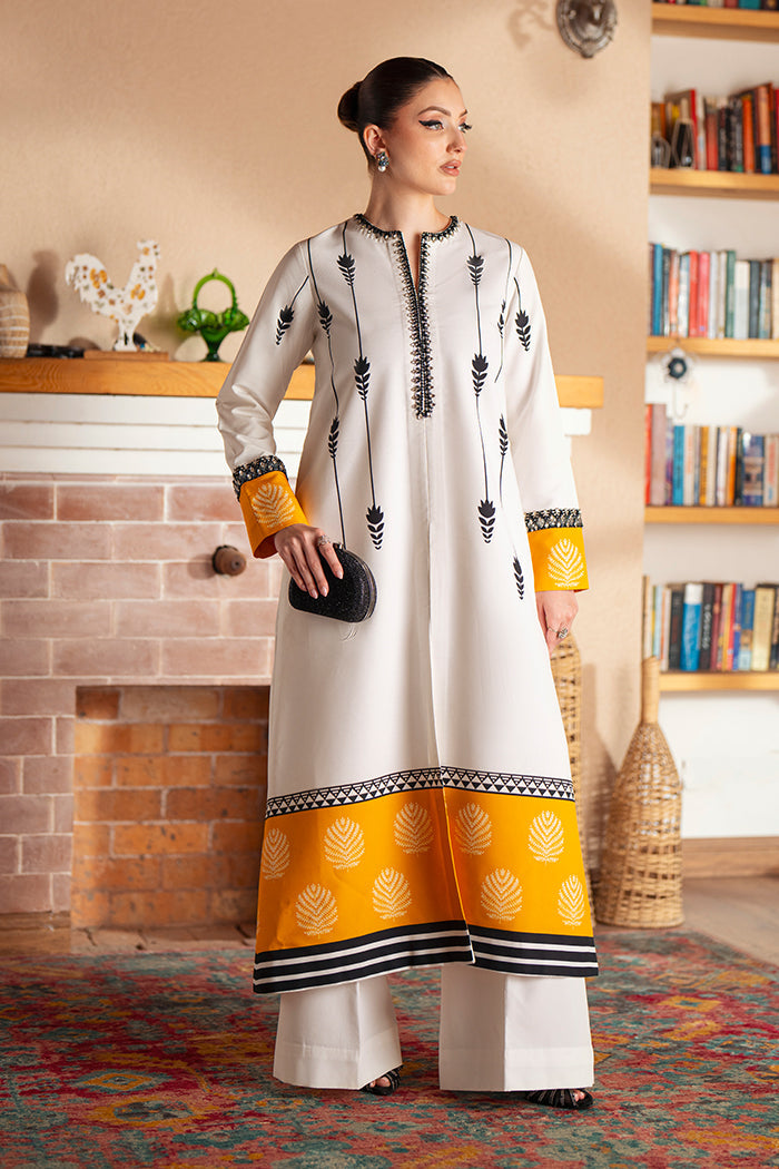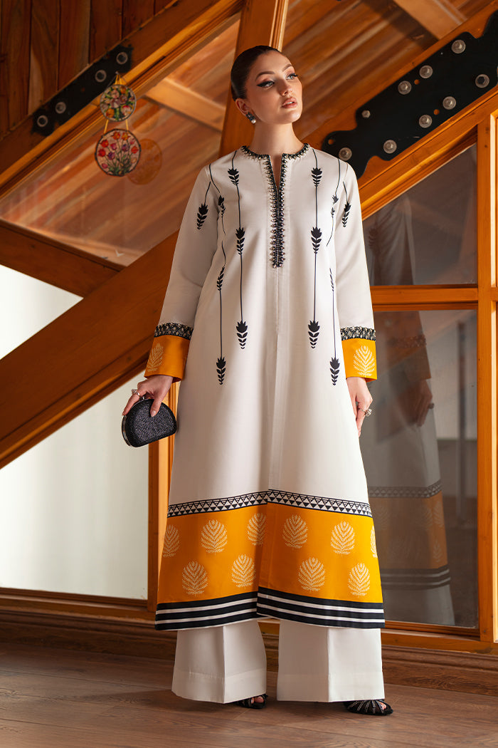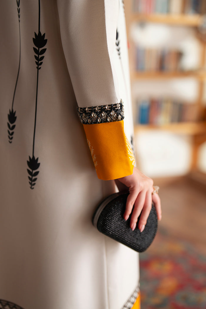 A chic crepe ensemble featuring a straight shirt adorned with intricate hand embellishments on the neckline and sleeves. Paired with matching crepe trousers, this look blends minimal elegance with modern detailing. The striking contrast of black motifs and vibrant mustard accents adds a bold touch to its sophisticated charm.