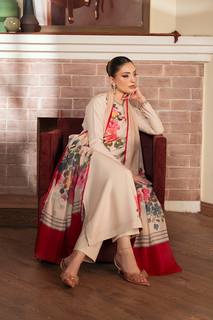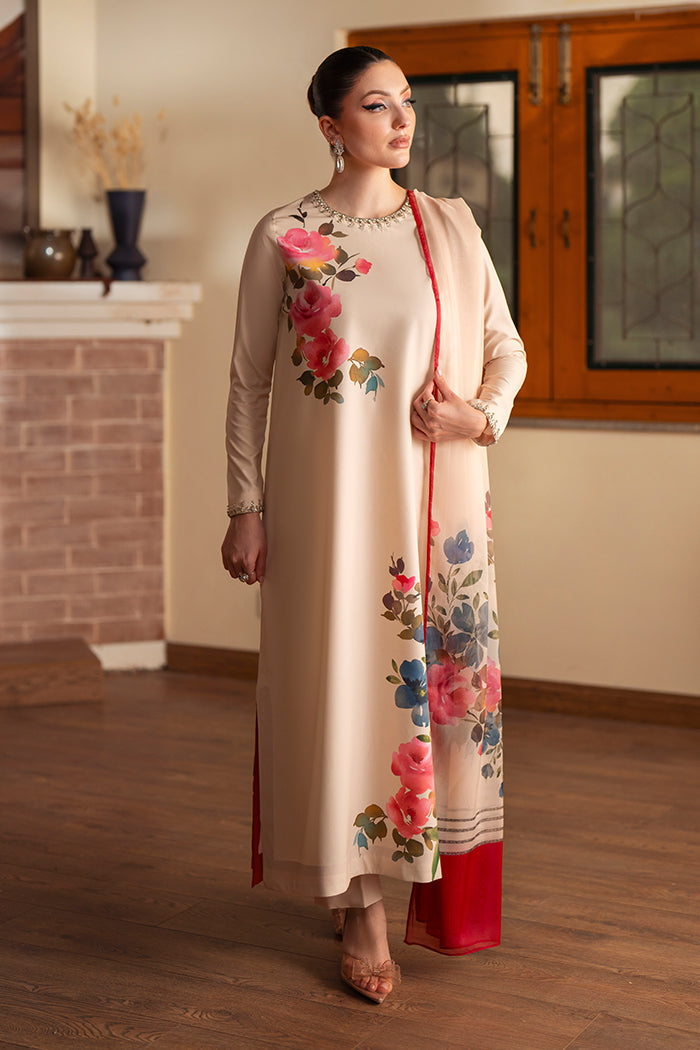 An elegant floral crepe shirt adorned with delicate hand embellishment on the neckline and sleeves, paired with a silk printed dupatta. A graceful ensemble that blends timeless charm with modern sophistication.
