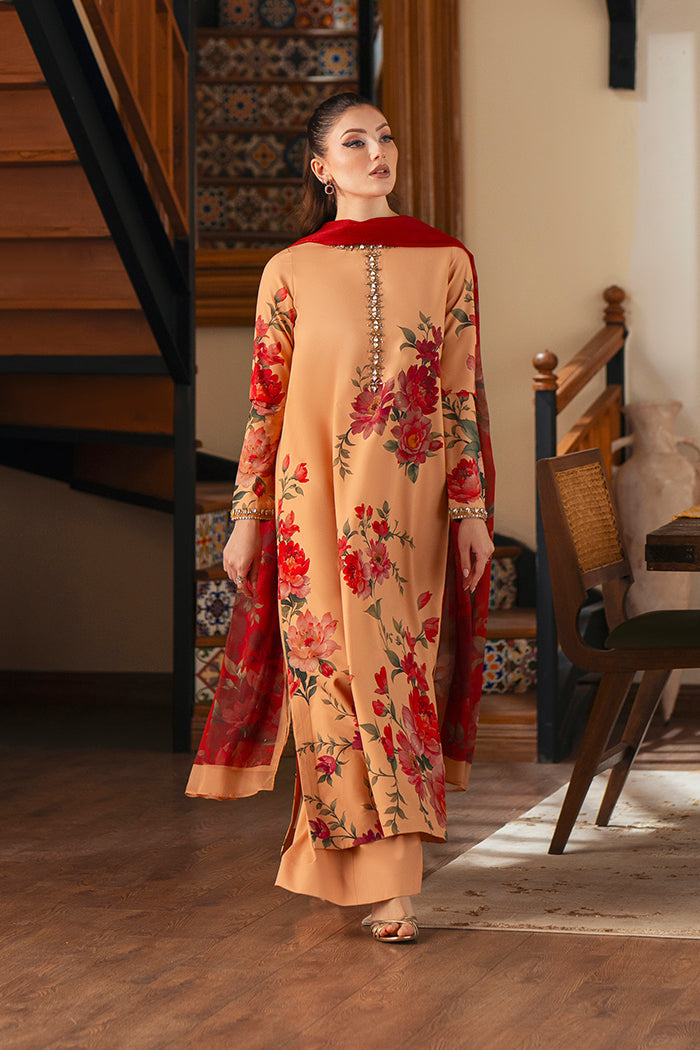 A graceful peach-toned crepe shirt adorned with intricate hand embellishment on the neckline and sleeves, paired with matching crepe trousers. The look is completed with a contrasting silk dupatta featuring a vibrant floral print, adding charm and sophistication. Perfect for festive and semi-formal occasions.
