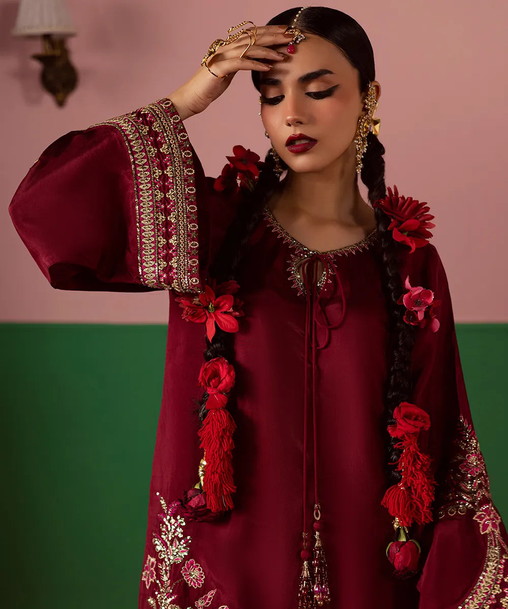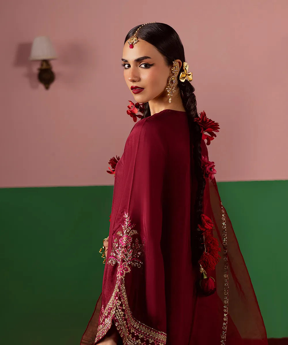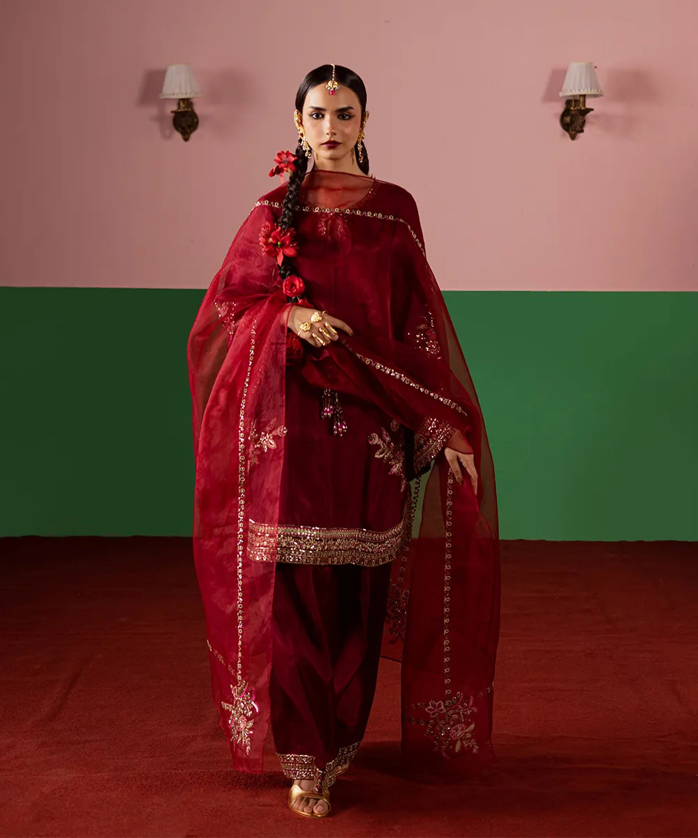 Exquisite craftsmanship adorns this maroon silk shirt, featuring intricate gold embroidery and sequins on the hem and sleeves. The look is completed with an organza dupatta and matching farshi shalwar.