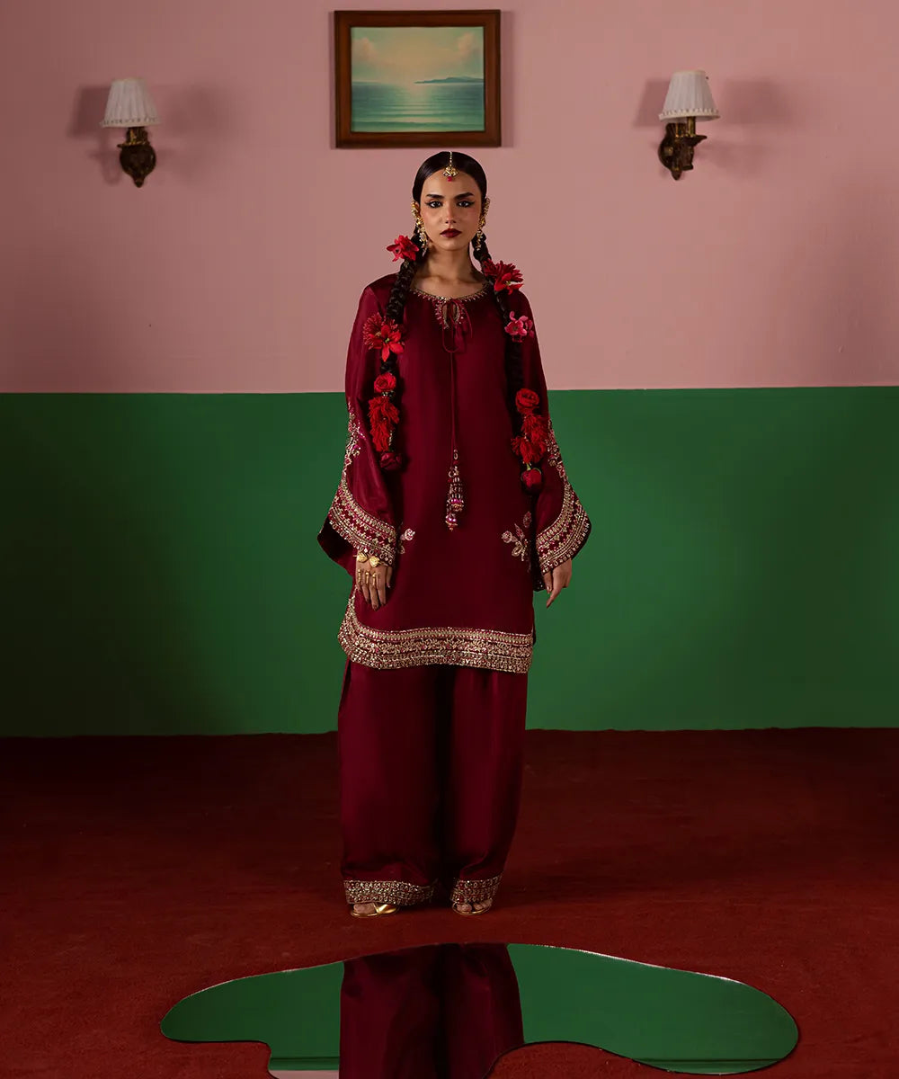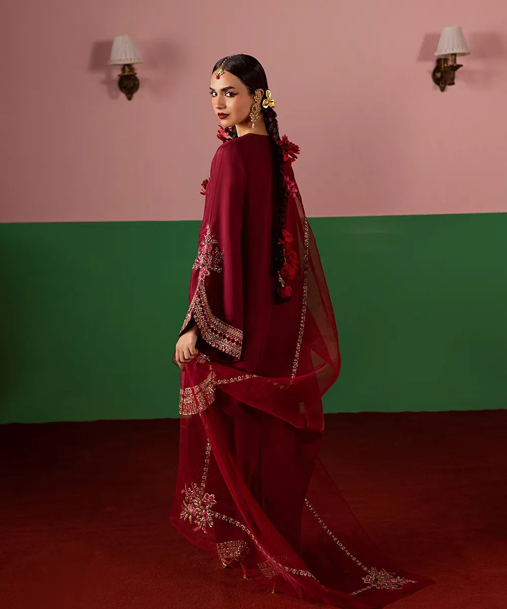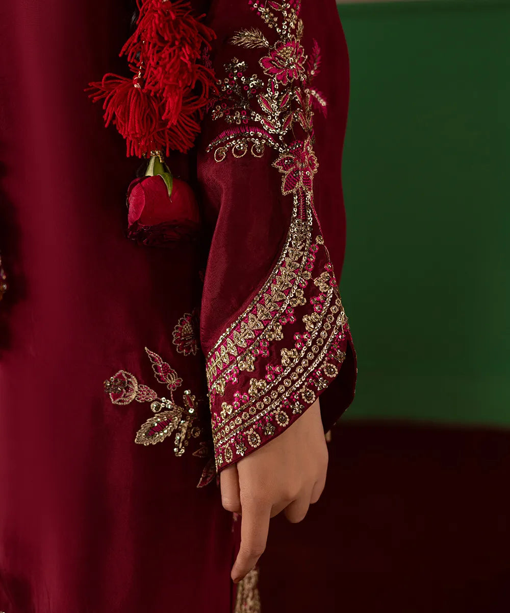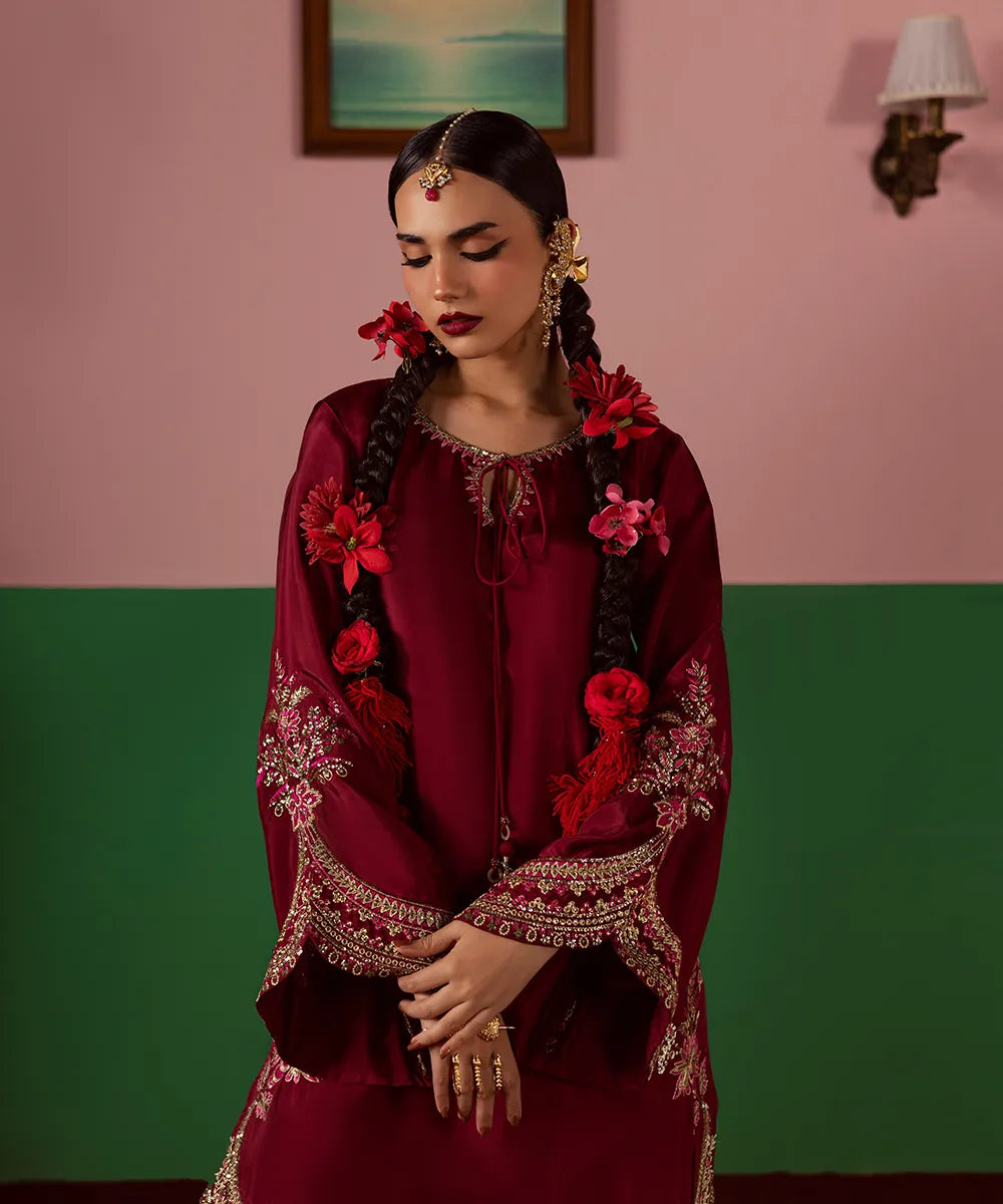 Exquisite craftsmanship adorns this maroon silk shirt, featuring intricate gold embroidery and sequins on the hem and sleeves. The look is completed with an organza dupatta and matching farshi shalwar.