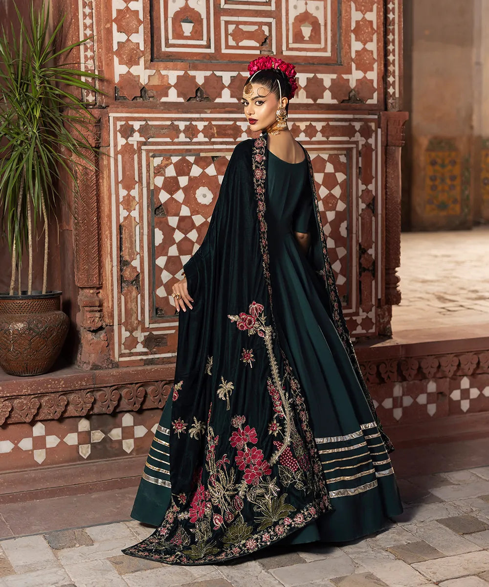 An emerald green pishwas in raw silk has a sweetheart neckline and gold lappa finishings on the border.