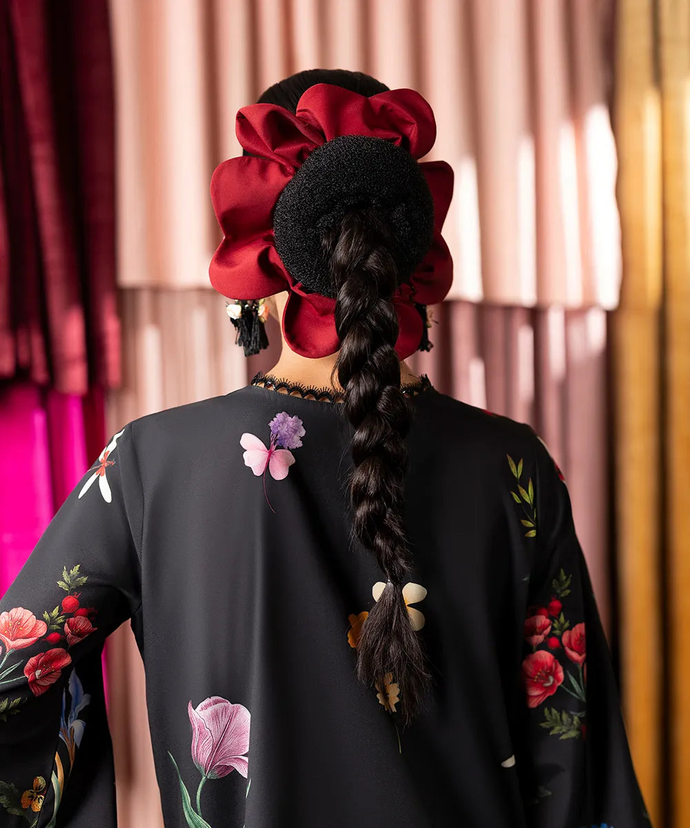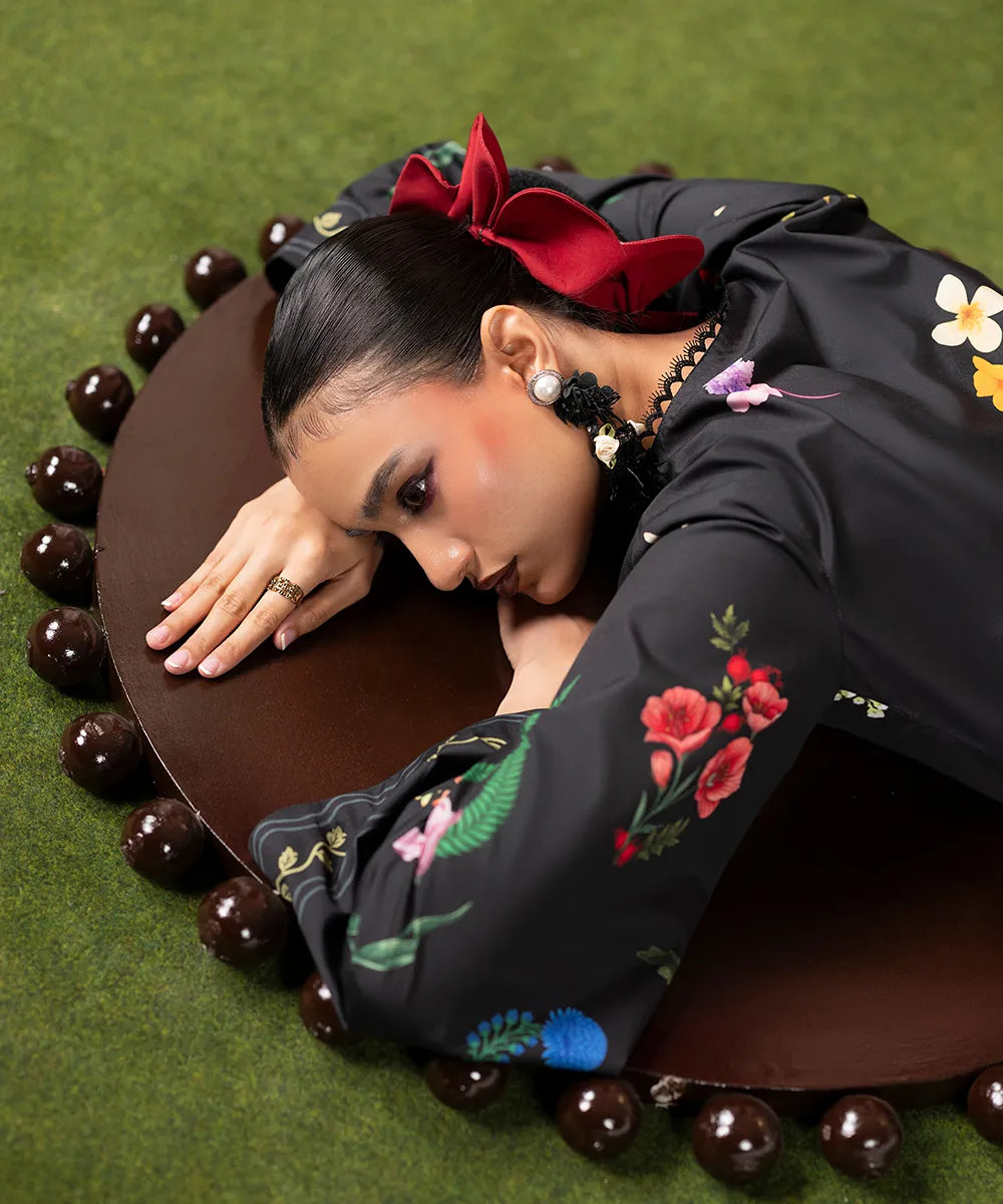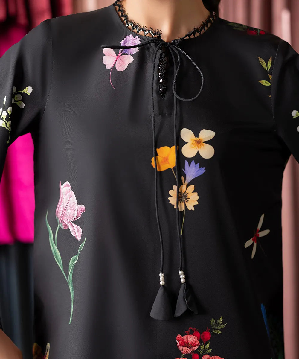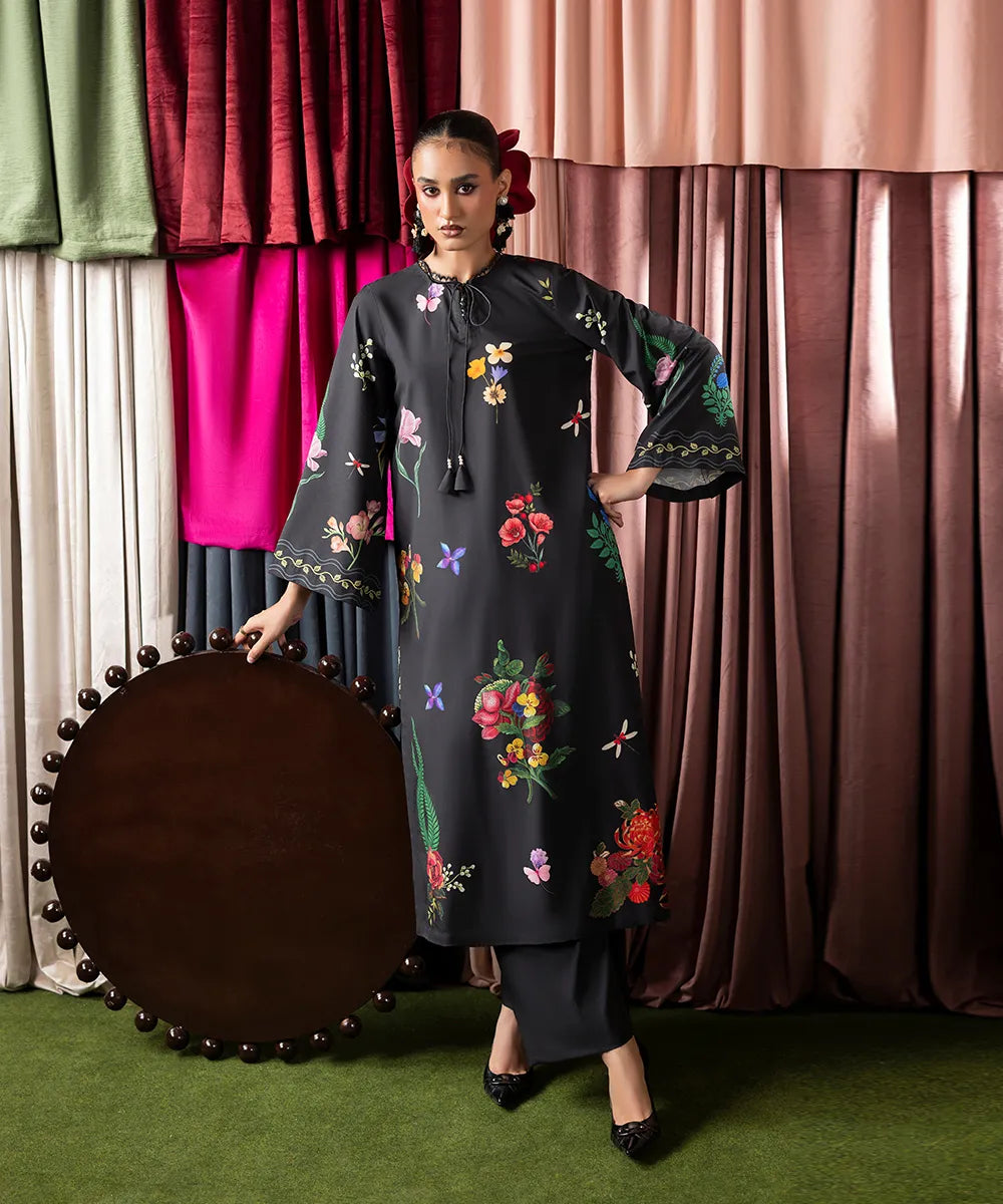 Embrace the beauty of this stunning black long shirt, crafted in crepe with a vibrant floral print featuring colorful flower bouquets. It is paired up with black flared trousers.