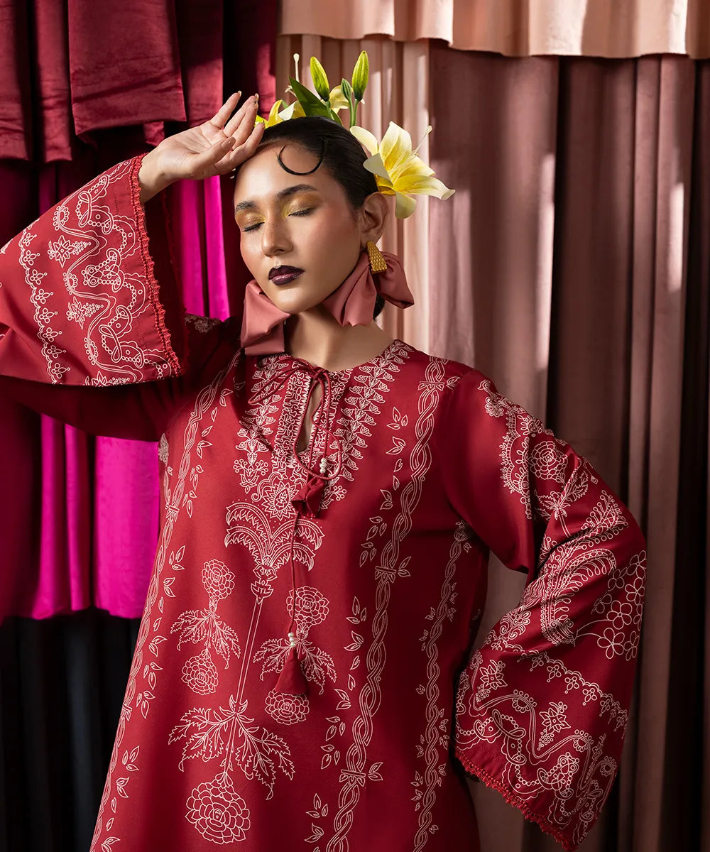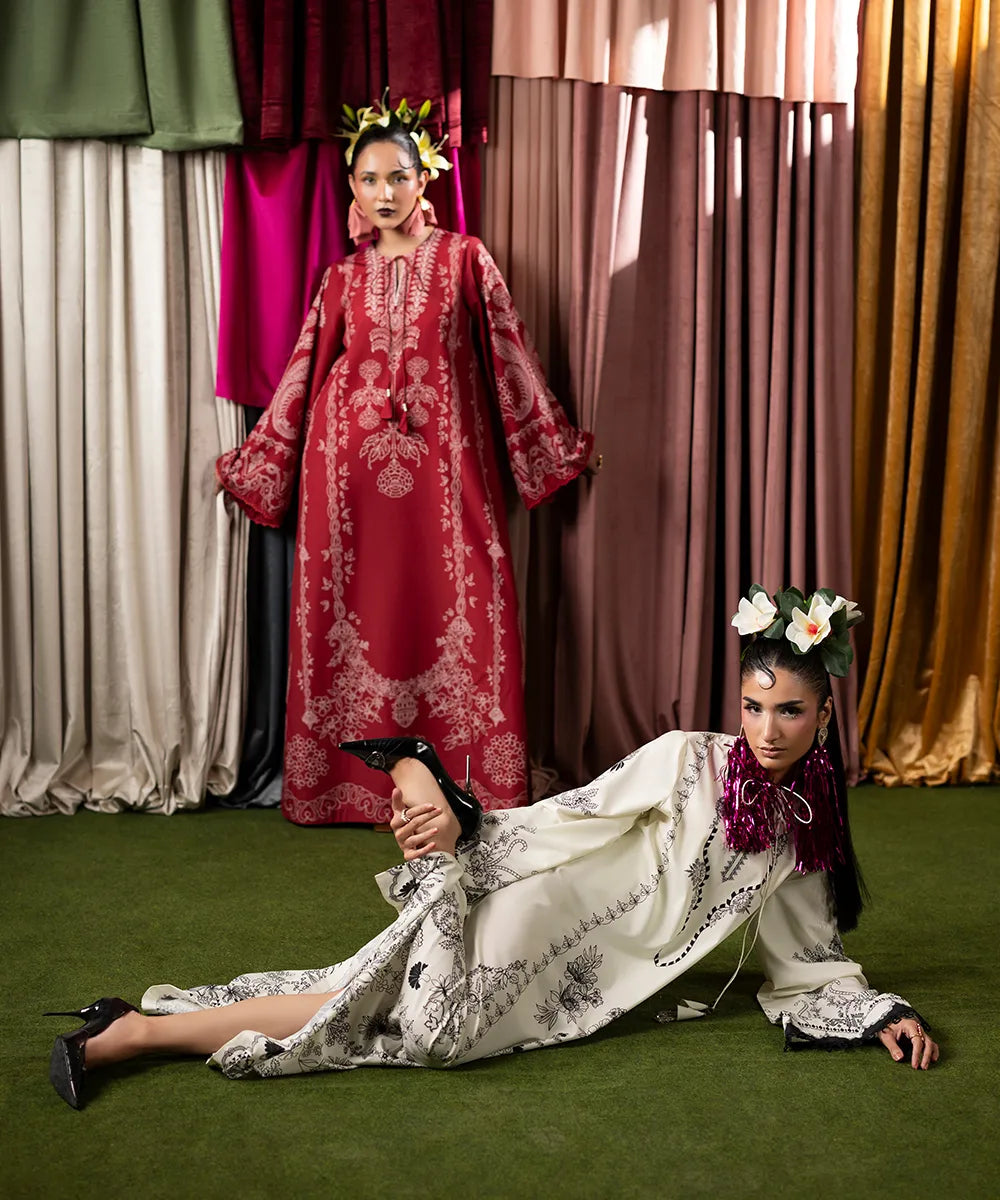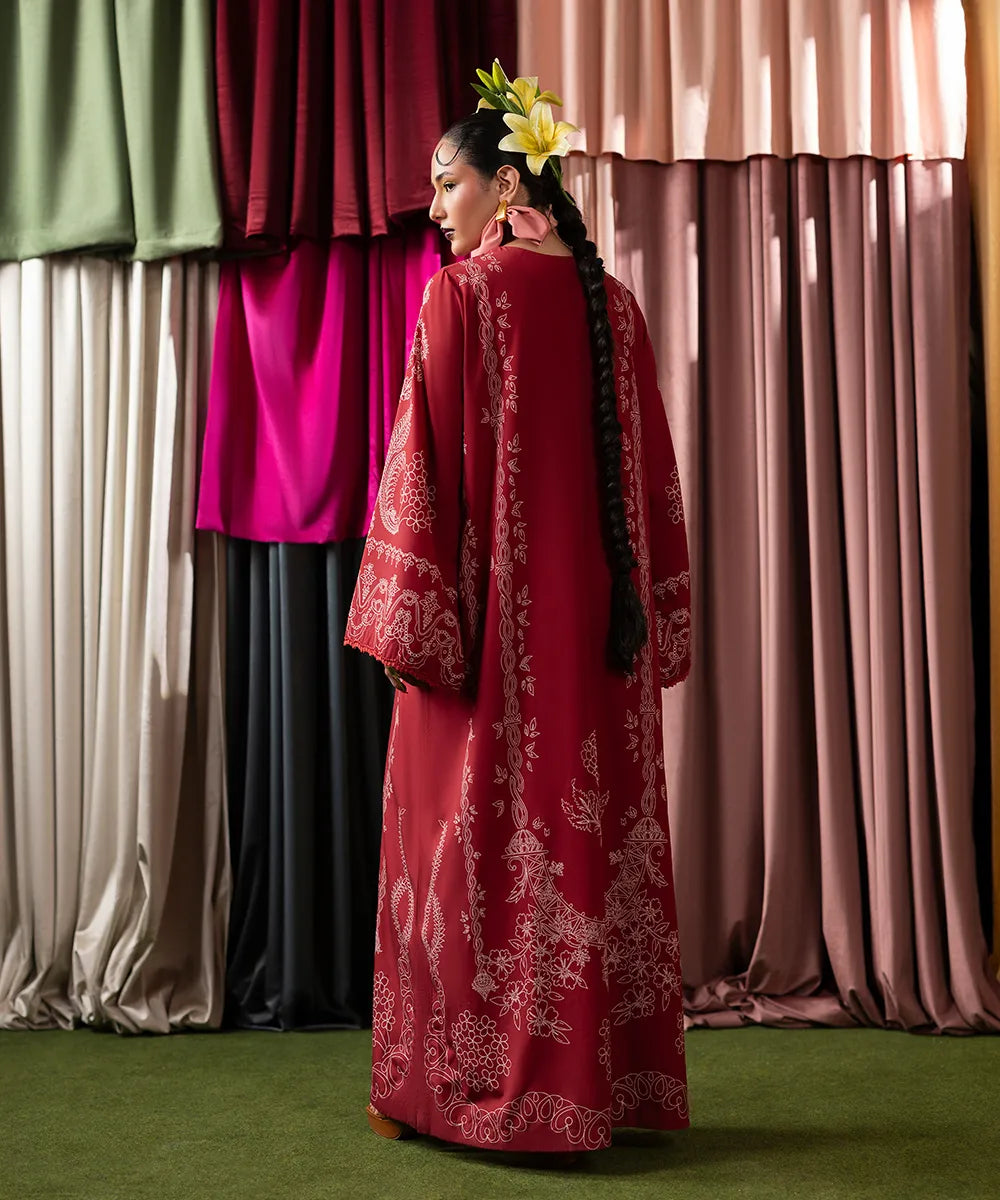 Wrap yourself in luxury in this stunning ruby red kaftan, crafted in crepe with a contemporary ivory print featuring lovely florals, meticulously woven like a poem.