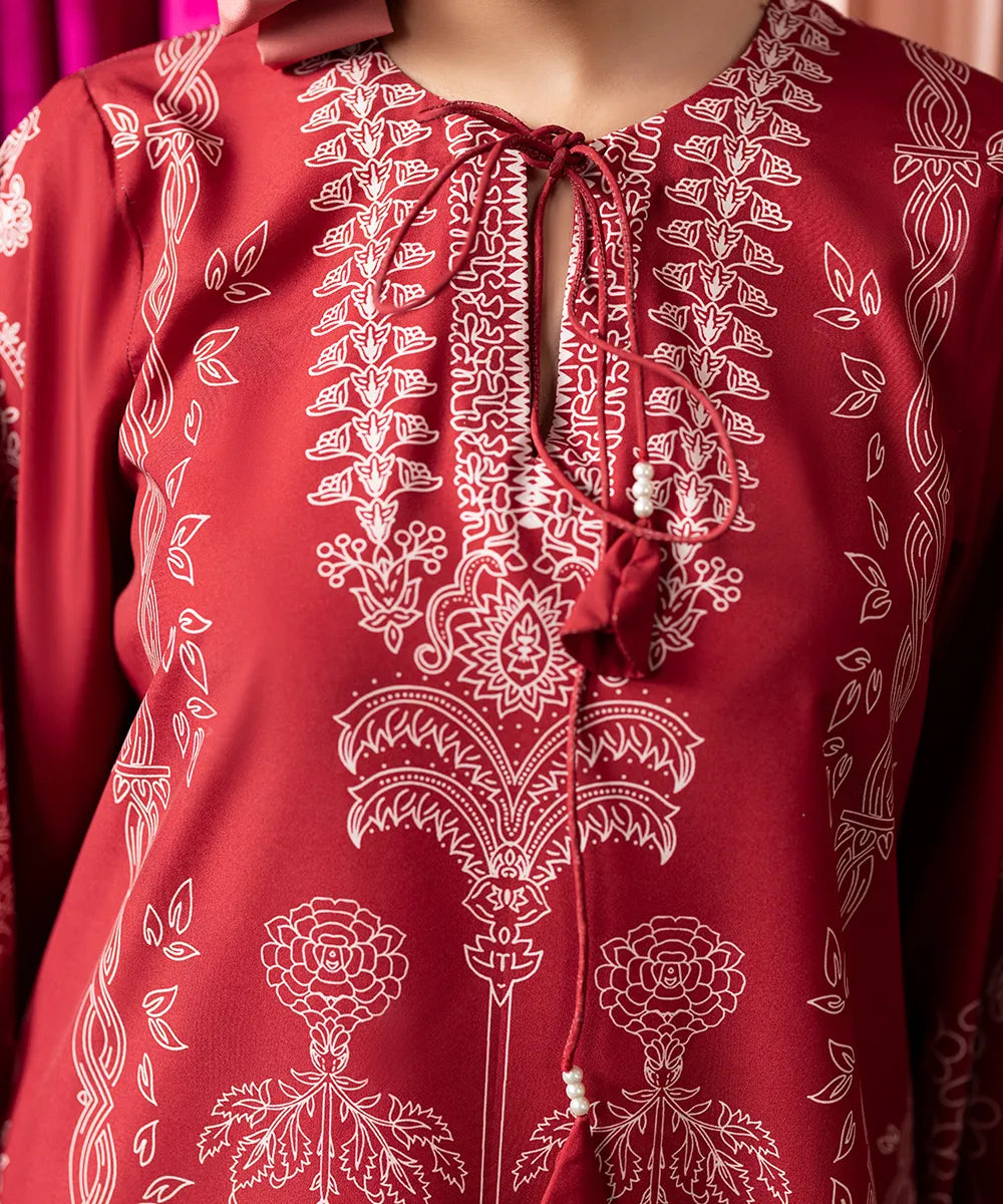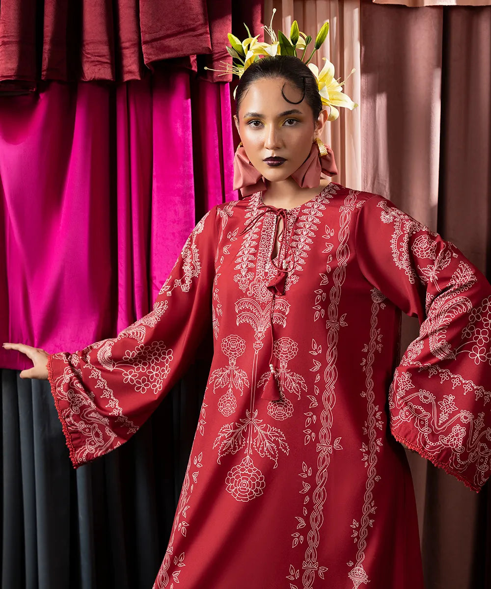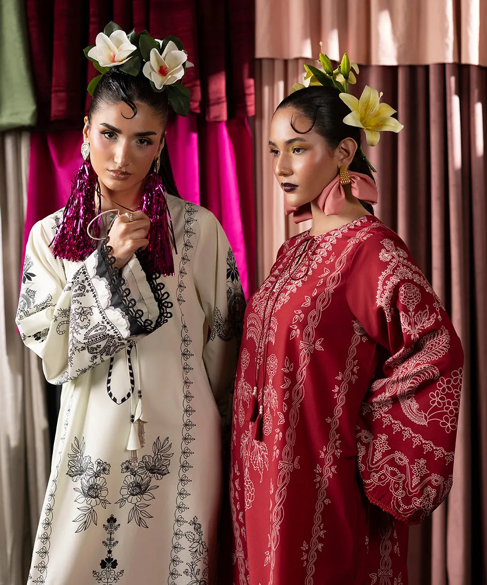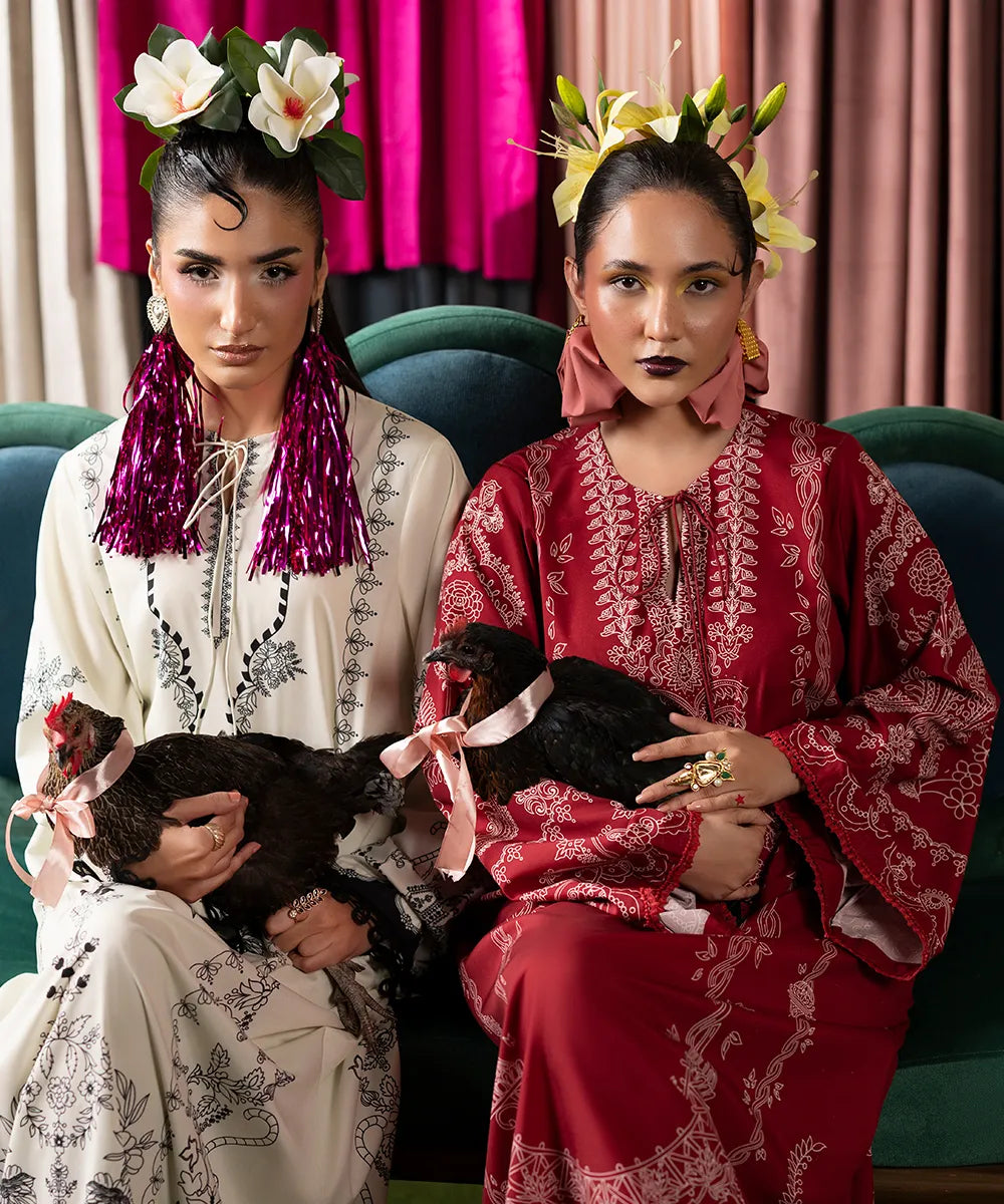 Wrap yourself in luxury in this stunning ruby red kaftan, crafted in crepe with a contemporary ivory print featuring lovely florals, meticulously woven like a poem.