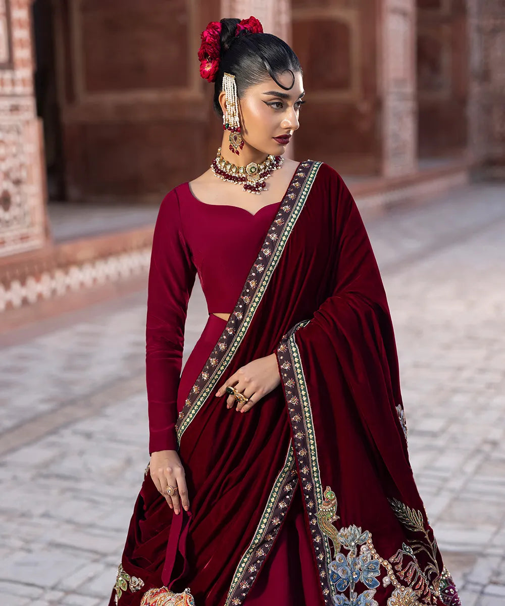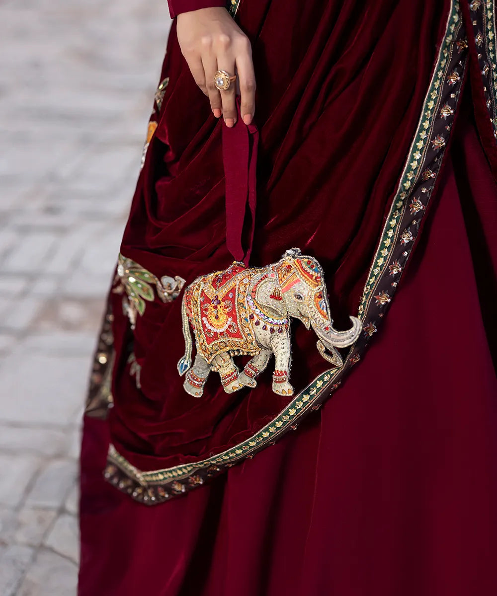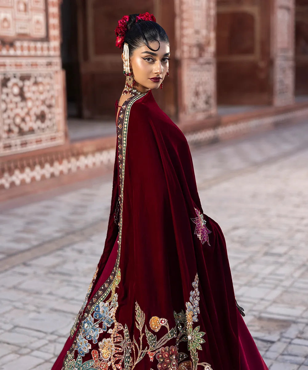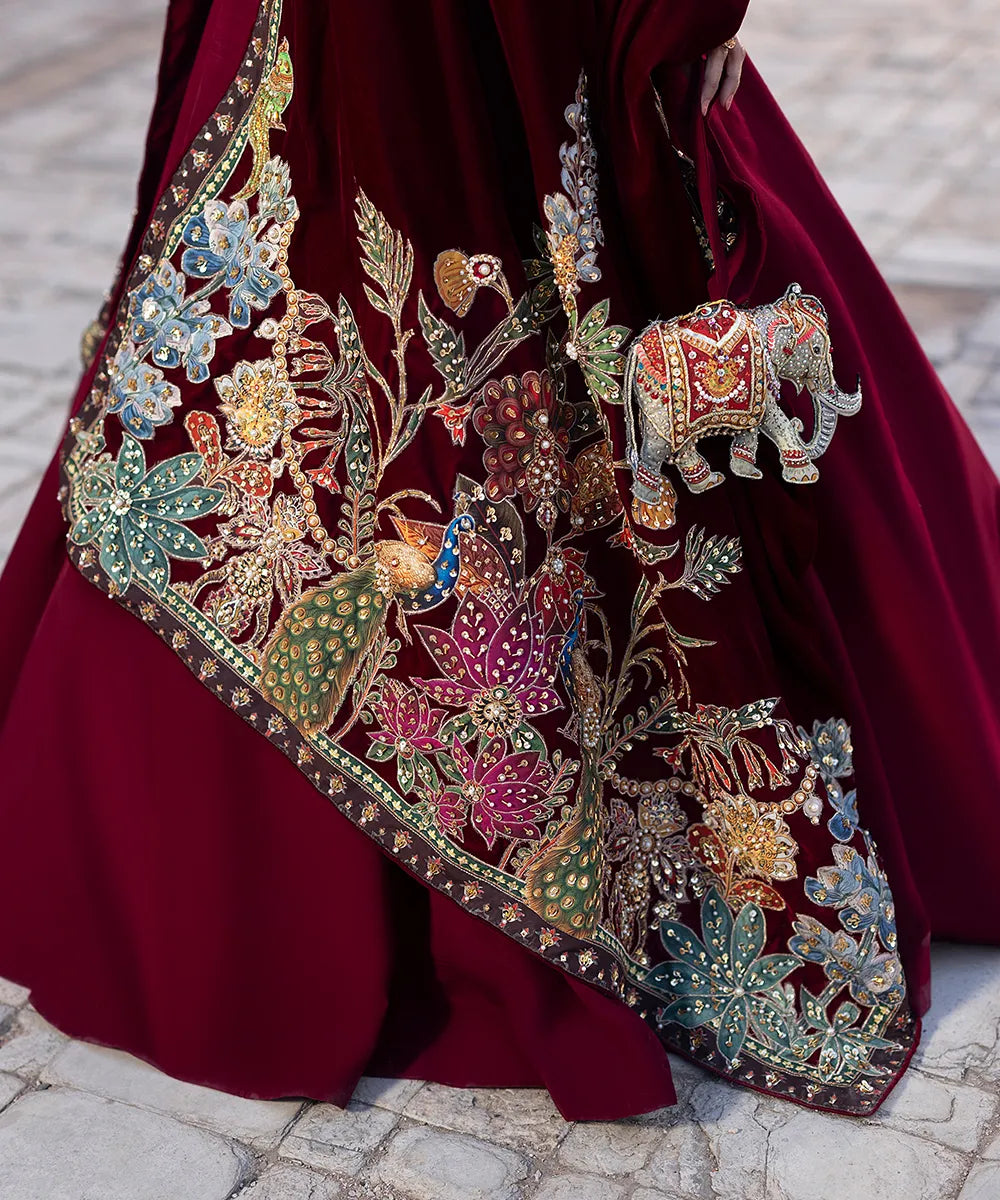A luxury hand-rendered shawl in maroon velvet serves as a base to hand embellishment. It is adroned with sequins and pearls all over.