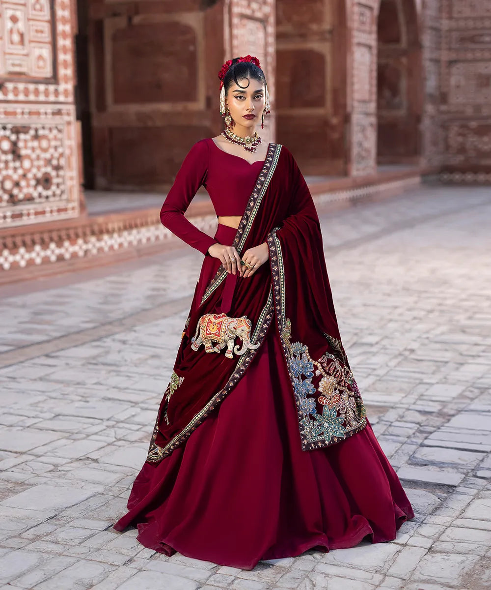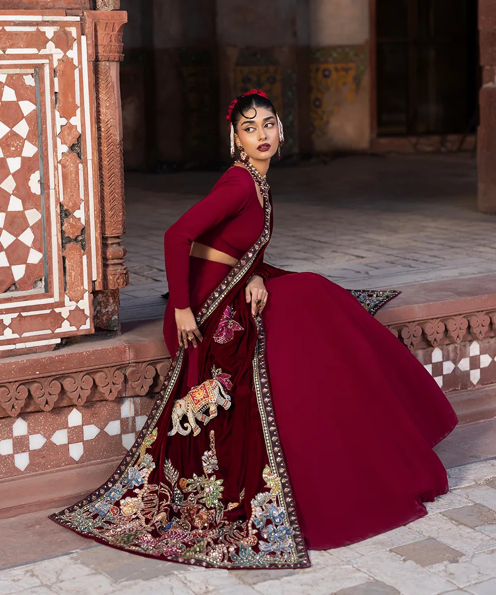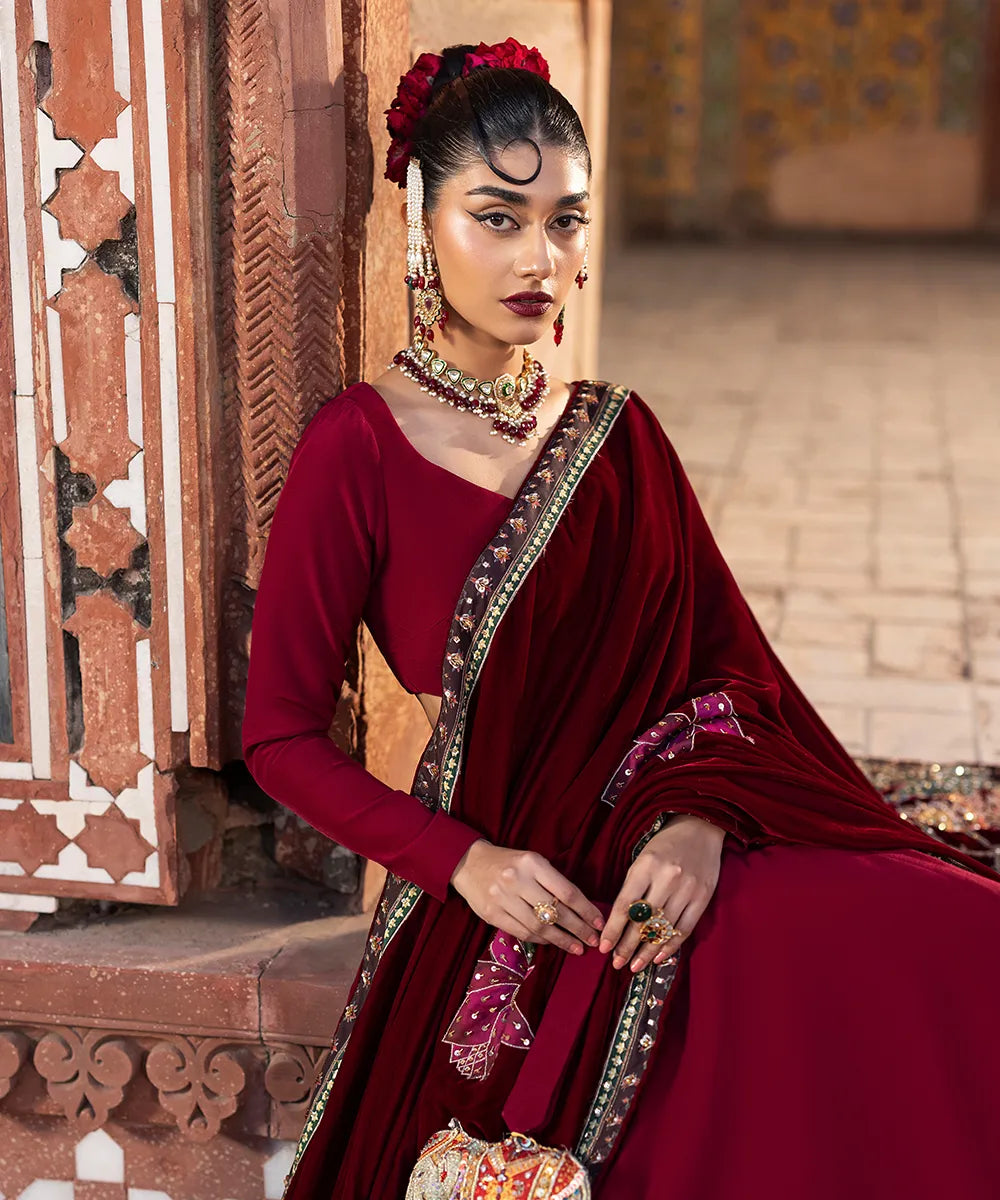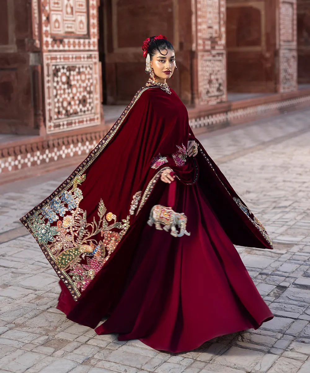 A luxury hand-rendered shawl in maroon velvet serves as a base to hand embellishment. It is adroned with sequins and pearls all over.