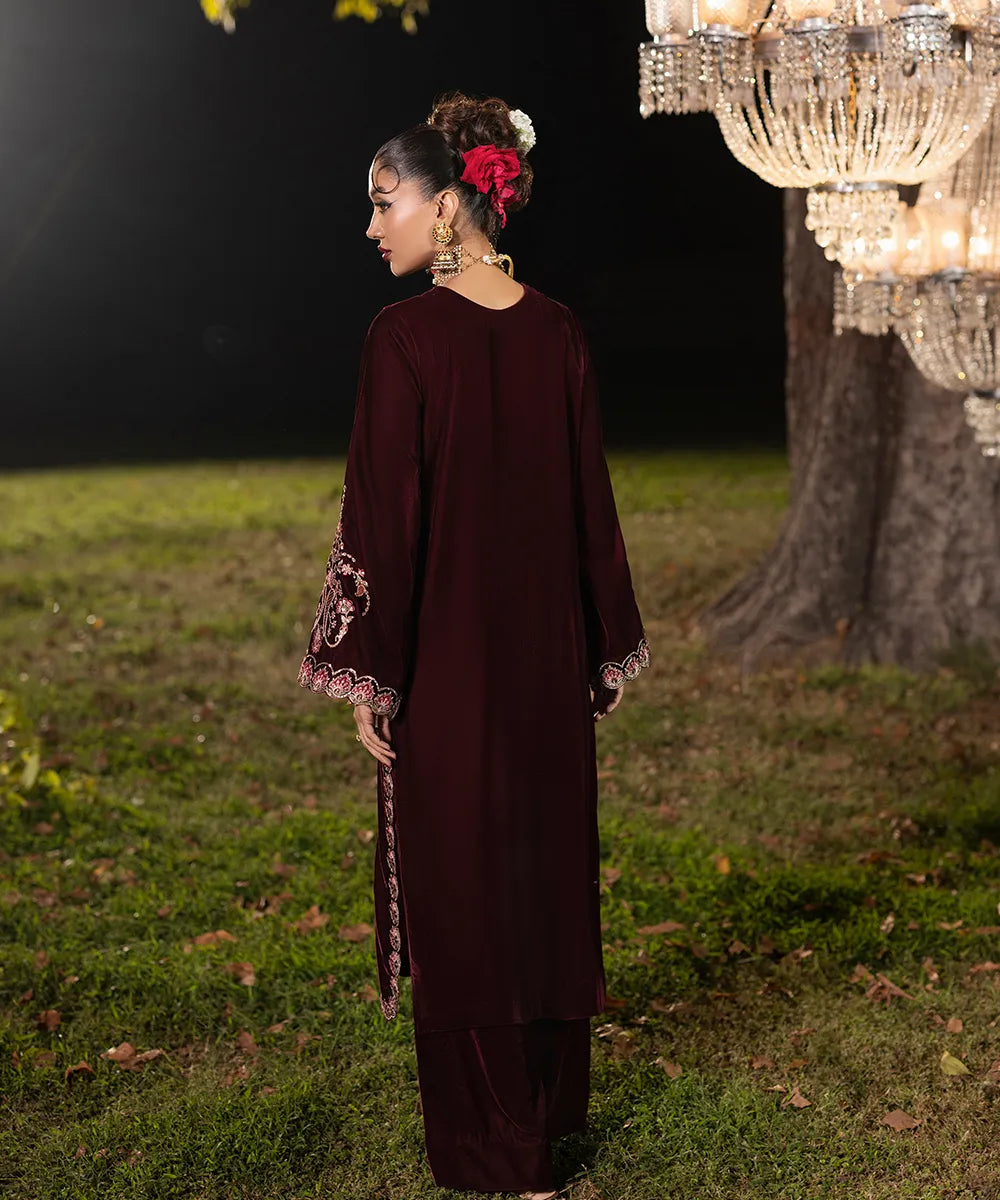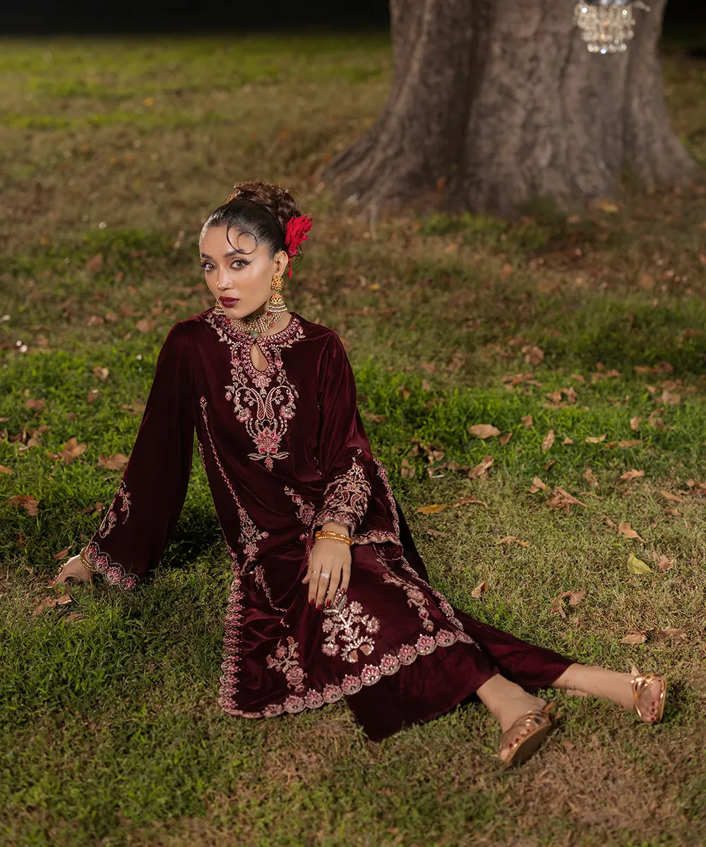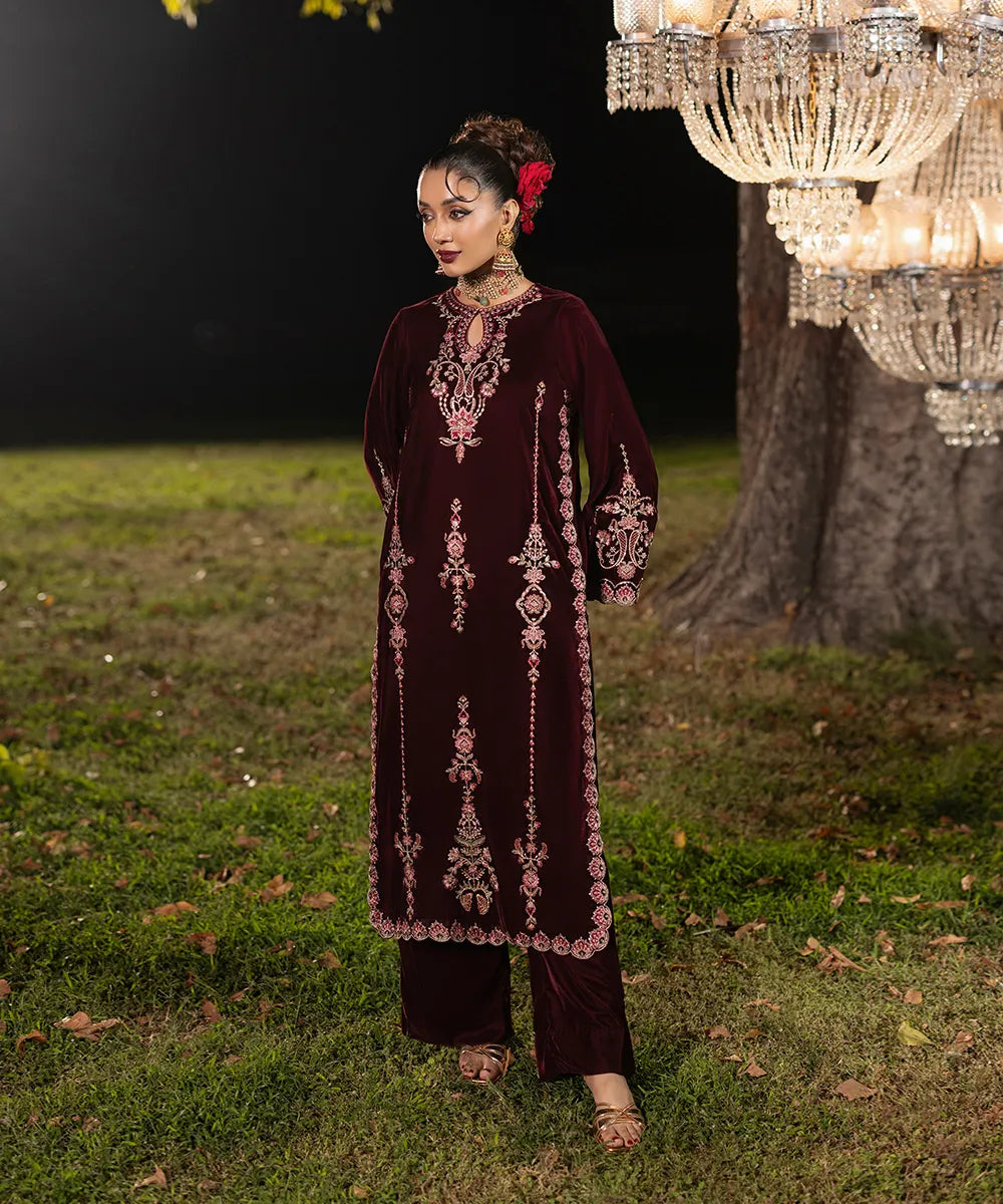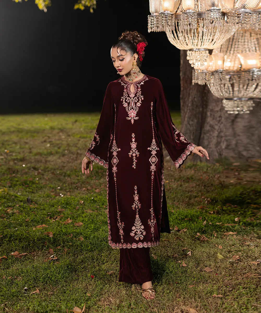 A burgundy canvas in luxury velvet serves as a base to meticulously designed embroidery on the neckline and sleeves. The front has vines running down in multi-colored threads adroned with gold sequins. It is paired with velvet straight trousers in burgundy.