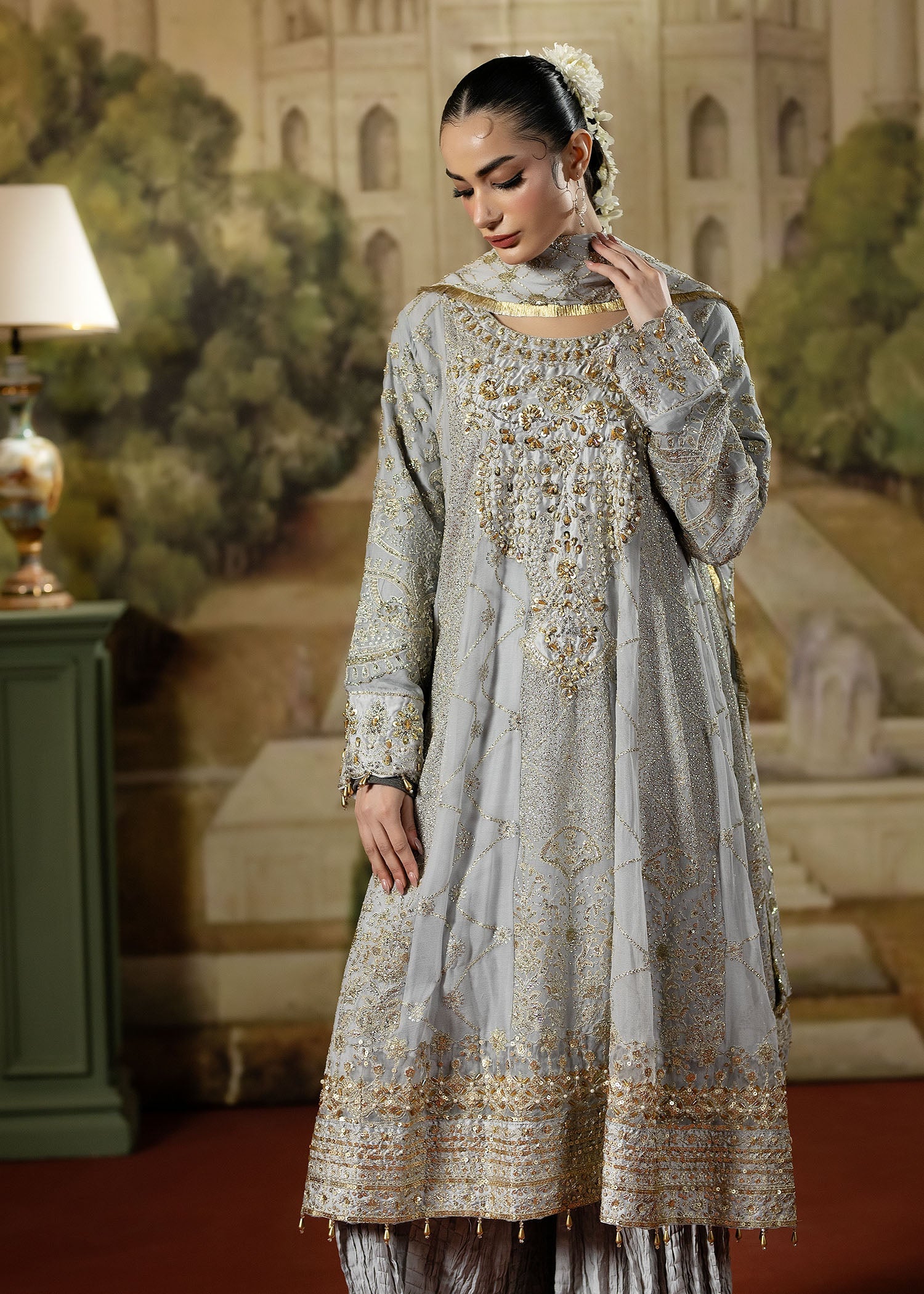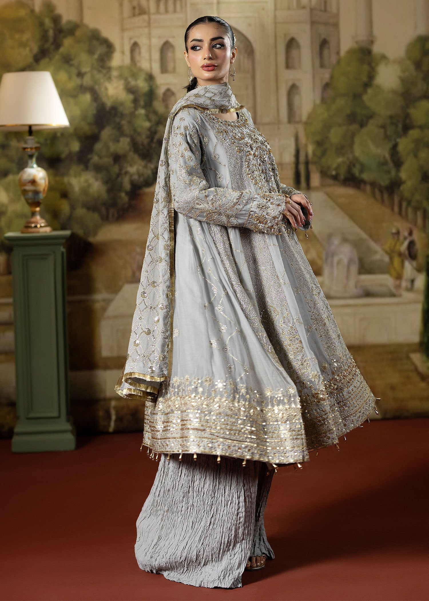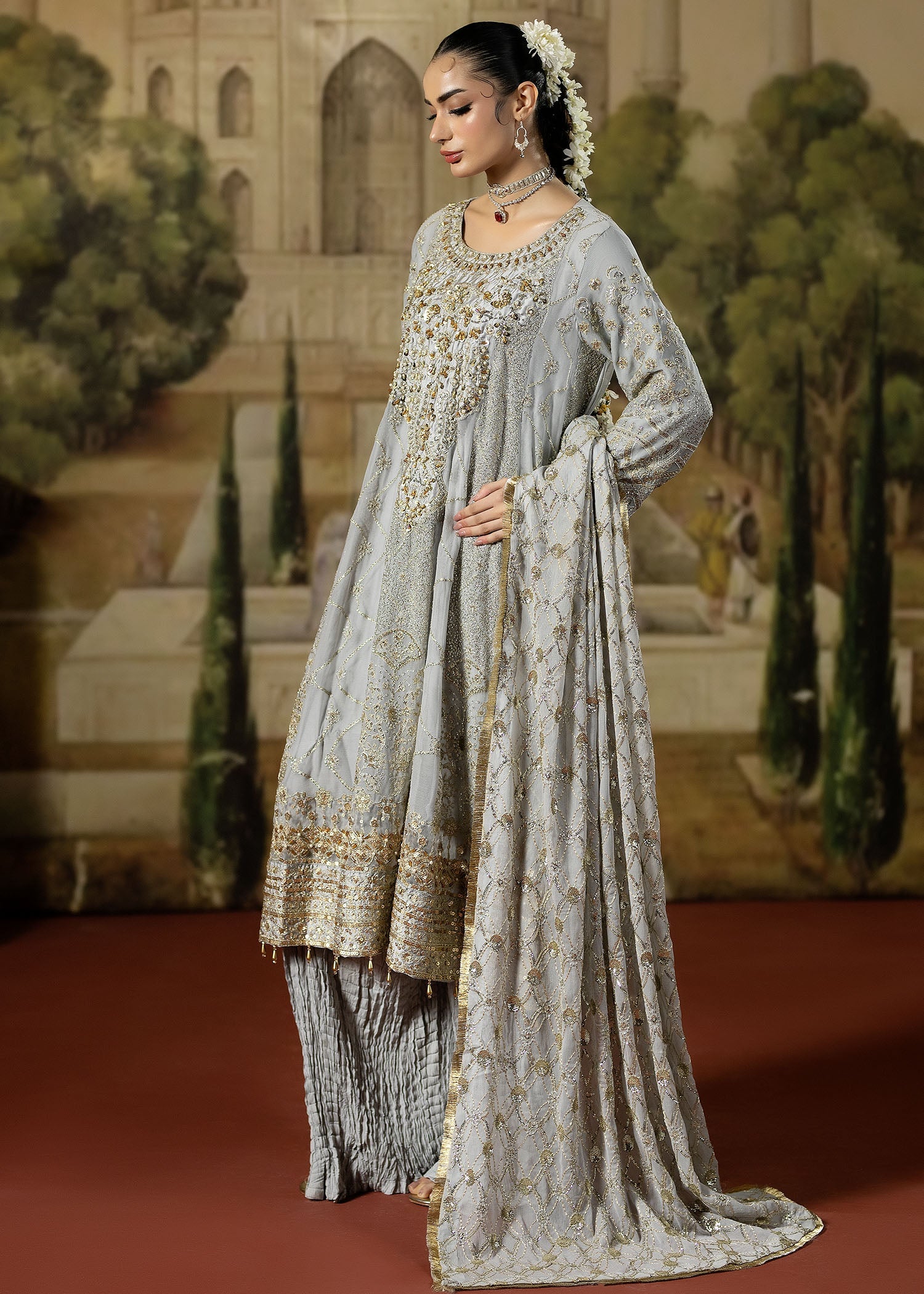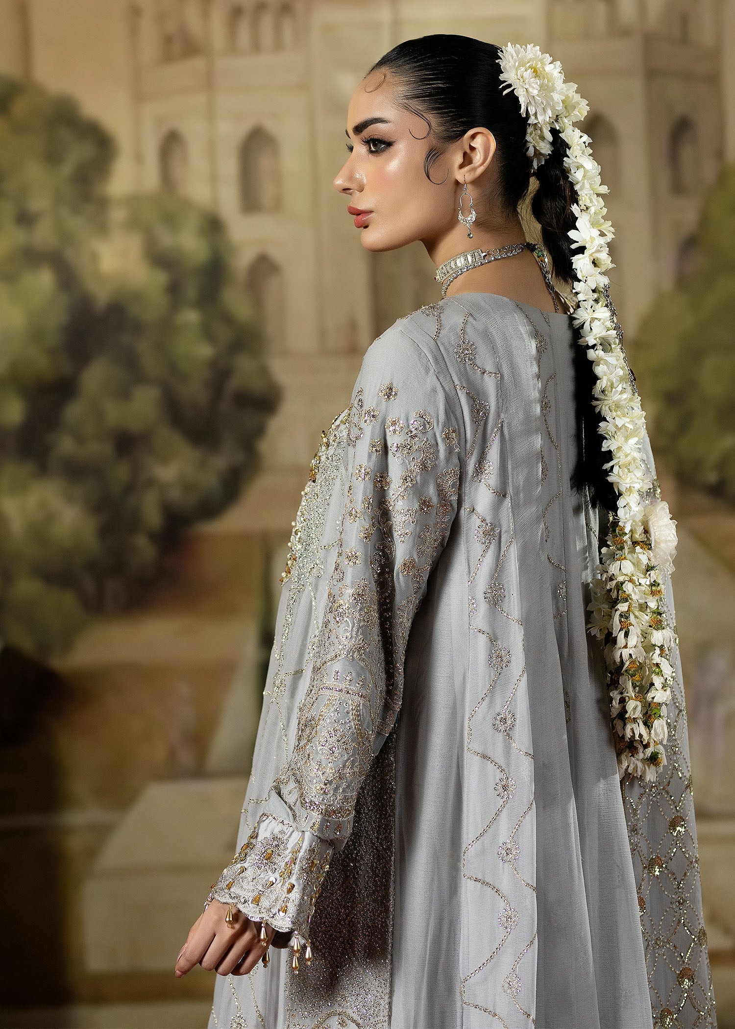 Pishwas Frock: Embroidered chiffon with handmade adda work on the neckline, finished with an embroidered silk border on the frock hem. Embroidered chiffon sleeves with an embroidered silk border.