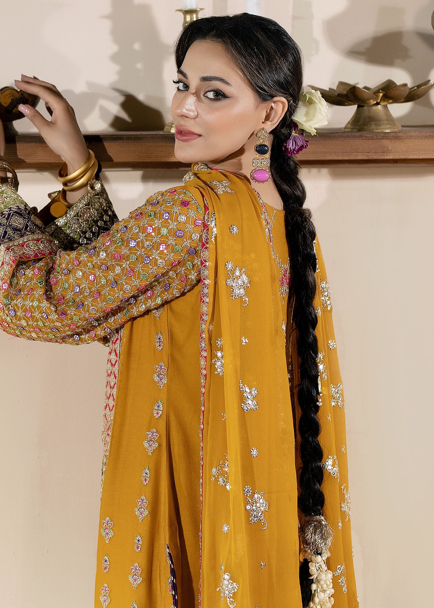 Gracefully detailed in chiffon, this embroidered shirt features a delicately foil-worked neckline and an embroidered silk patch at the daman. The embroidered sleeves add refinement with intricate artistry. Paired with an embroidered chiffon dupatta finished with a silk embroidered border and a PK raw silk plazo for a polished, timeless look.
