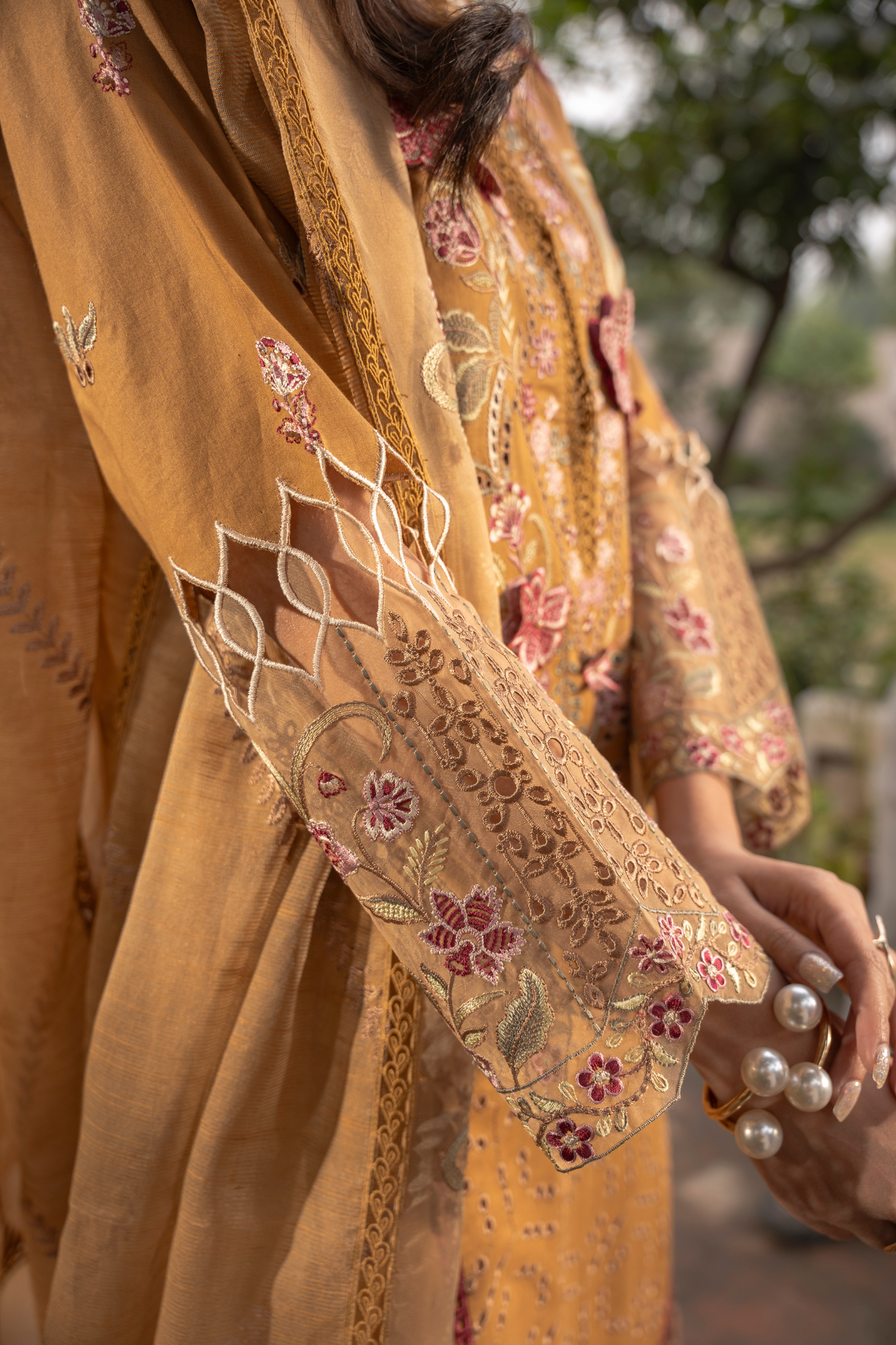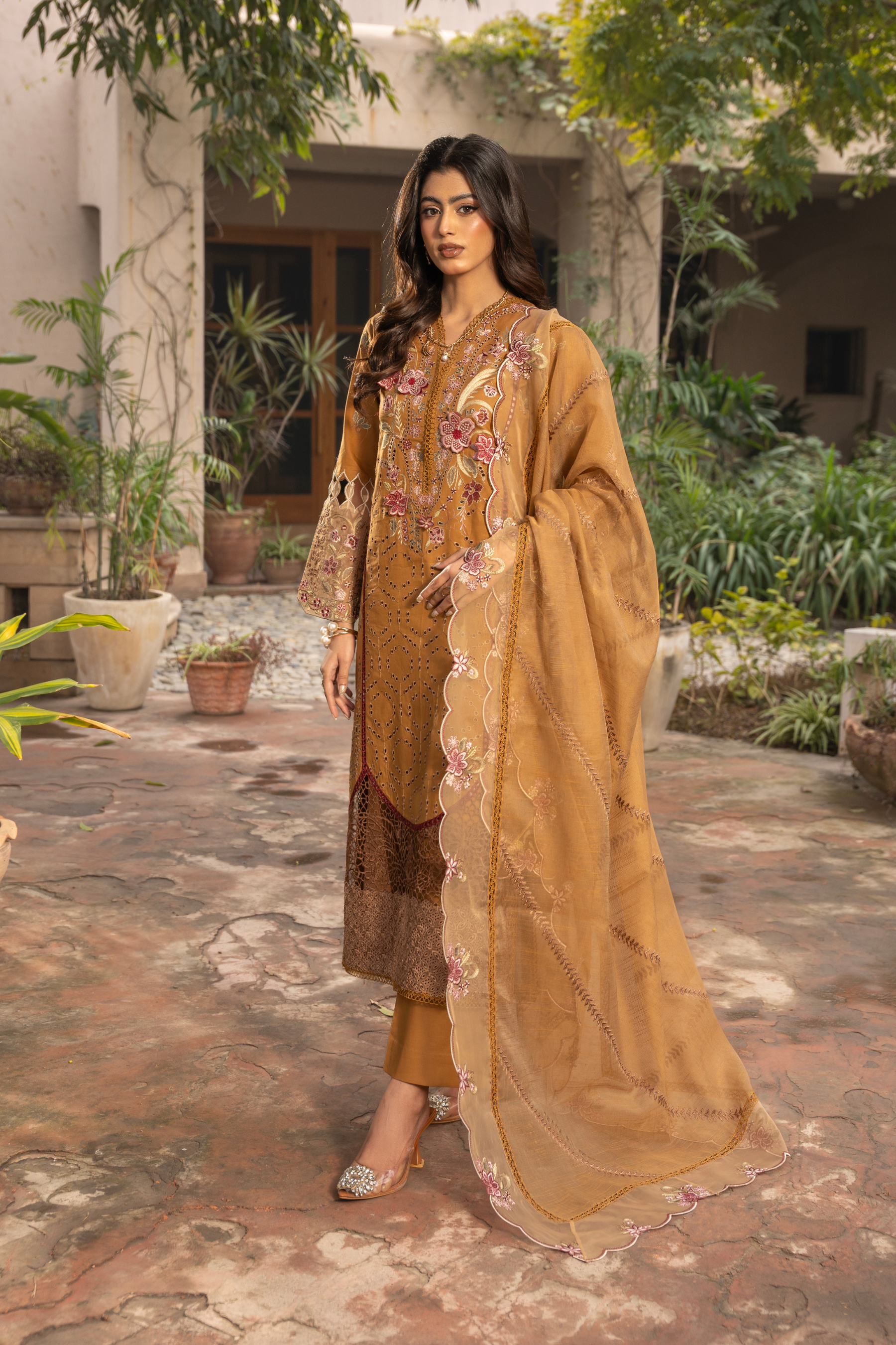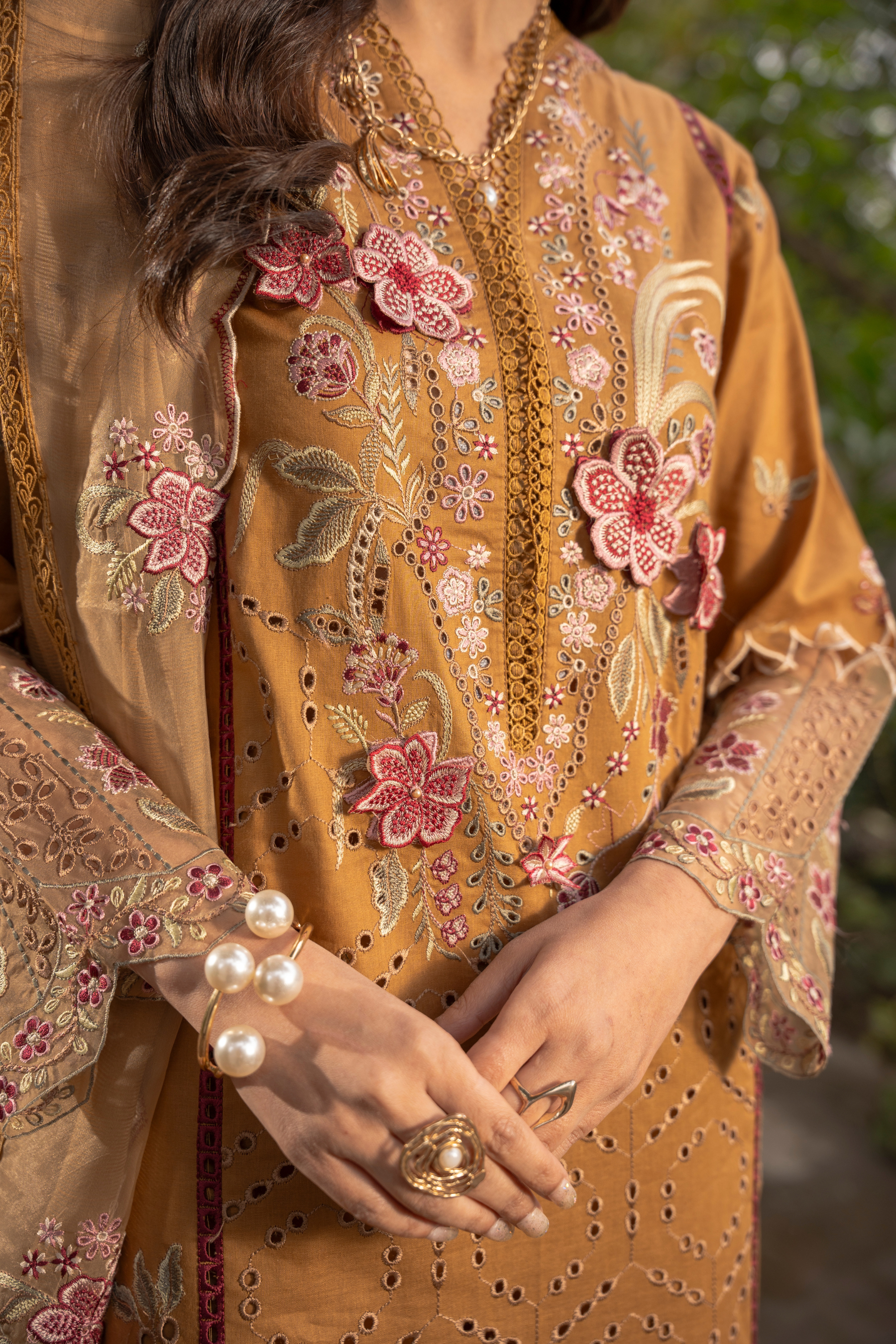 Embroidered khaddi net four-sided border ready dupatta measures 2.5 yards.