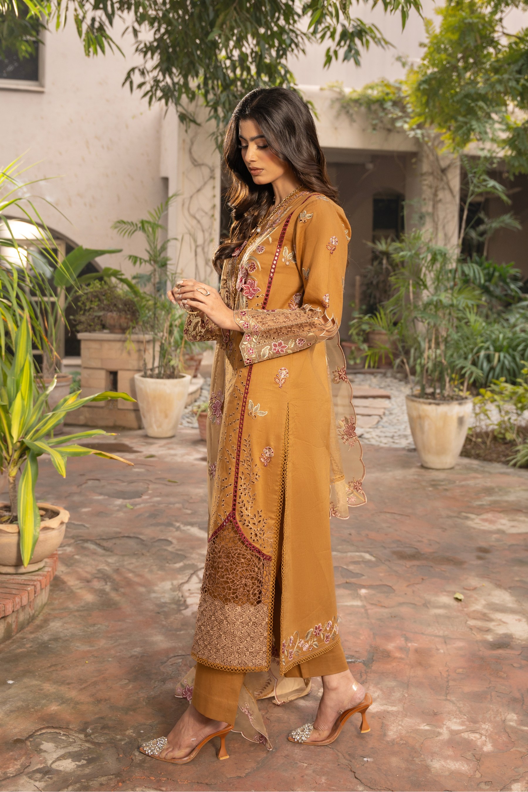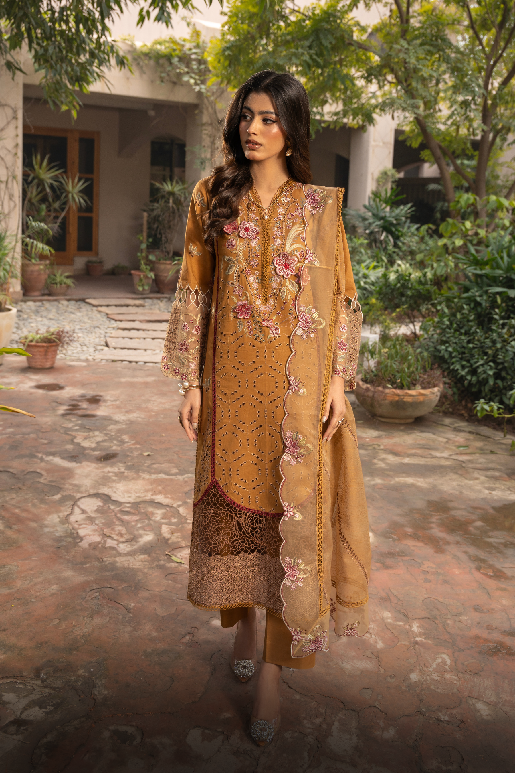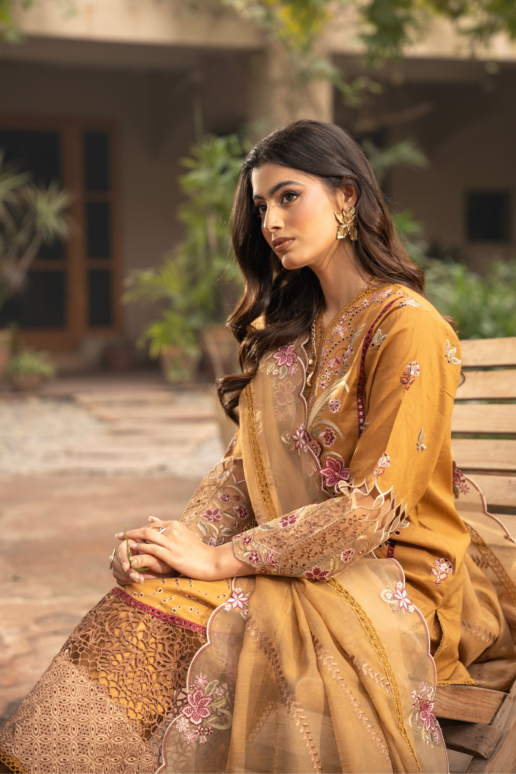 Embroidered khaddi net four-sided border ready dupatta measures 2.5 yards.