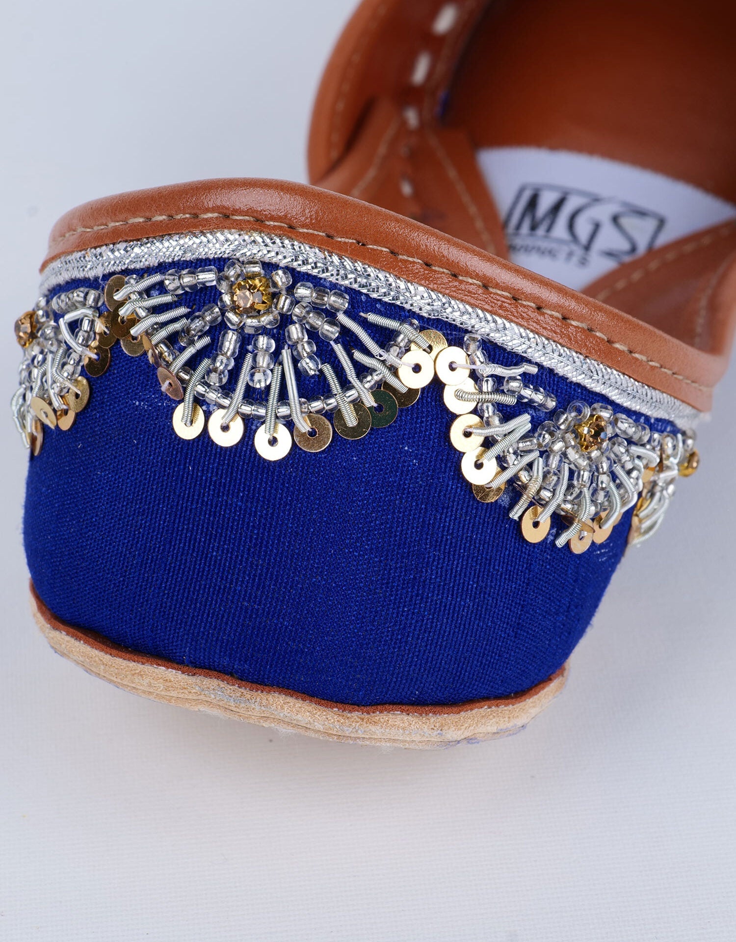 A striking royal blue base complemented by evenly spaced white floral thread motifs. This pair combines tradition with a pop of color, the back is accented with ornate silver embellishments, making it ideal for brides or anyone wanting a sophisticated, understated festive look.