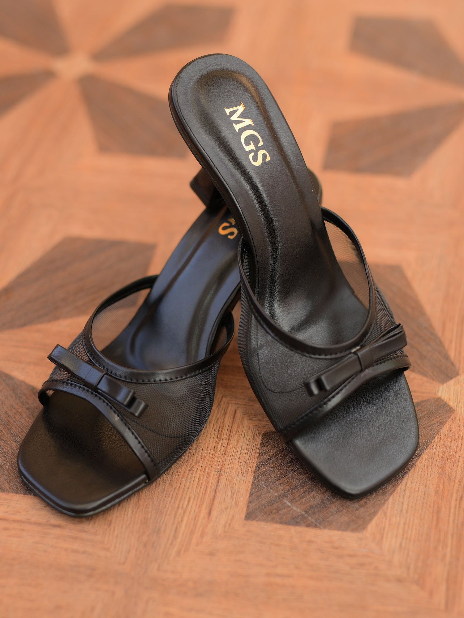 finesse. Featuring a sleek black mesh upper, tastefully accented with minimalist bows and set on an elegant mid-heel, this design exudes understated luxury.