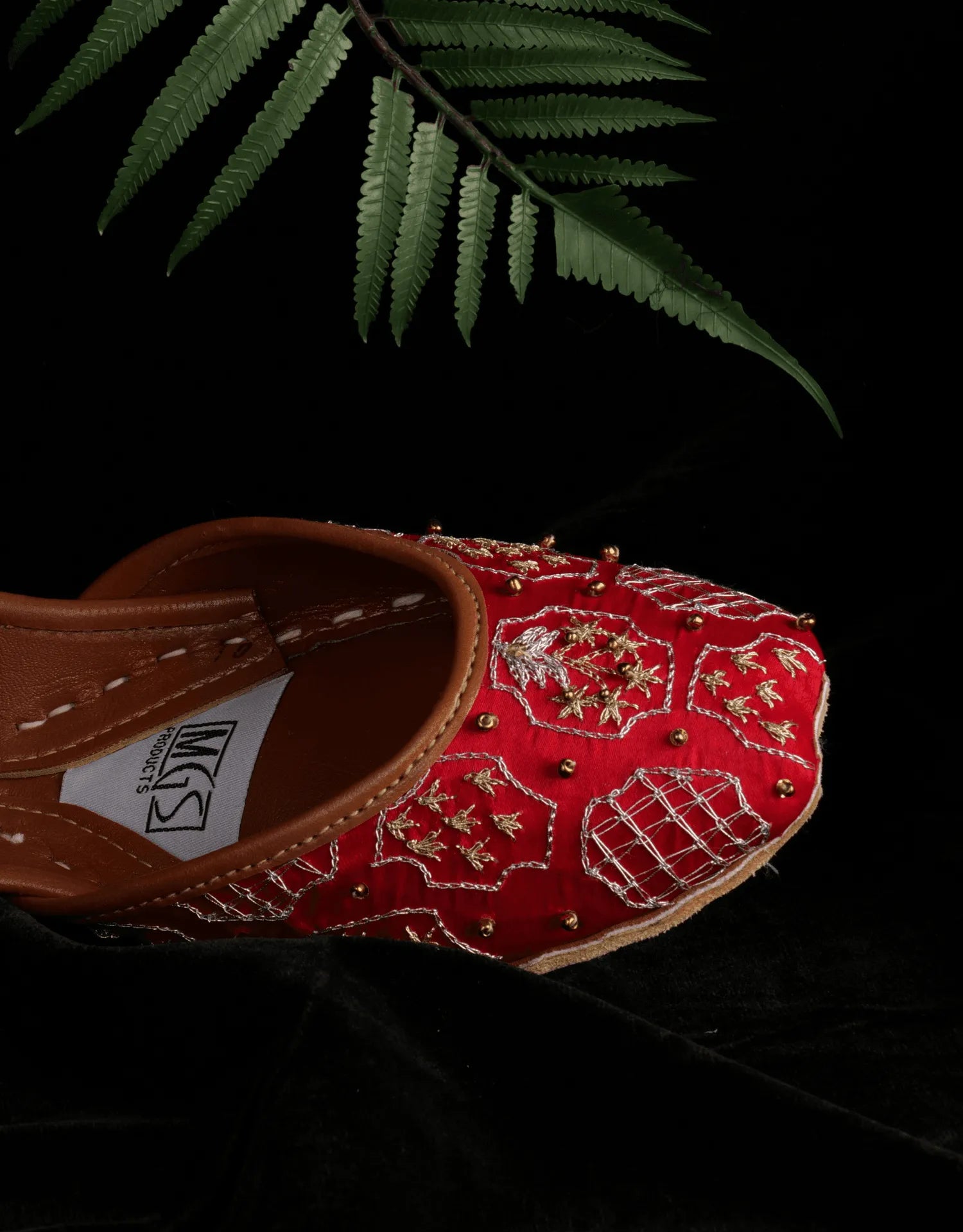 A stunning traditional pair crafted on vibrant red fabric, this Khussa is beautifully adorned with intricate golden thread and mirror work. The mix of floral and geometric patterns makes it perfect for festive occasions or weddings, adding a regal charm to any outfit.