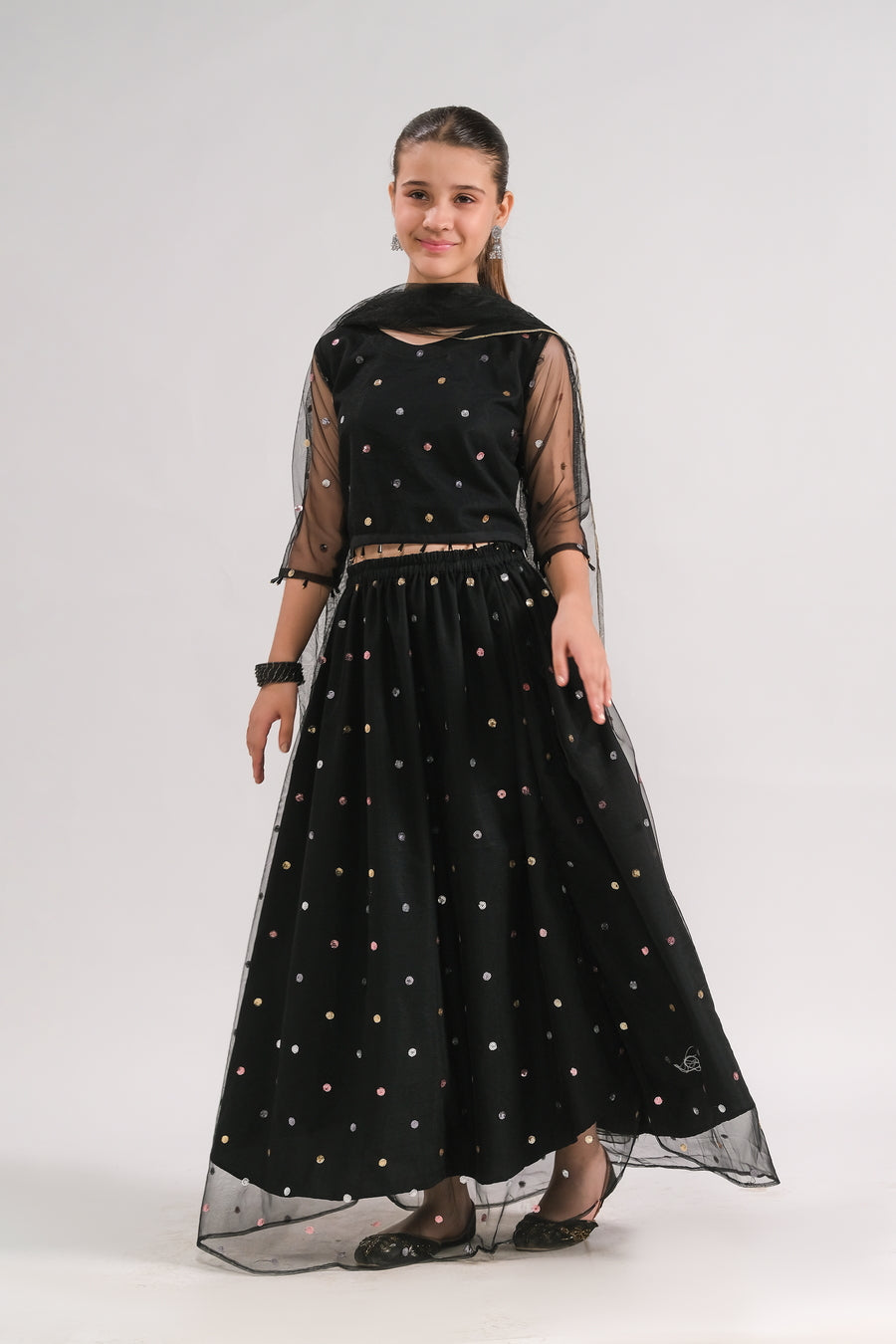 Elegance meets mystique in Midnight Bloom?a graceful black ensemble that embodies the beauty of the night sky sprinkled with twinkling stars. Adorned with delicate, colorful sequin embellishments, this outfit captures the essence of a midnight garden in full bloom. The sheer sleeves and dupatta add a touch of ethereal charm, making it perfect for festive occasions, formal gatherings, and celebratory events.
