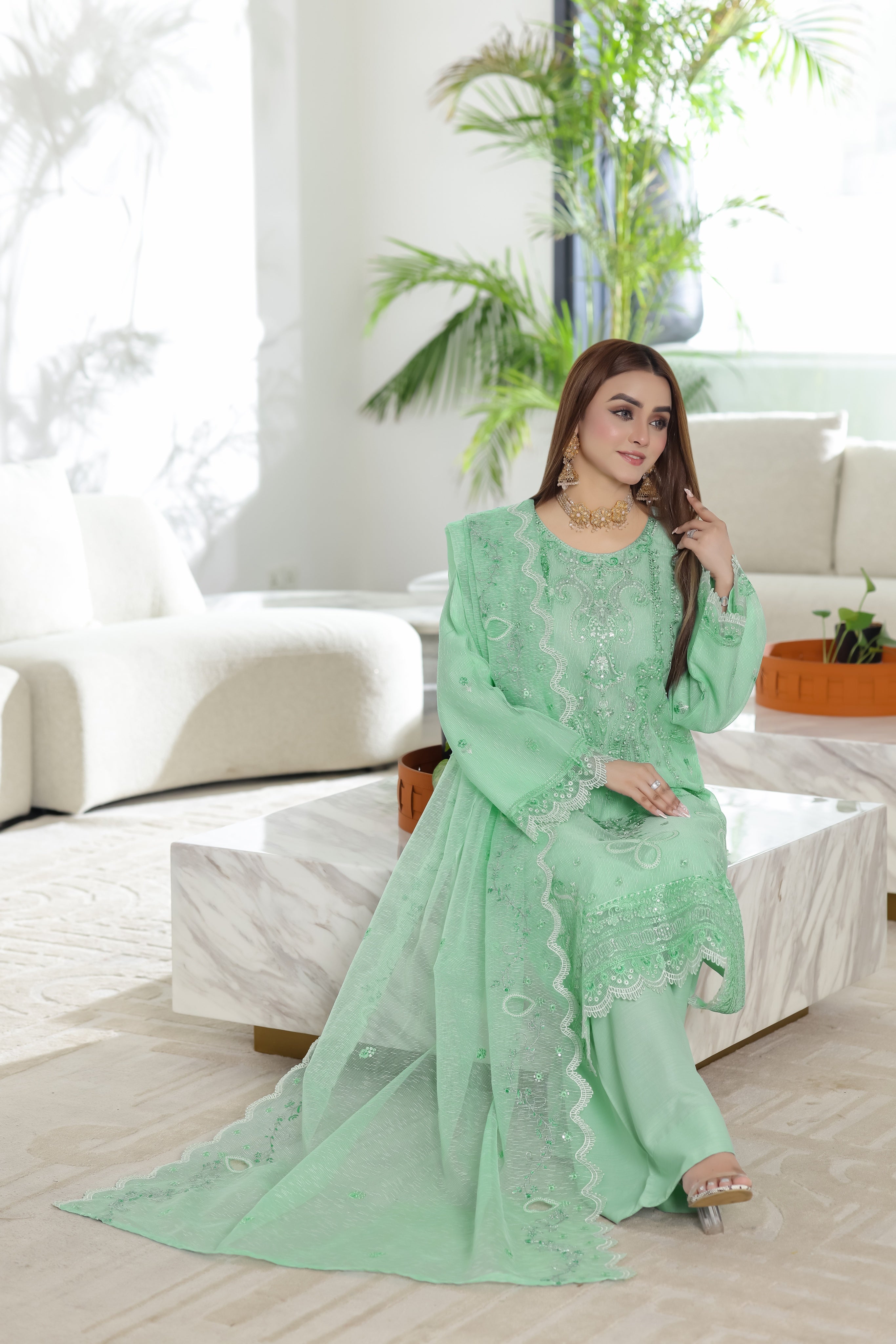 Each 3-piece set includes a semi-stitched luxury embroidered Ayudhiya Net shirt, a premium embroidered Ayudhiya Net dupatta, and a PP viscose trouser for a smooth, graceful finish.
