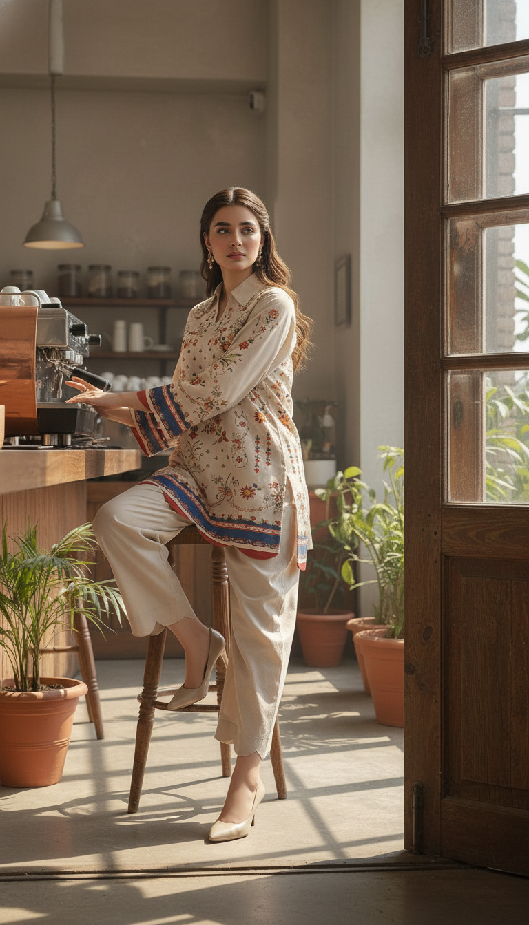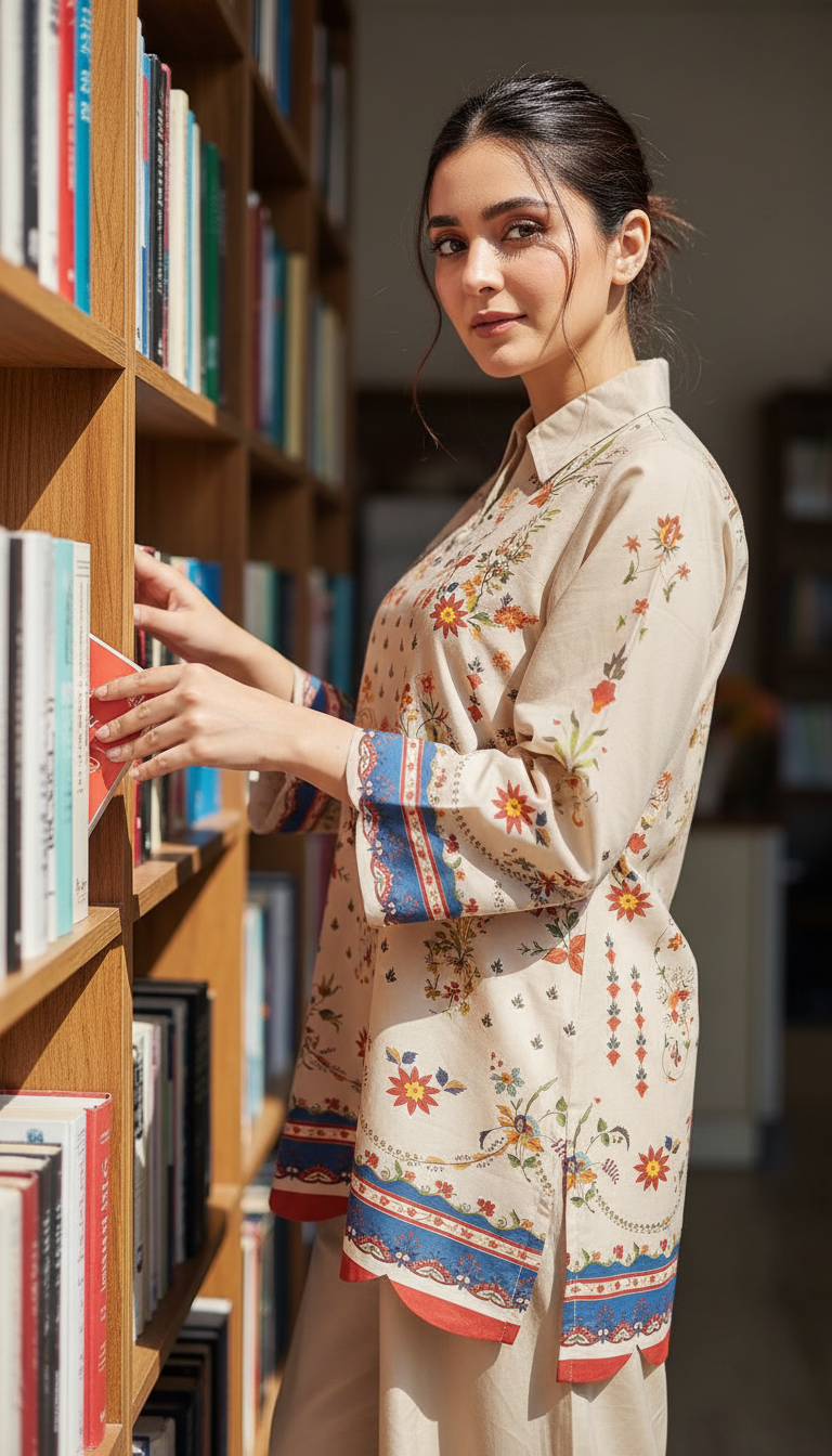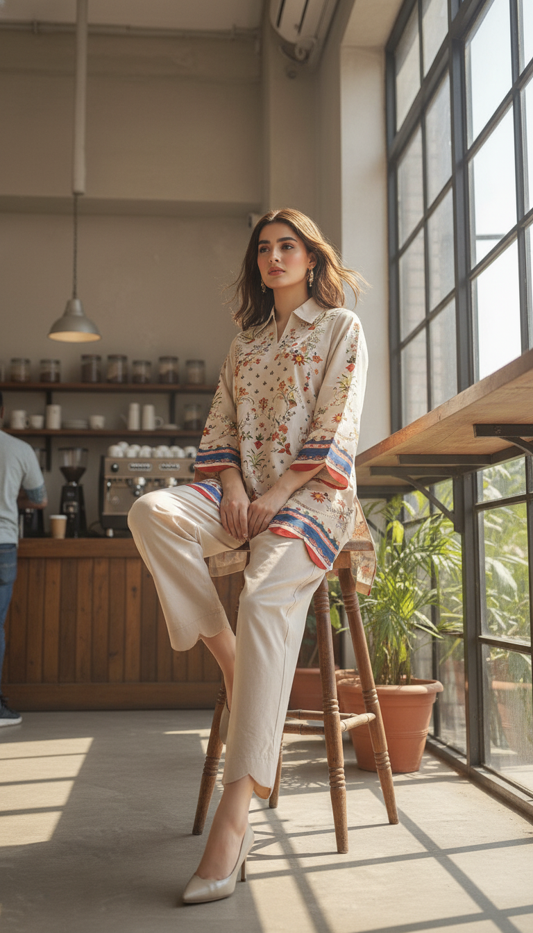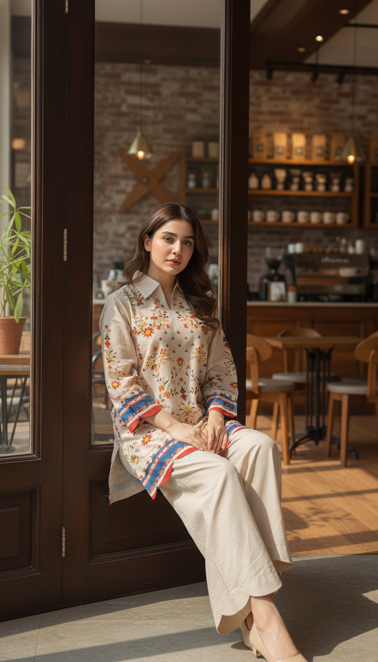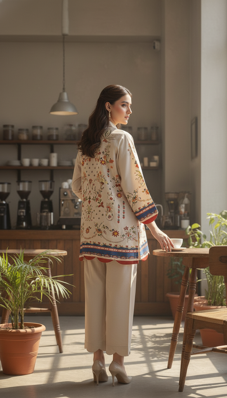 Step into timeless elegance with this beige floral printed two-piece set, designed to bring effortless charm to your everyday look. The straight-cut shirt features a collared neckline and full sleeves, accentuated with delicate multicolored floral motifs and intricate border and scallop edges detailing on the hem and cuffs. The matching wide-leg trousers with a scallop edges add a graceful flow, making this ensemble both comfortable and stylish.