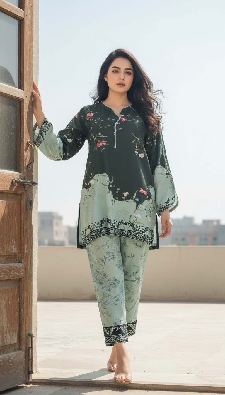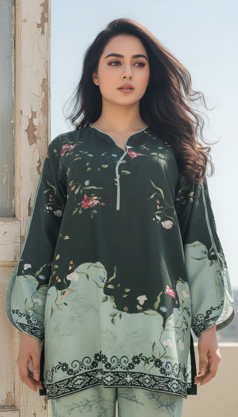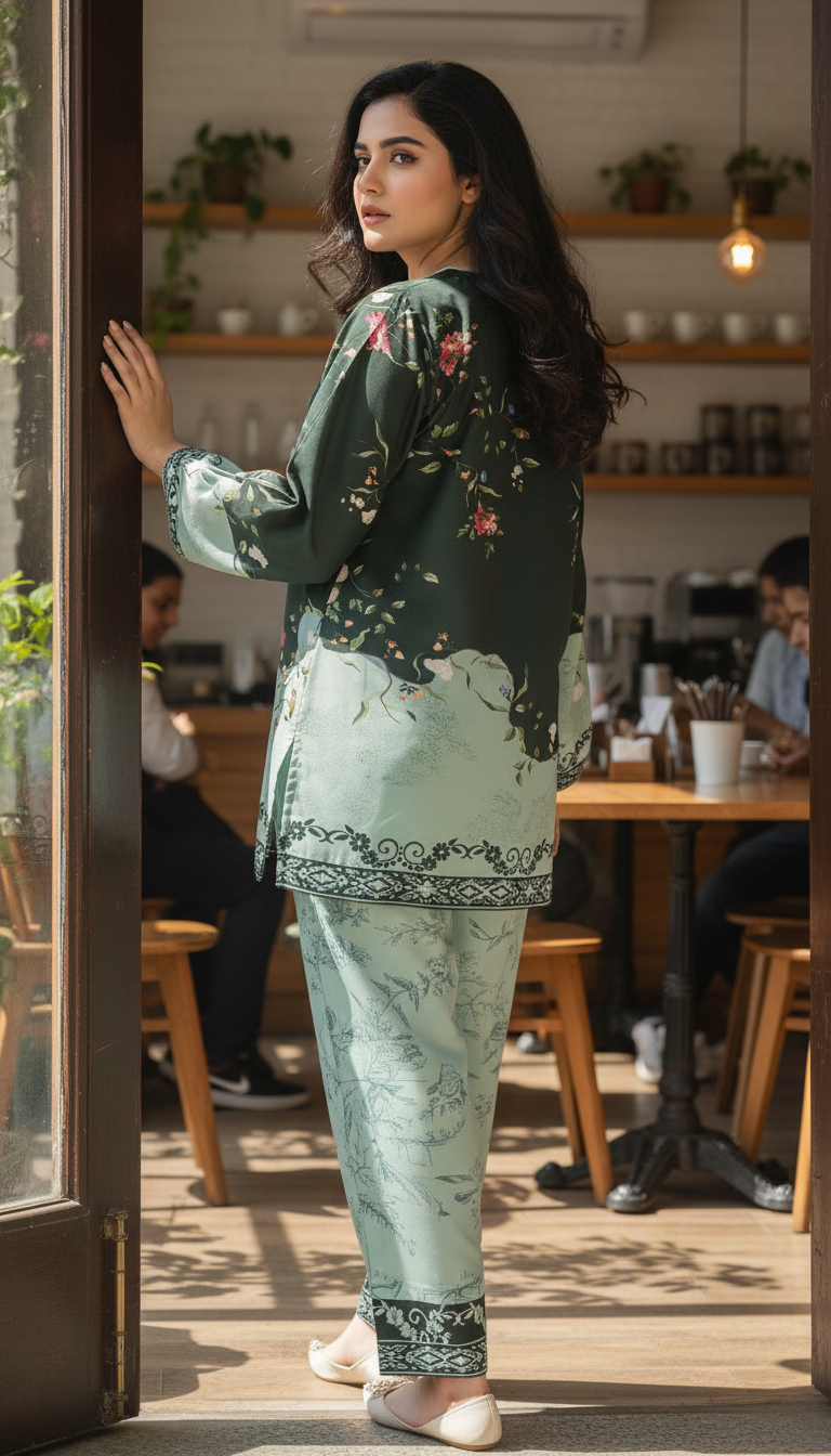 Refresh your wardrobe with this elegant sage and forest green floral printed co-ord set, blending comfort with contemporary style. The two-piece outfit features a beautifully designed long shirt with a floral and botanical print, complemented by contrast detailing on the sleeves and hem. The matching printed trousers complete the look with refined coordination and subtle charm.