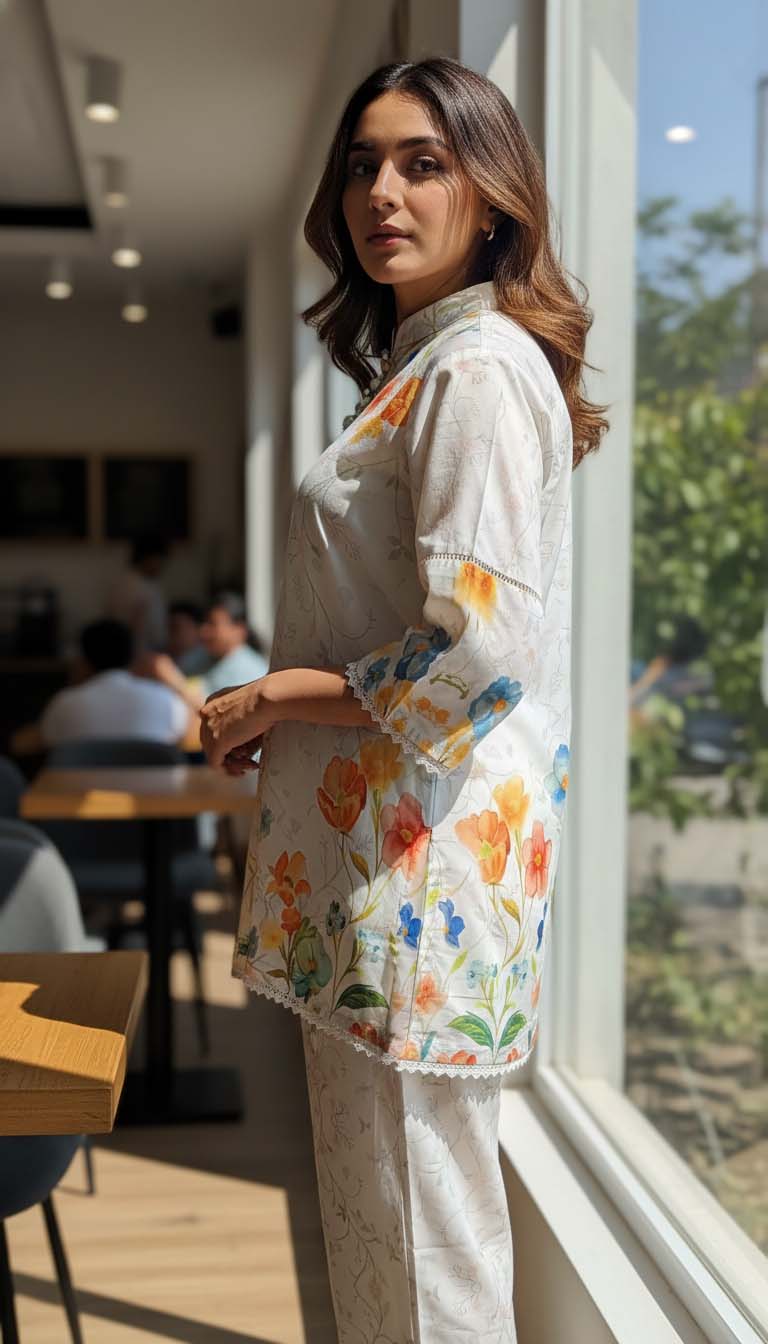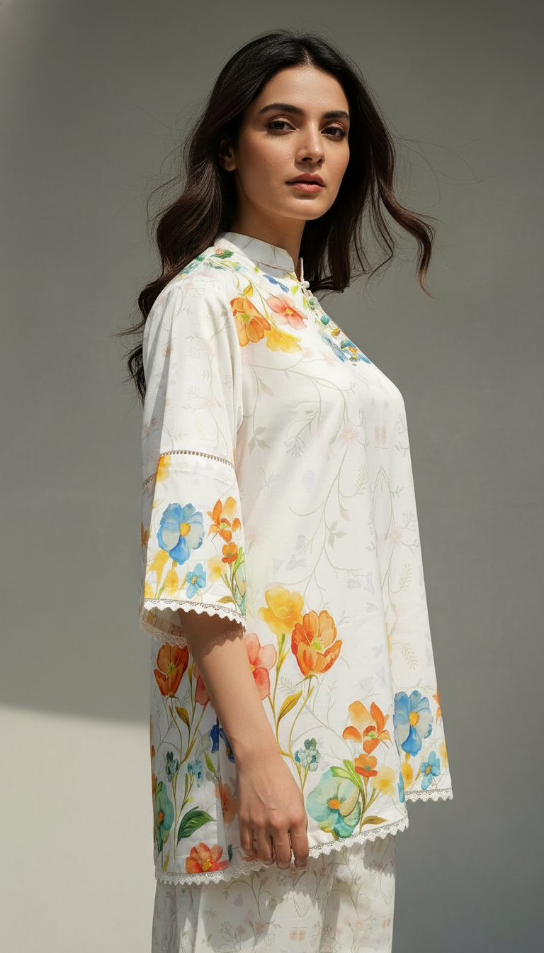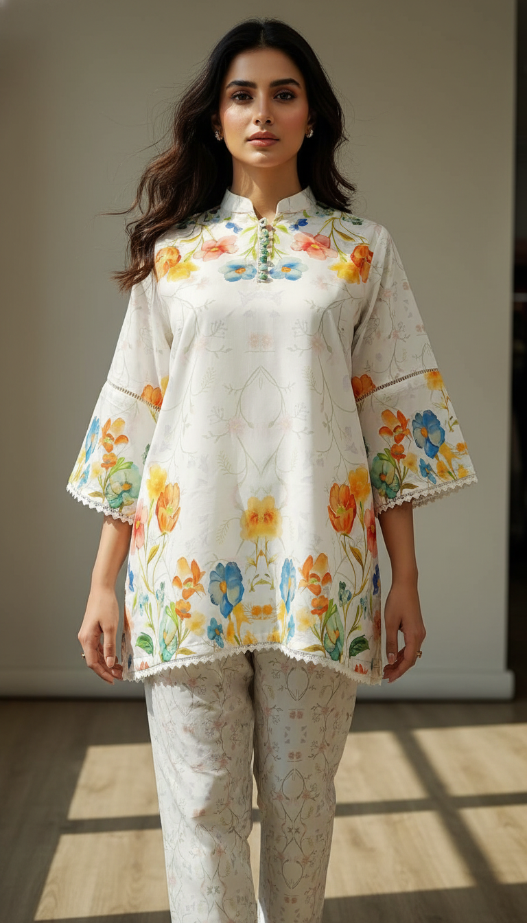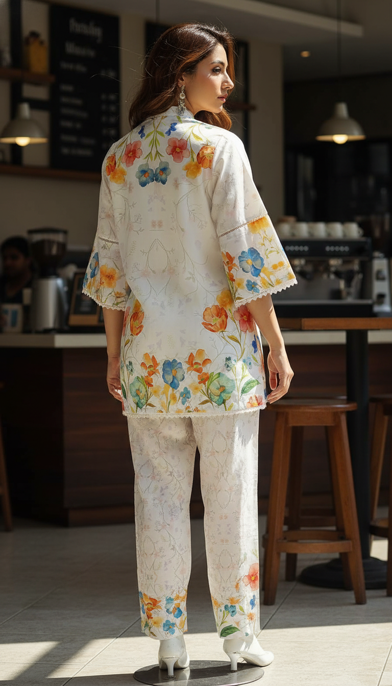 Features a charming band collar (mandarin collar) with delicate detailing around the neckline, possibly including small decorative buttons . The sleeves are finished with a stylish bell/flared cuff and a beautiful lace trim along the edges of the hem and sleeves, adding a touch of refined femininity. The complementing straight trousers feature a subtle coordinating print, creating a cohesive and streamlined look.
