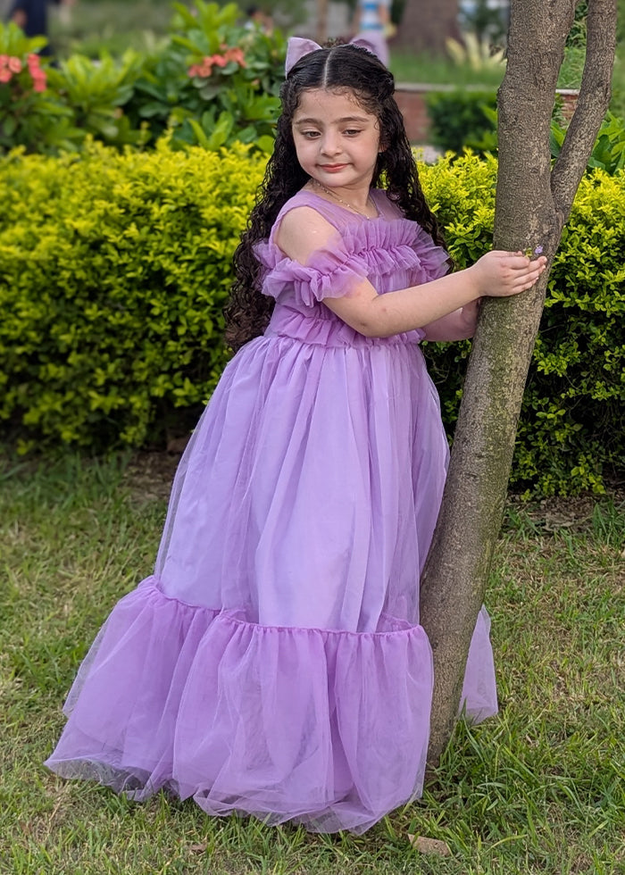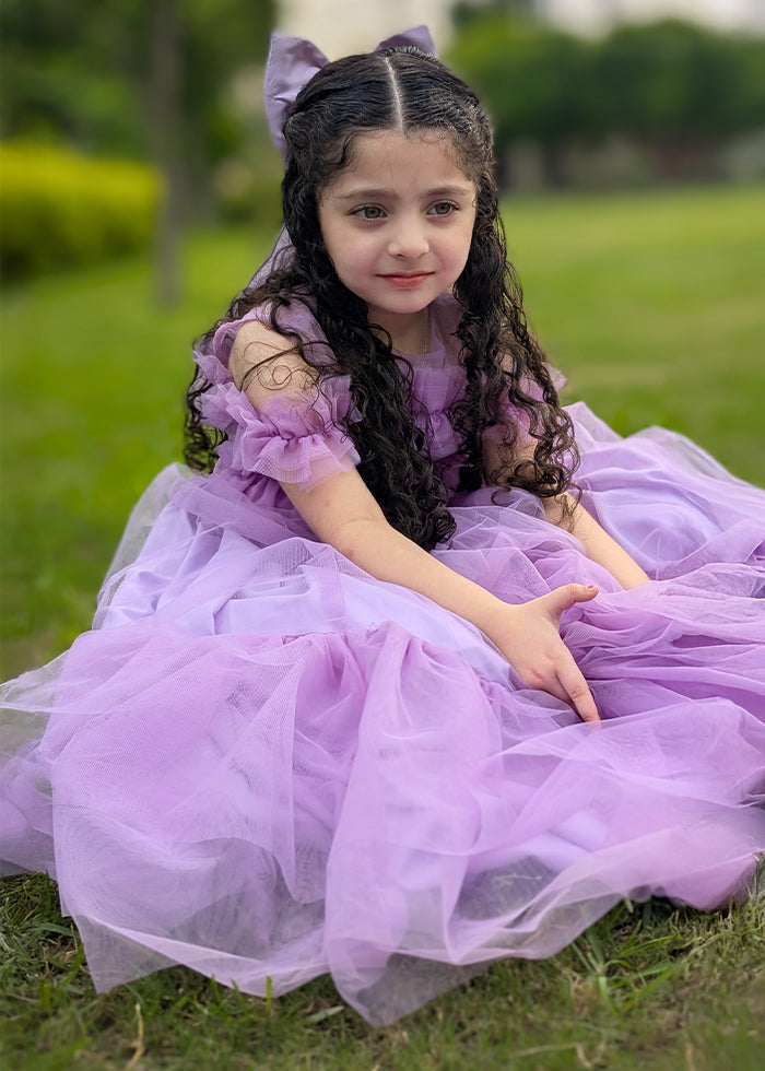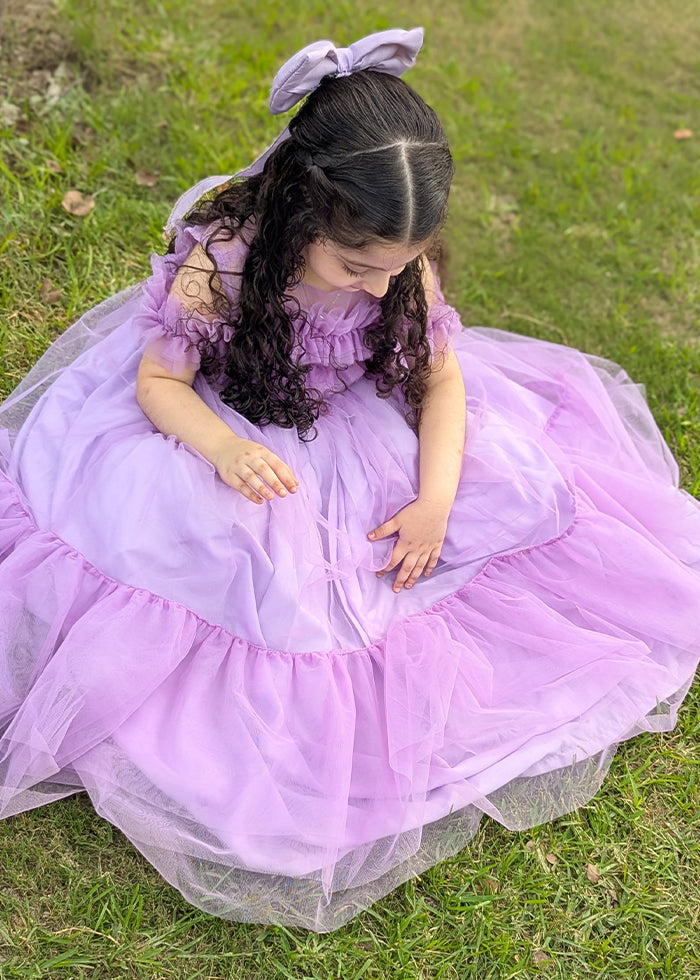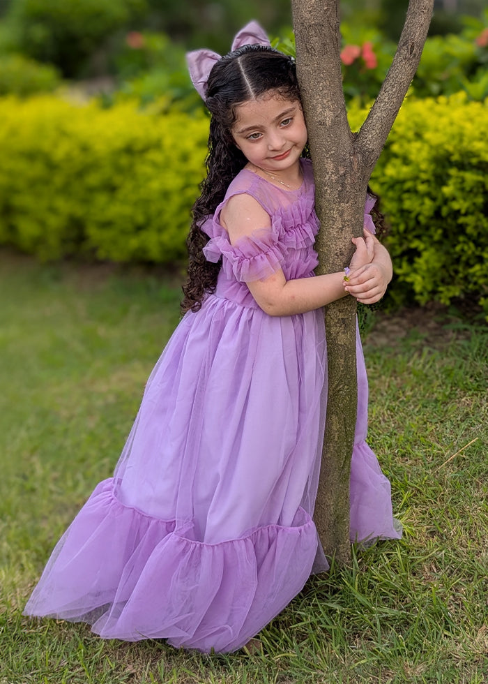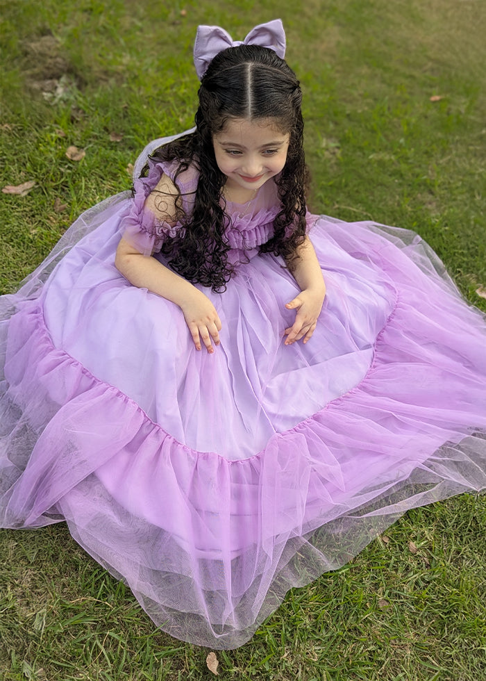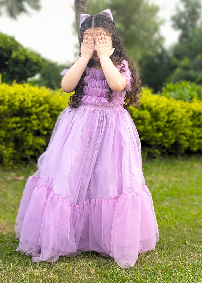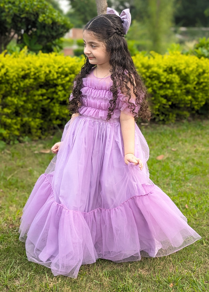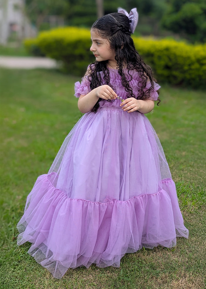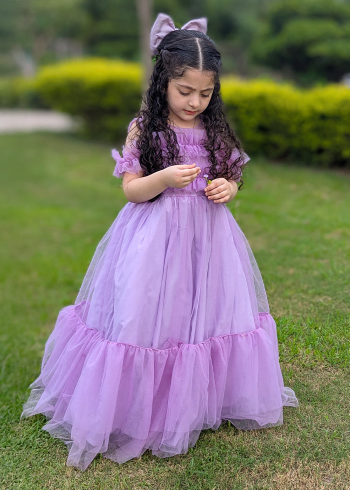 Elegant lavender kids long frock with pleated flare and a lovely flowy style, perfect for Birthday events.