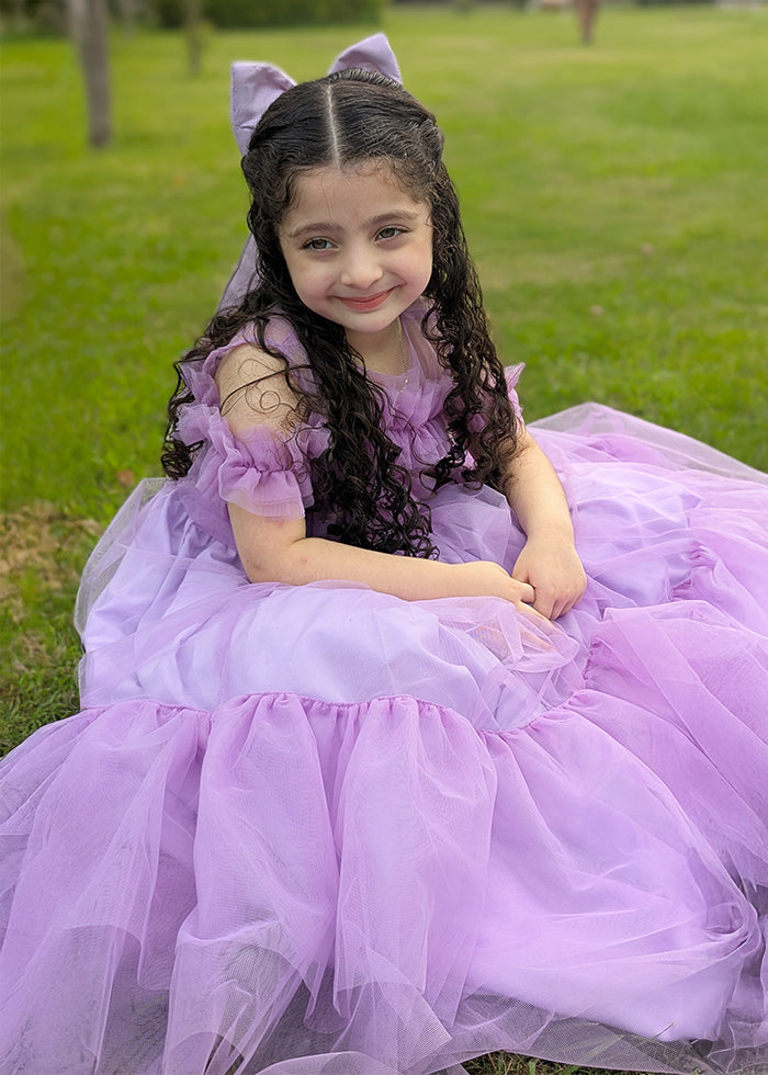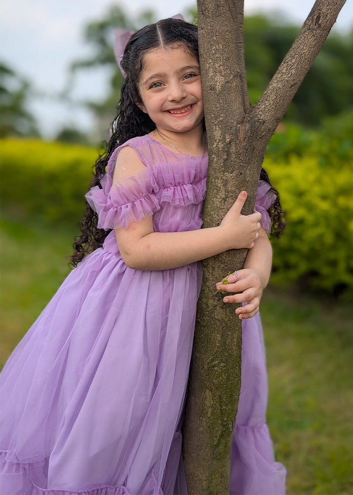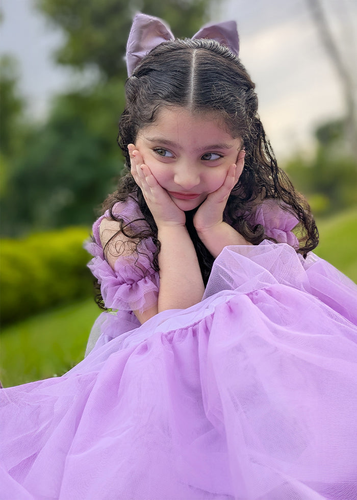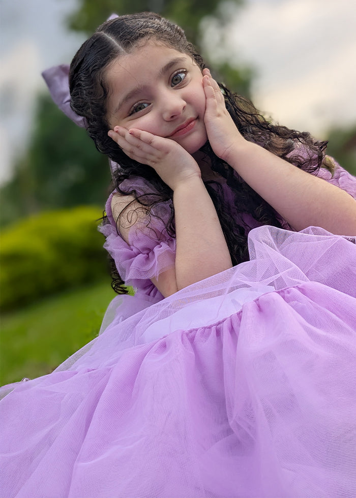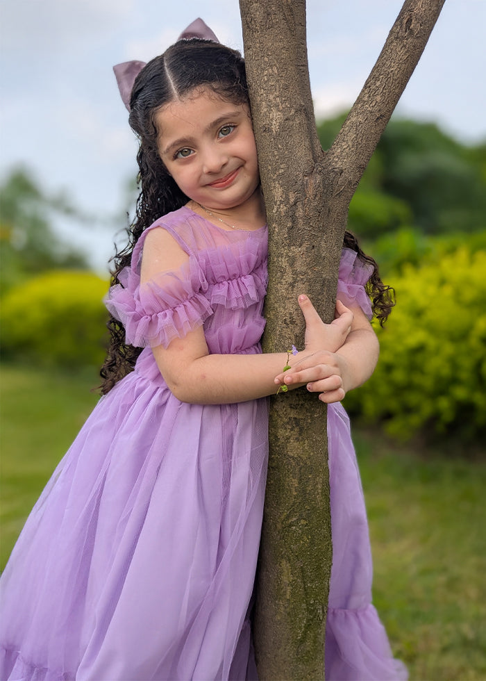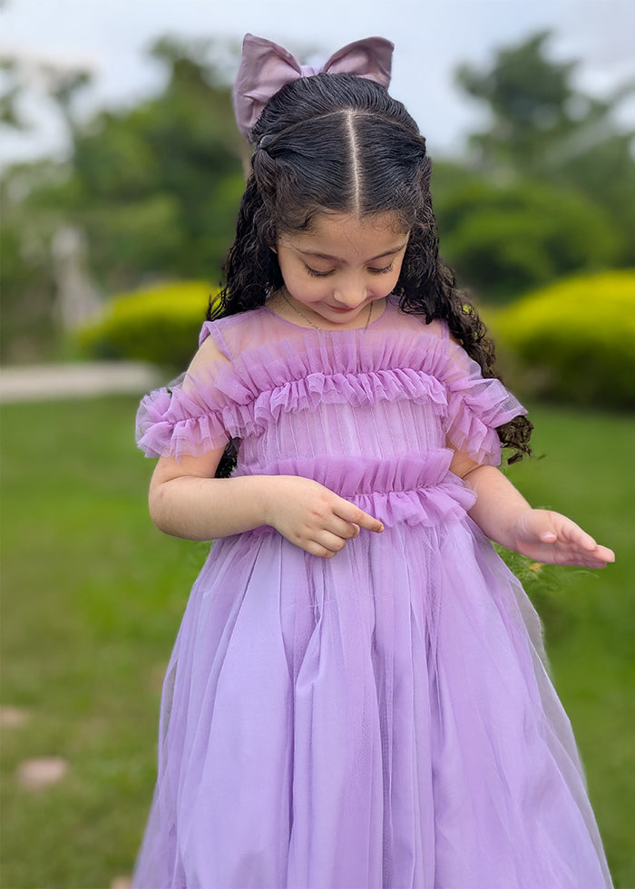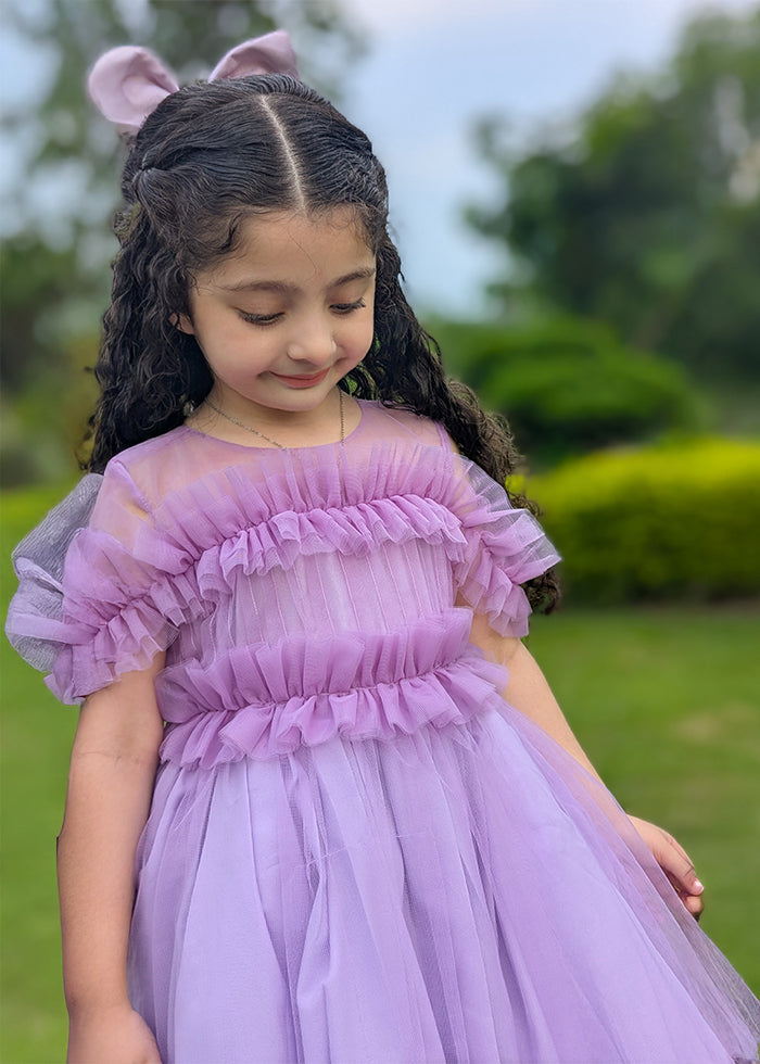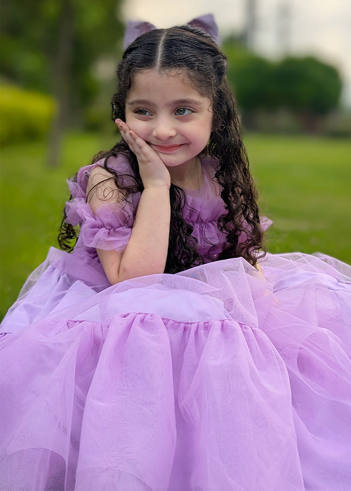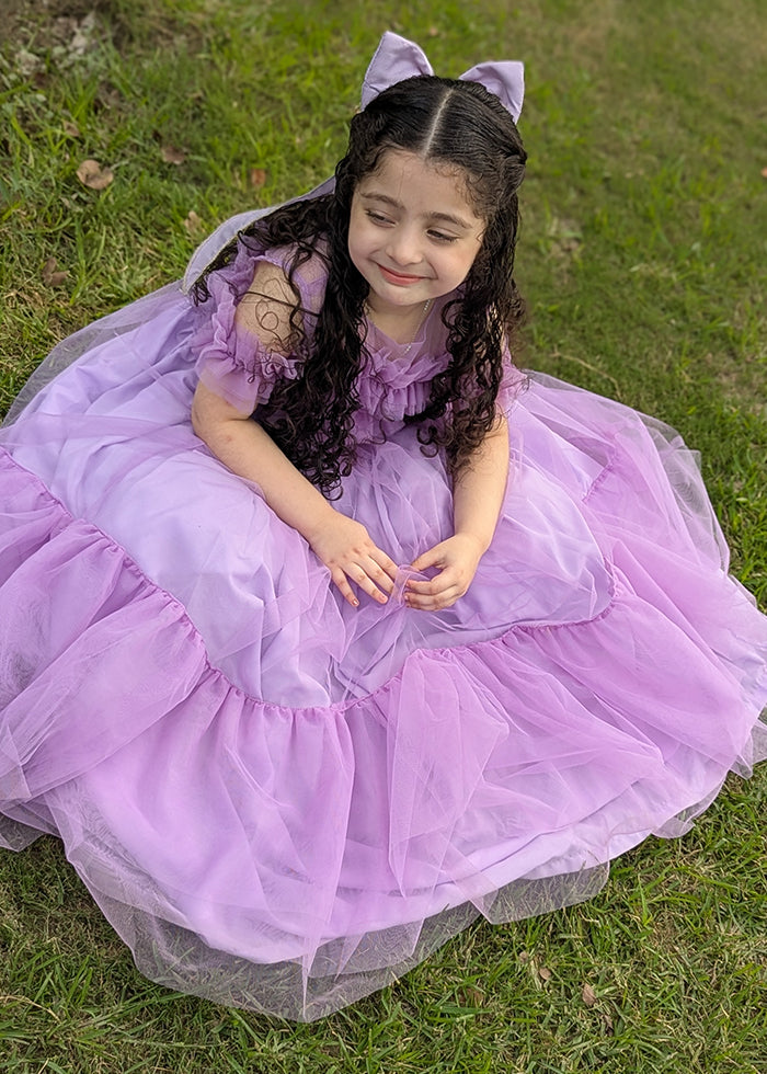 Elegant lavender kids long frock with pleated flare and a lovely flowy style, perfect for Birthday events.