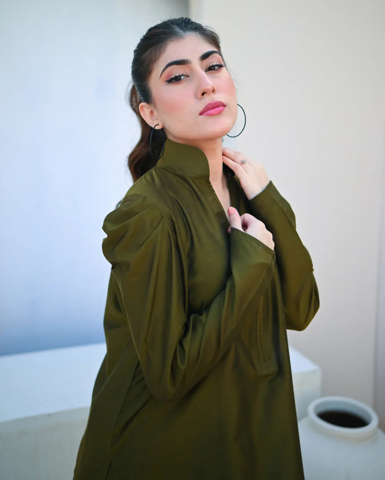 Moss green matching set includes high collar shirt with puffy sleeves along with straight pants in-house khadi cotton fabric suited for winters.