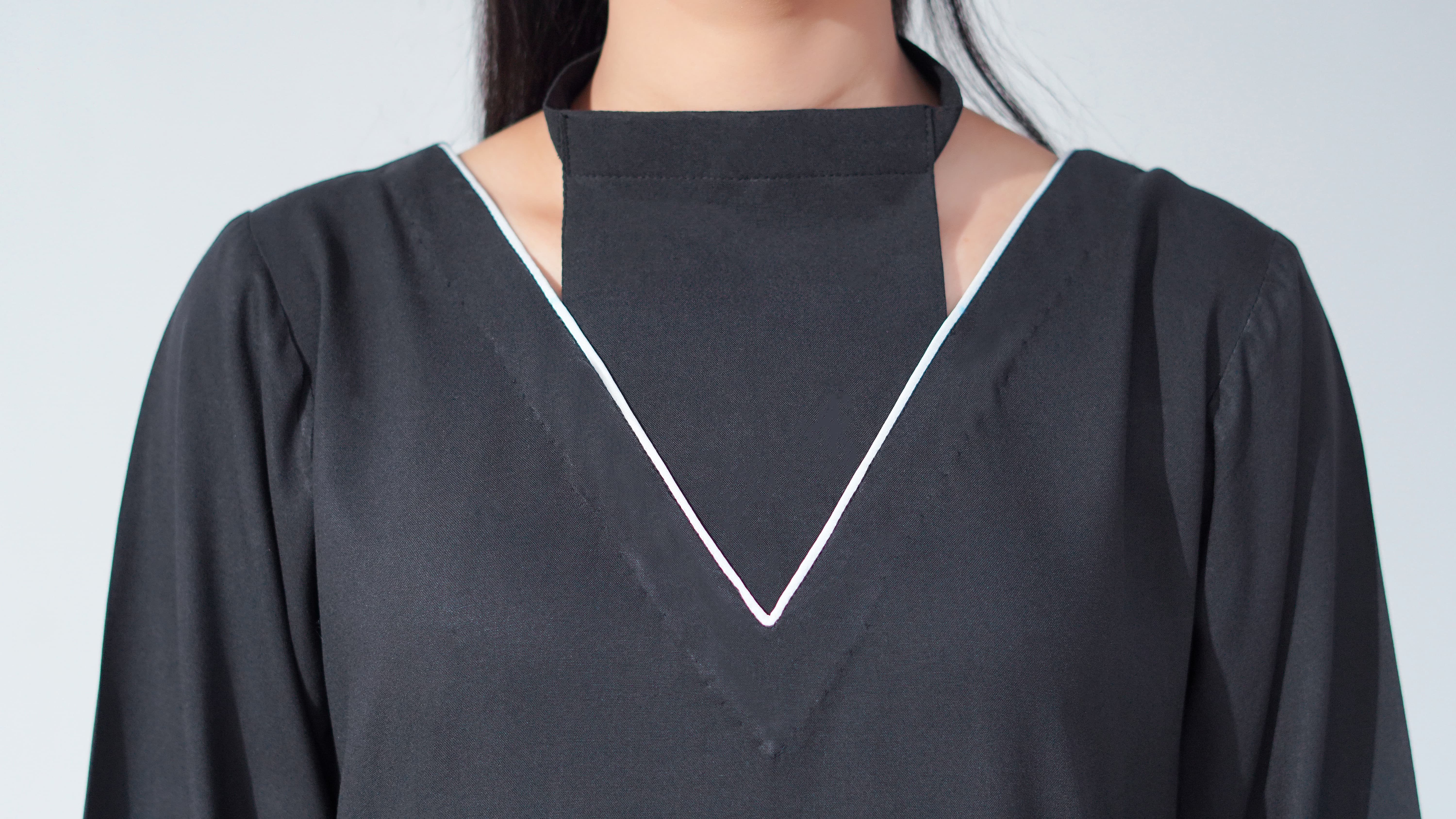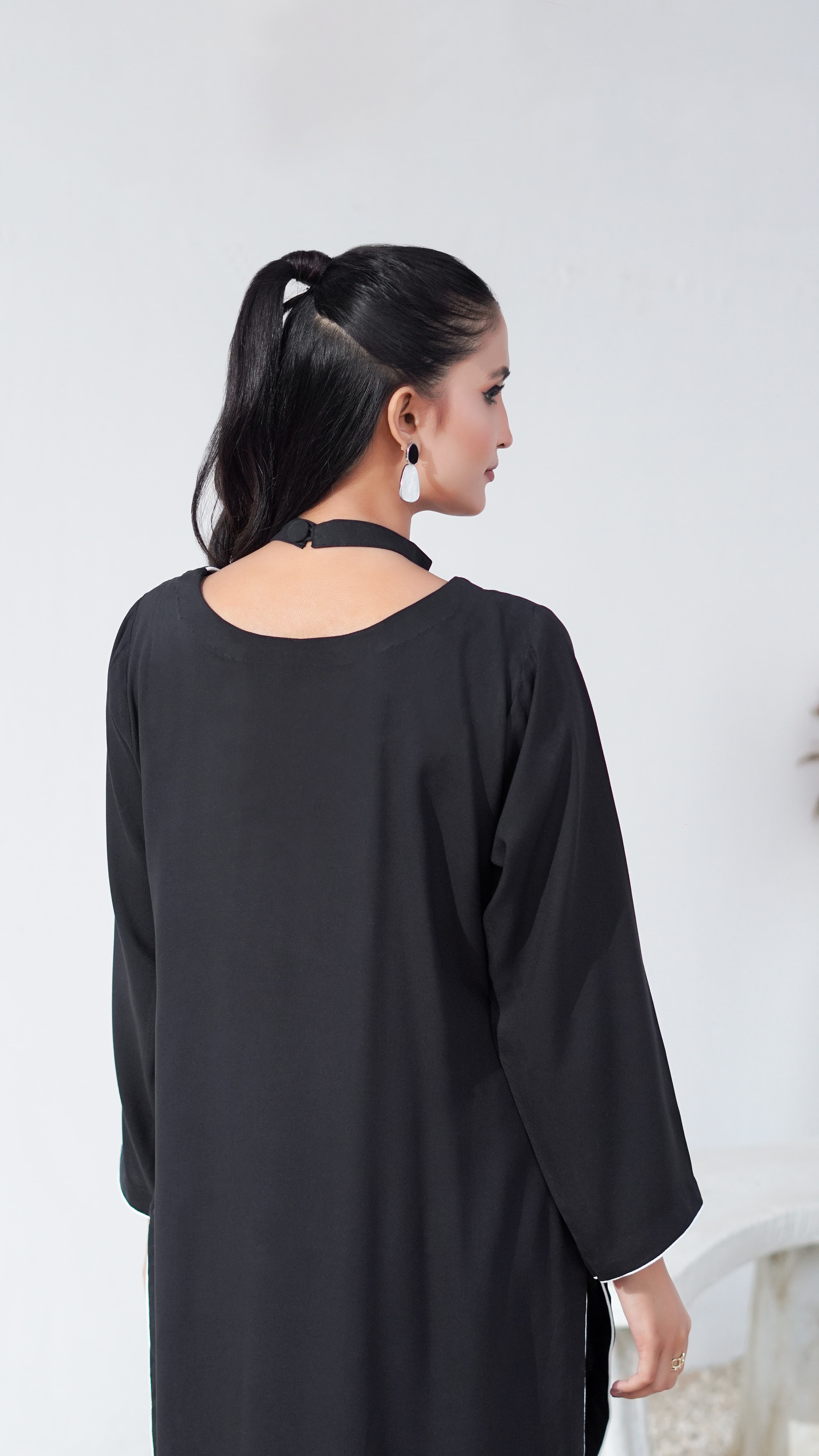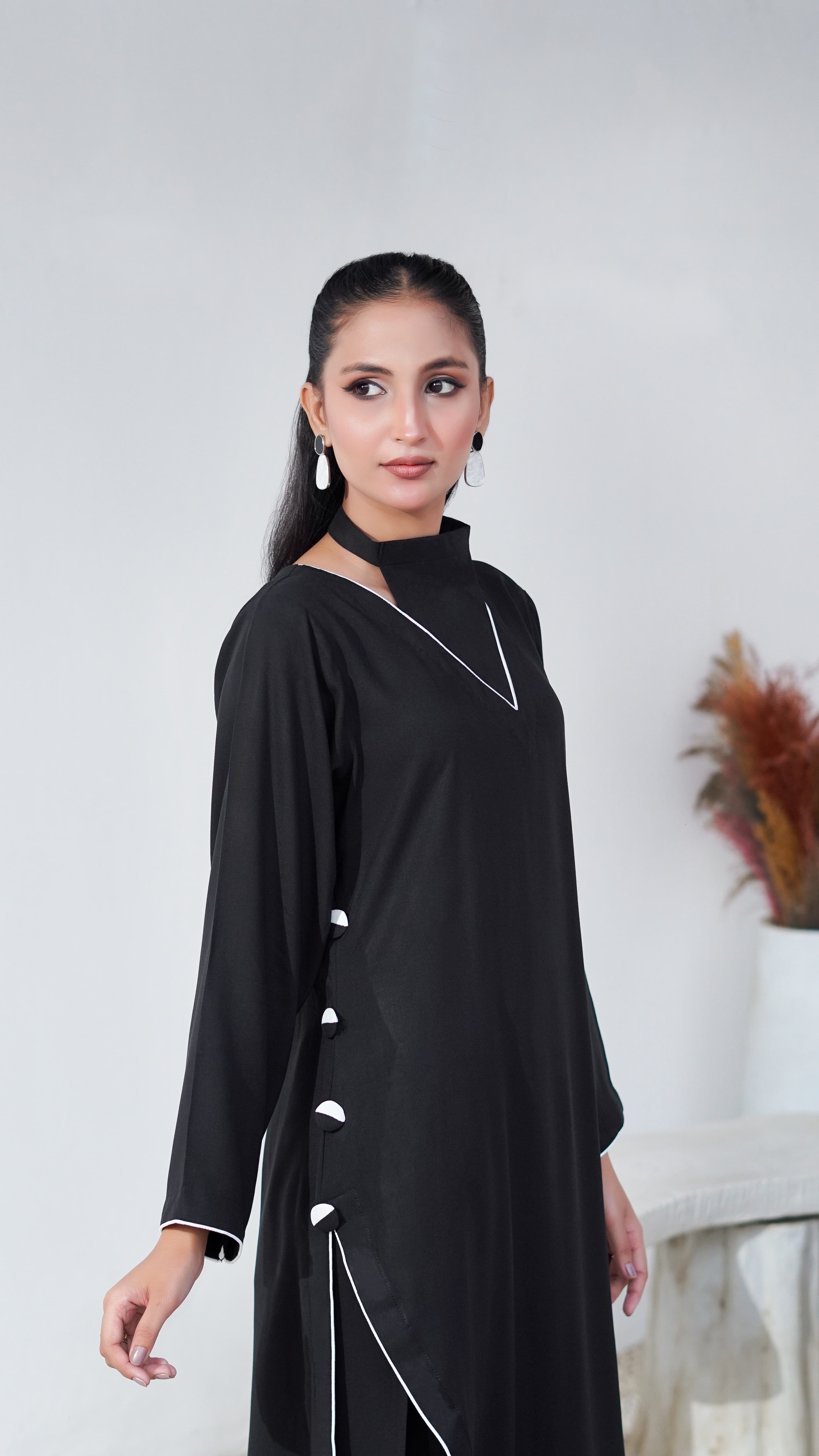 A black linen co-ord set designed with a clean, structured silhouette. The neckline, hem and side slit are traced with a single white piping detail, giving the piece its sharp, signature line. A slanted cut on one side is accented with a row of contrast buttons for a subtle design highlight. Sharp, minimal, and timeless in its finish. Light, breathable, and quietly refined, Noirline brings a modern edge to everyday ease.
