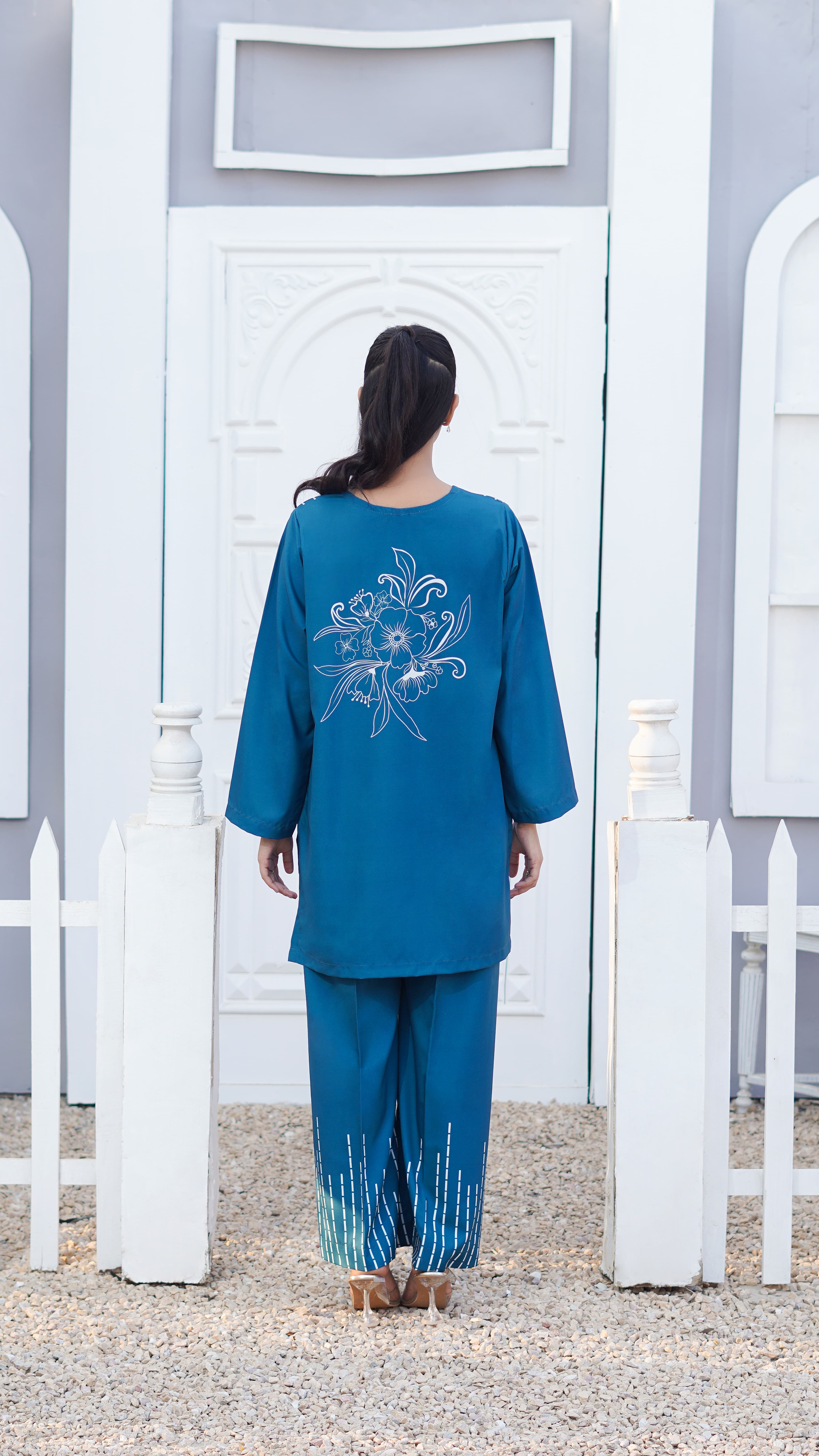 A crepe two-piece in deep blue featuring printed florals and geometric elements placed along the neckline, back and hem. The clean straight cut keeps the fit relaxed, making Seastitch light, comfortable, and easy for everyday wear.