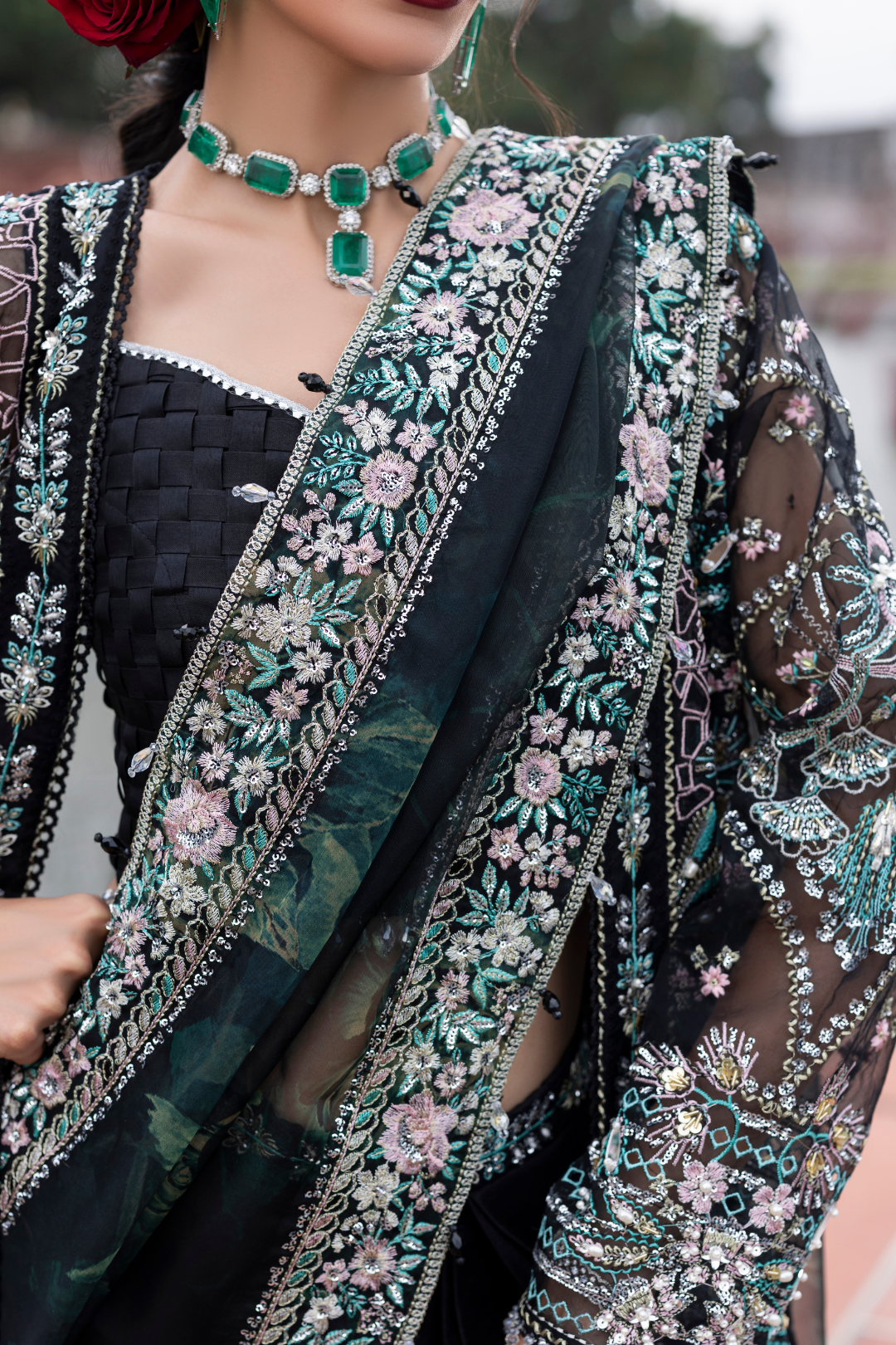 Dark, divine, and endlessly sophisticated Noir from the Ember Collection is the ultimate expression of timeless allure. Crafted on a sheer black organza base, the long shirt features meticulously hand-embellished panels and sleeves, adorned with intricate threadwork, sequins, and refined craftsmanship that glimmer with understated elegance. The look is completed with a digitally printed and embroidered organza dupatta bordered on all four sides and paired with a sleek raw silk trouser for a polished finish. Noir captures the perfect balance of grace and grandeur, an ensemble made to turn every occasion into a statement of style.