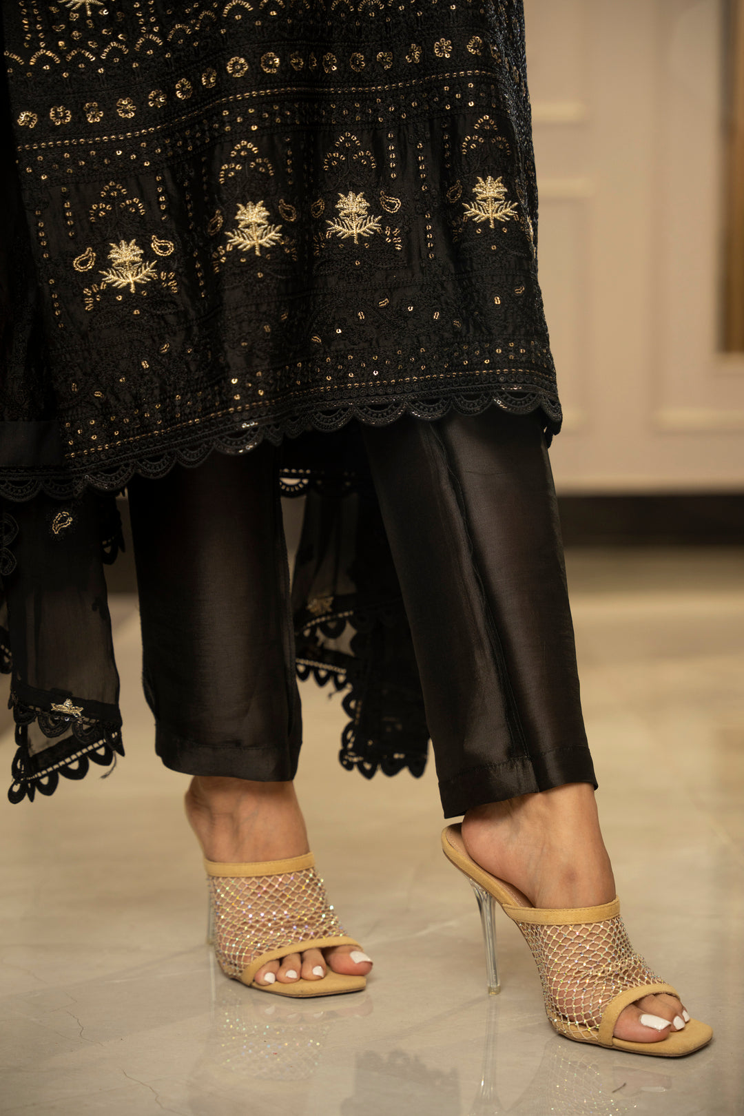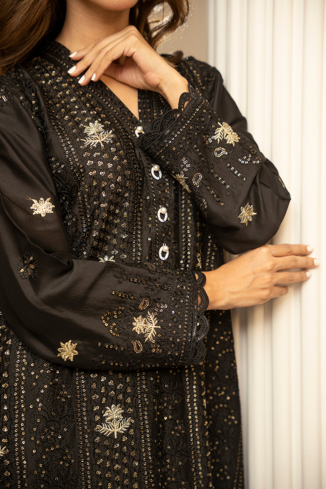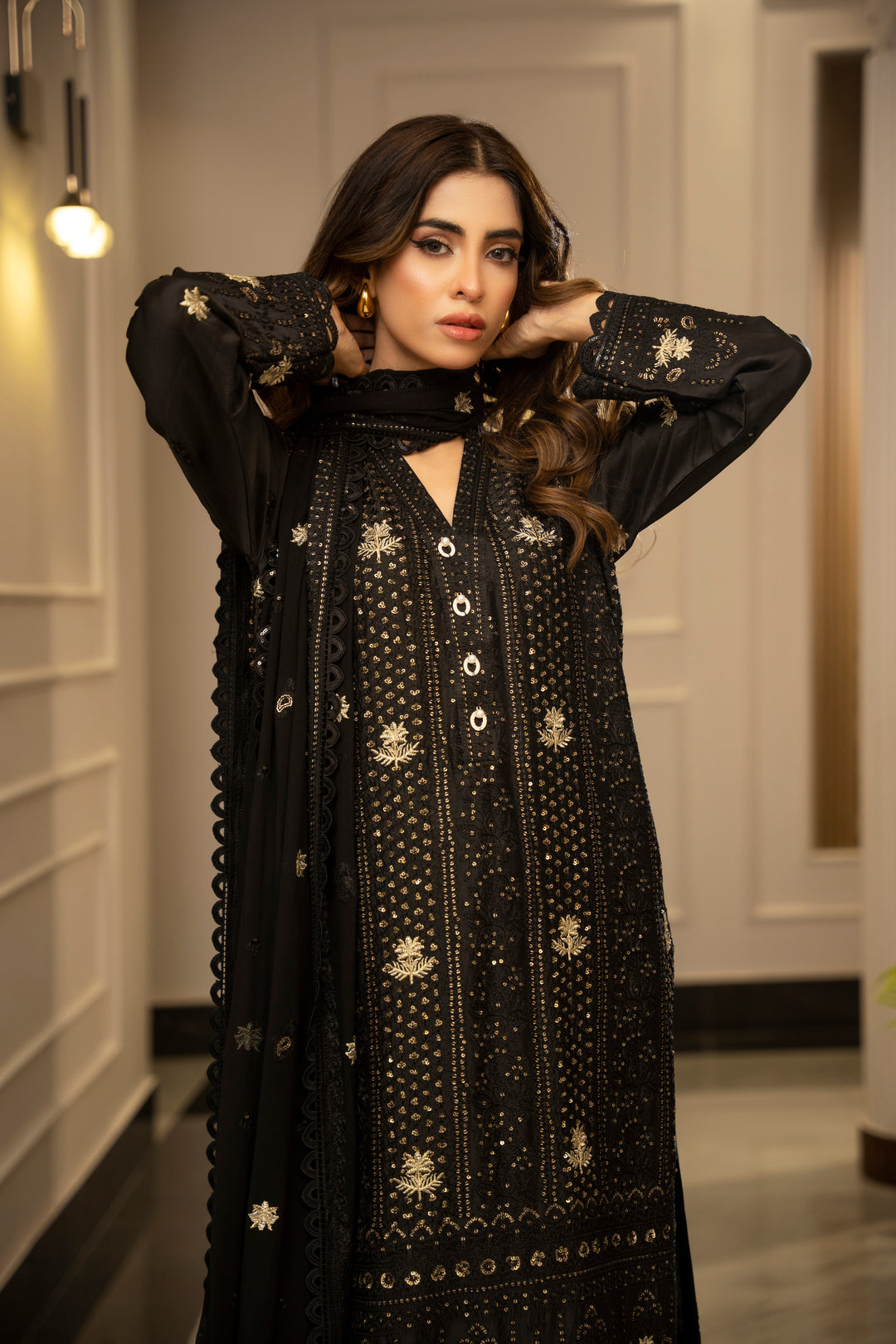 Indulge in the timeless allure of NOIR. Featuring pure Sheesha Silk with intricate embroidery on both front and back, this ensemble redefines luxury. Paired with a staple cotton dyed trouser and a chiffon embroidered dupatta, it?s finished with an extra embroidered border for a flawless touch.