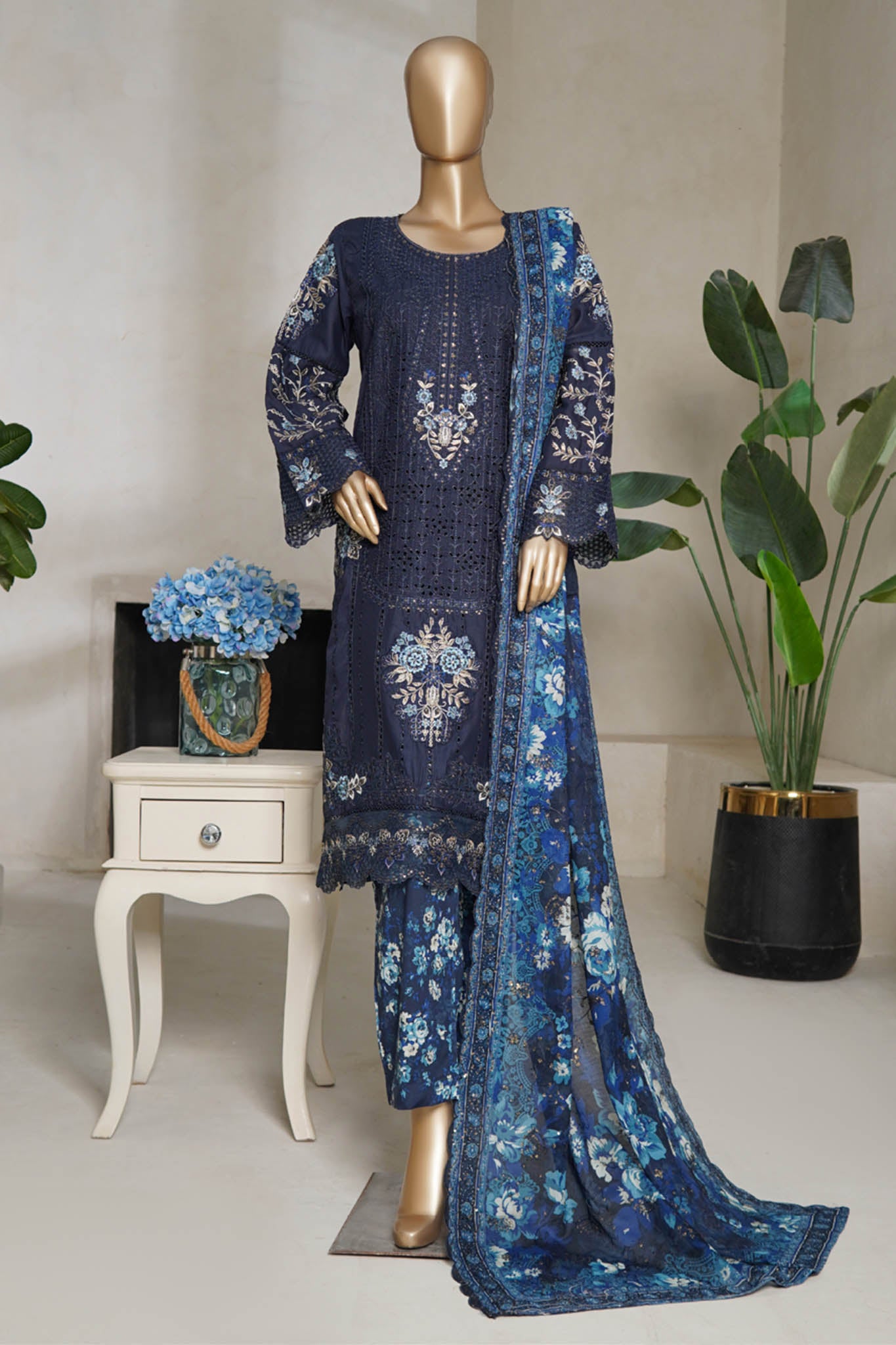 Bin Saeed Stitched 3 Piece Luxury Plain Cotton With Emb Printed Back Collection'2025-NSM-2473-Blue