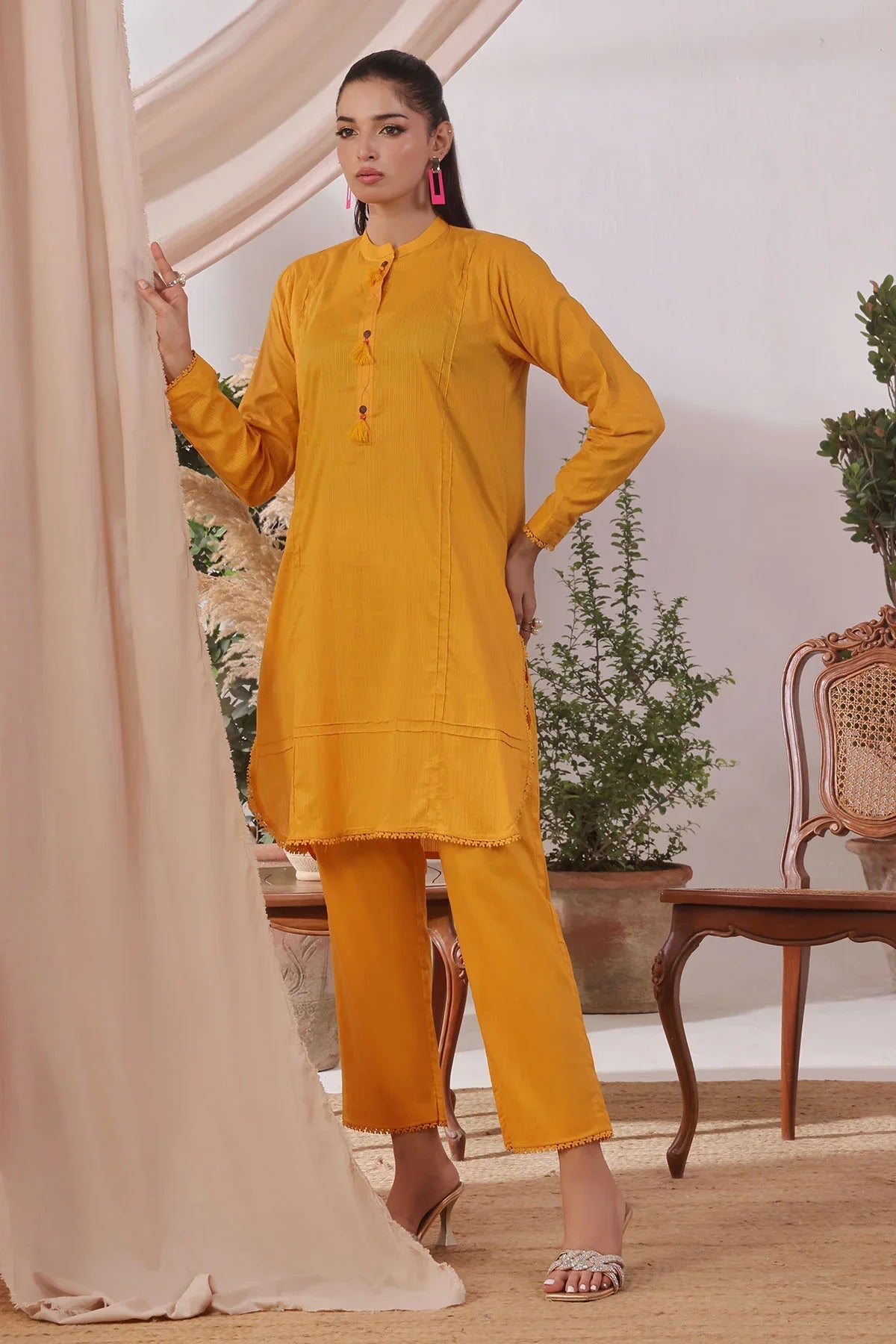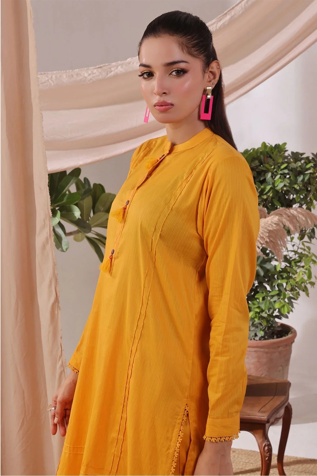 Top: Mustard Yellow Chambray Cotton Kurta With Crotia Laces