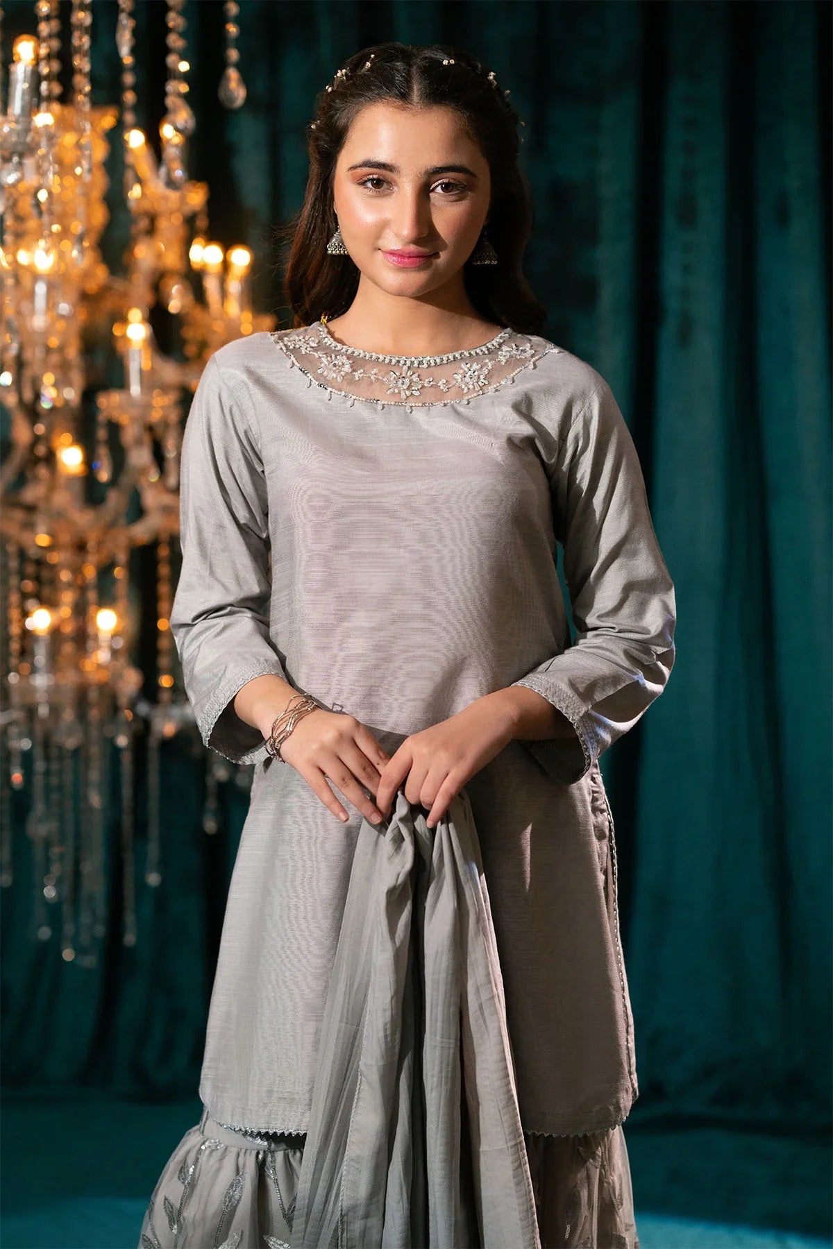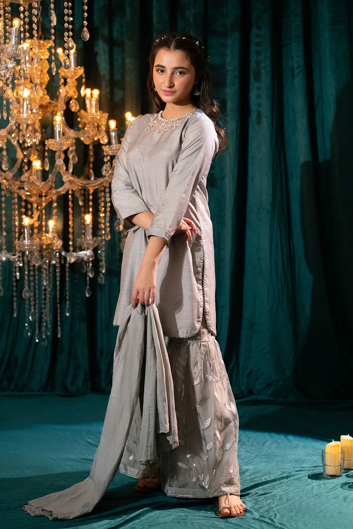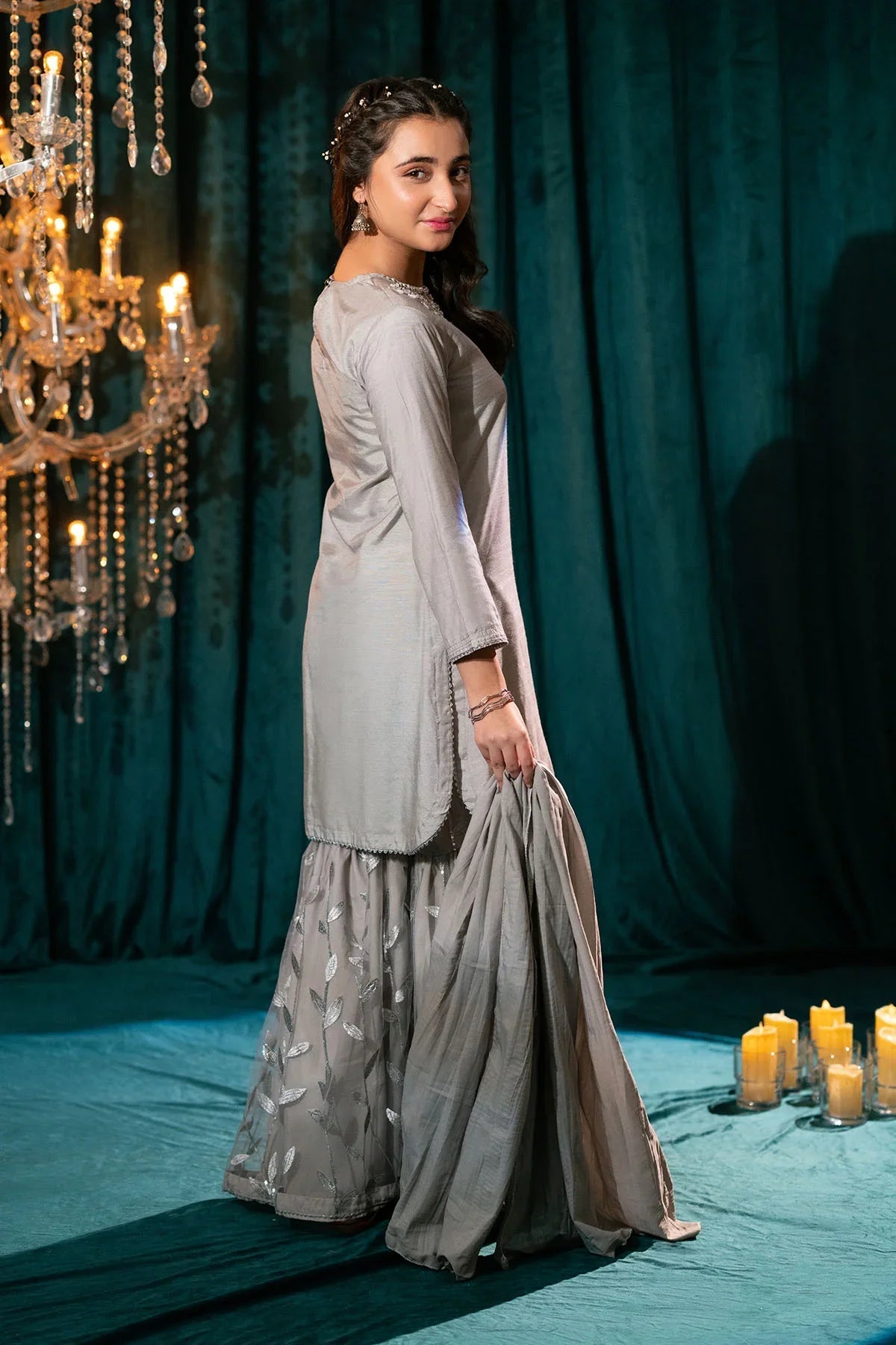 Bottom: Grey Sequence Net Gharara With Malai Crepe Lining