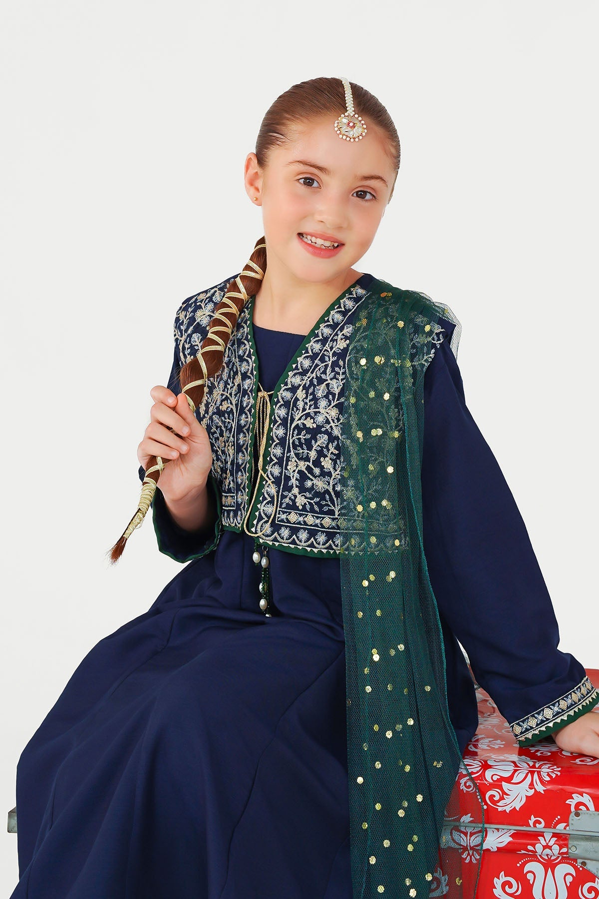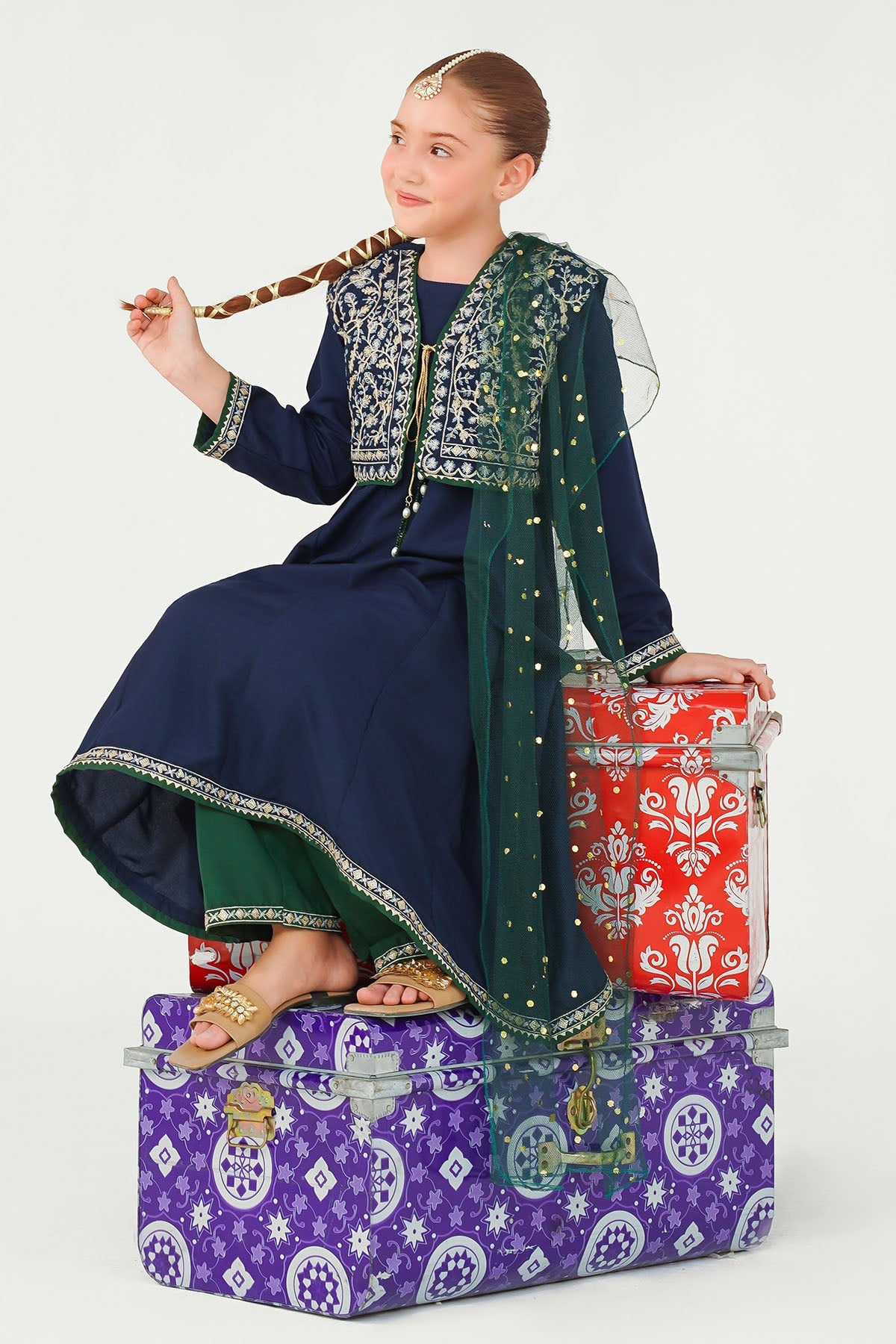 Top: Navy Blue Raw Silk Kurta & Koti With Embroidery and Tassels