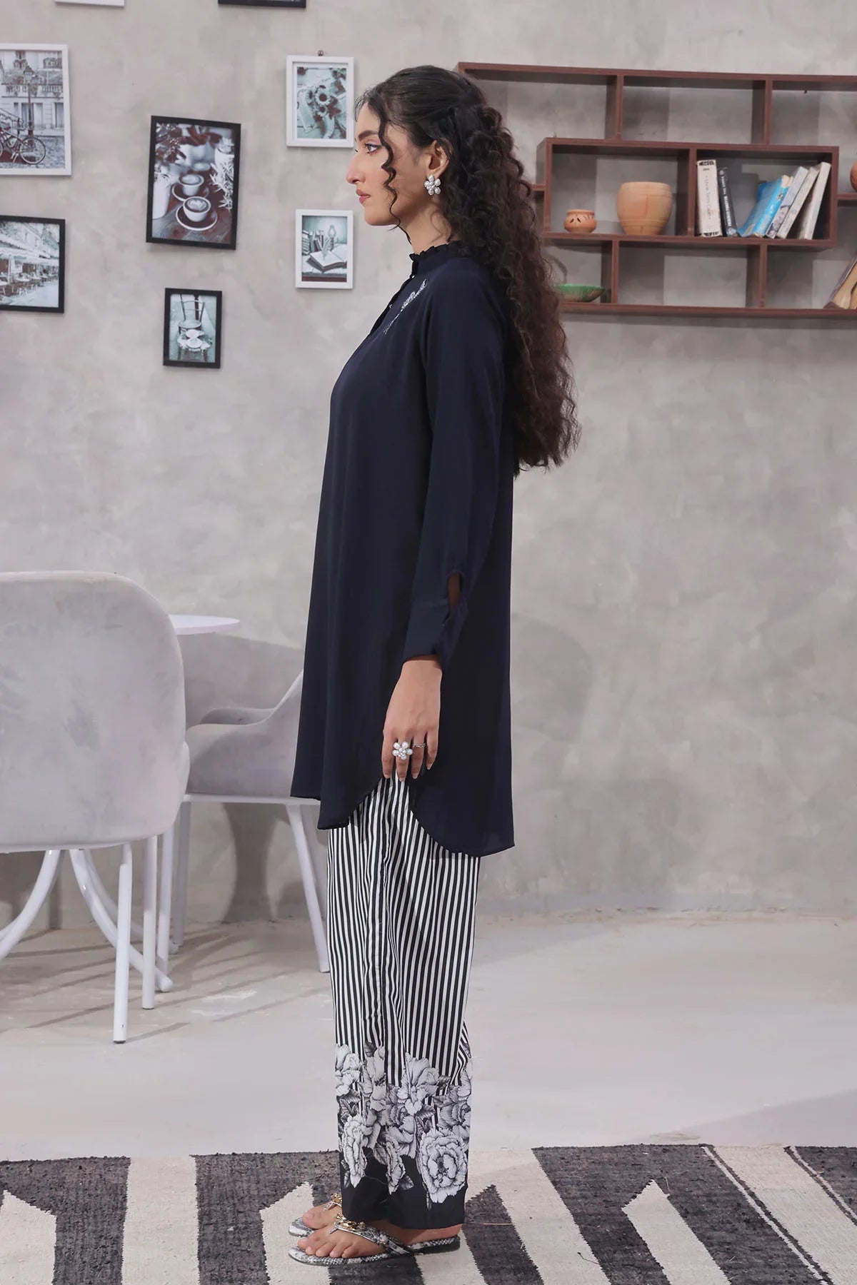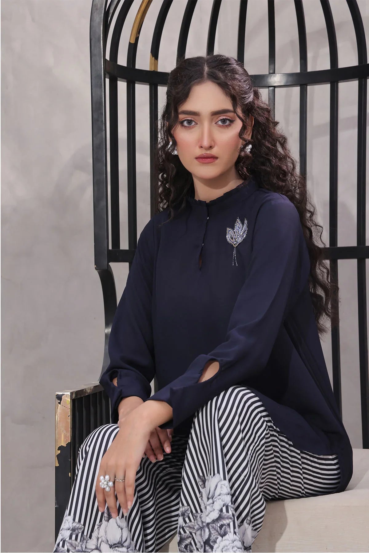 Bottom: Navy Blue Printed Malai Crepe Trouser