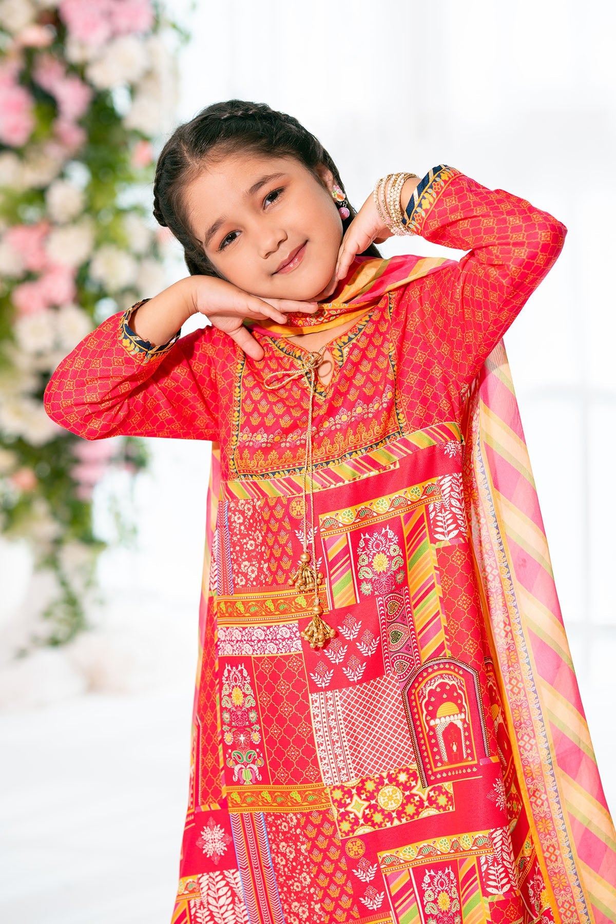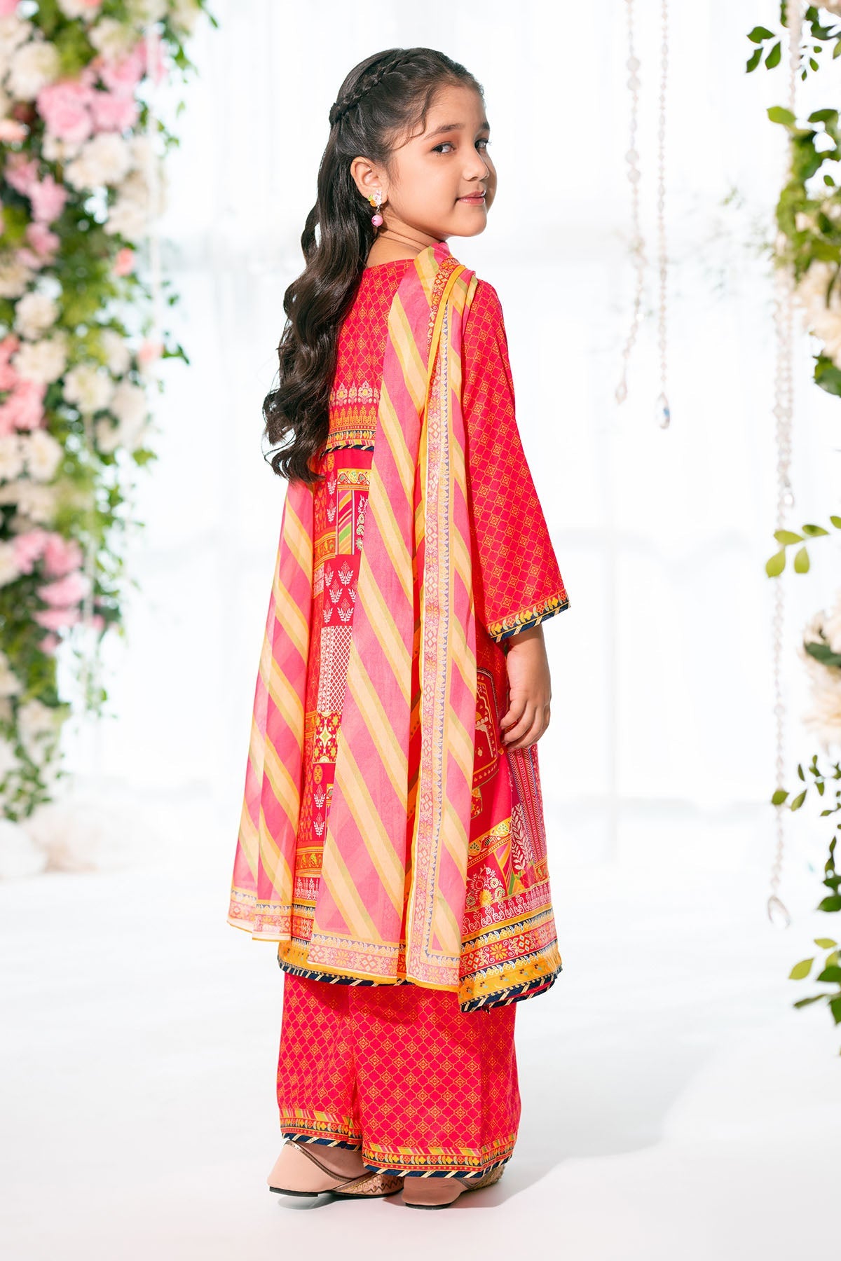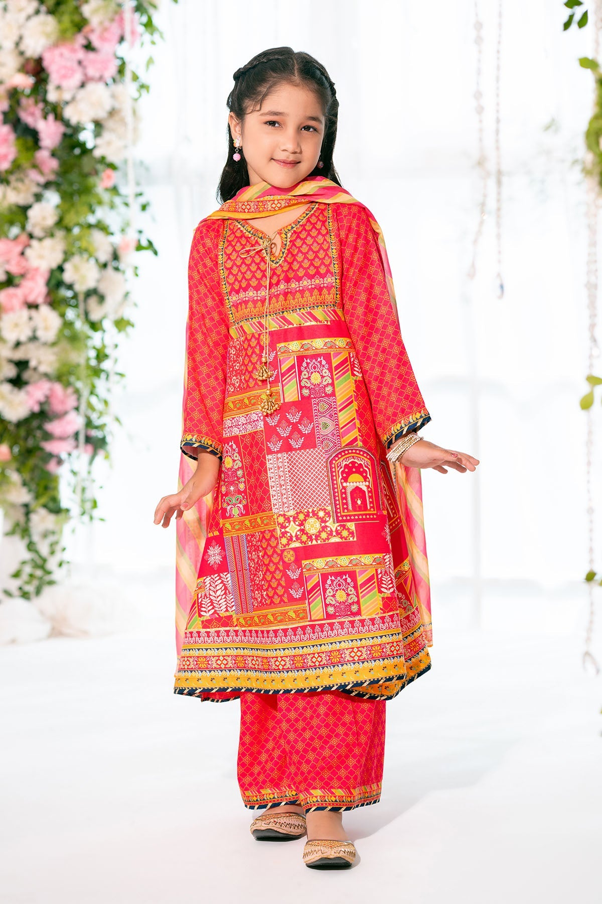 Top: Hot Pink Herringbone Digital Printed Suit with Tassels and Gota Laces