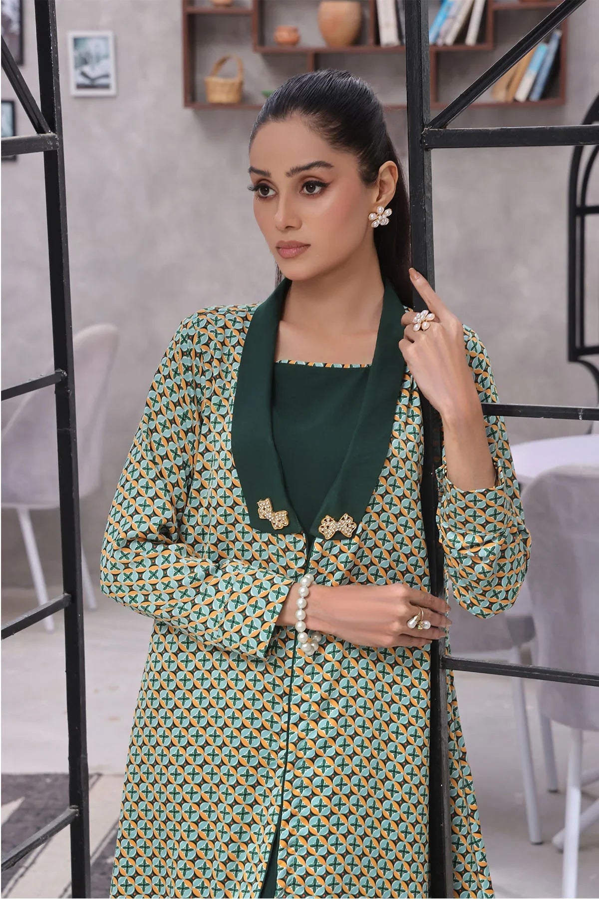 Top: Dark Green Printed Georgette Cape With Malai Crepe Inner