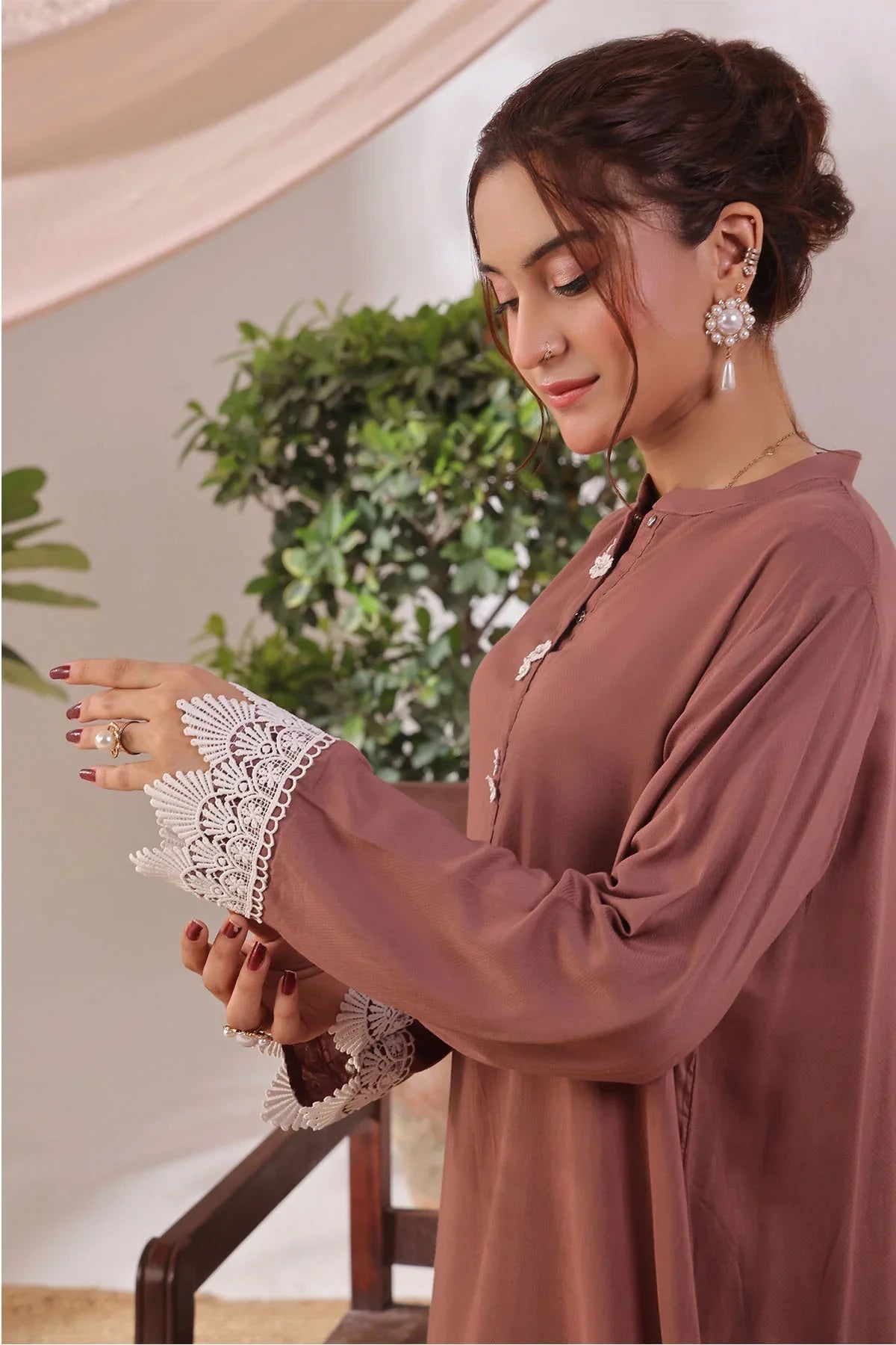 Top: Brown Rod Silk Kurta With Crotia Laces