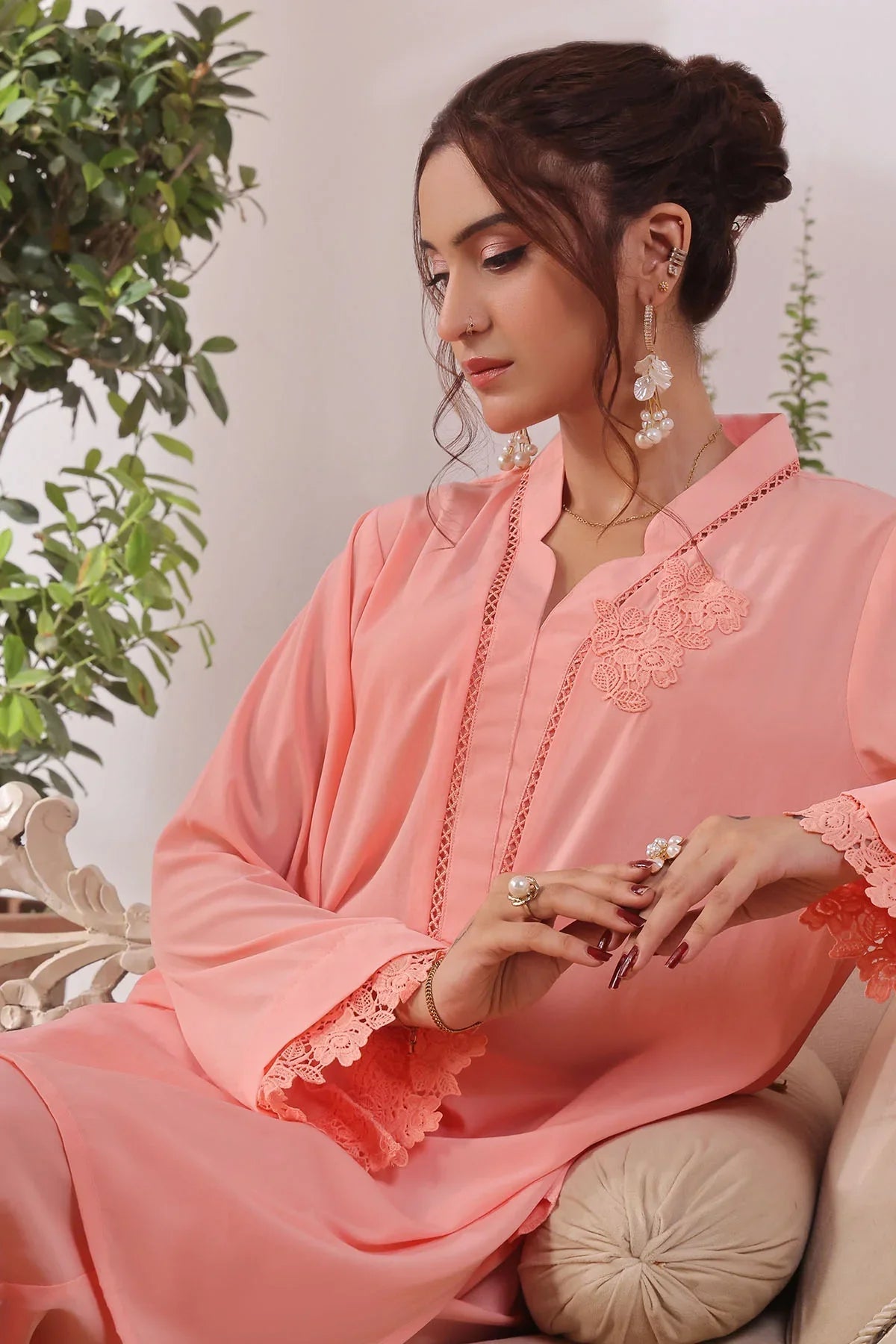 Top: Peach Silk Kurta With Crotia Laces