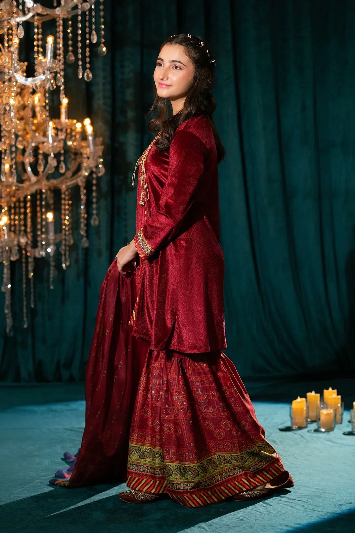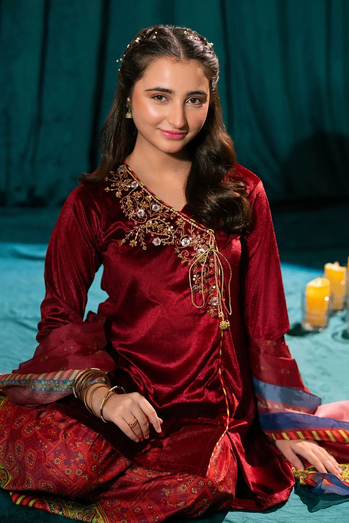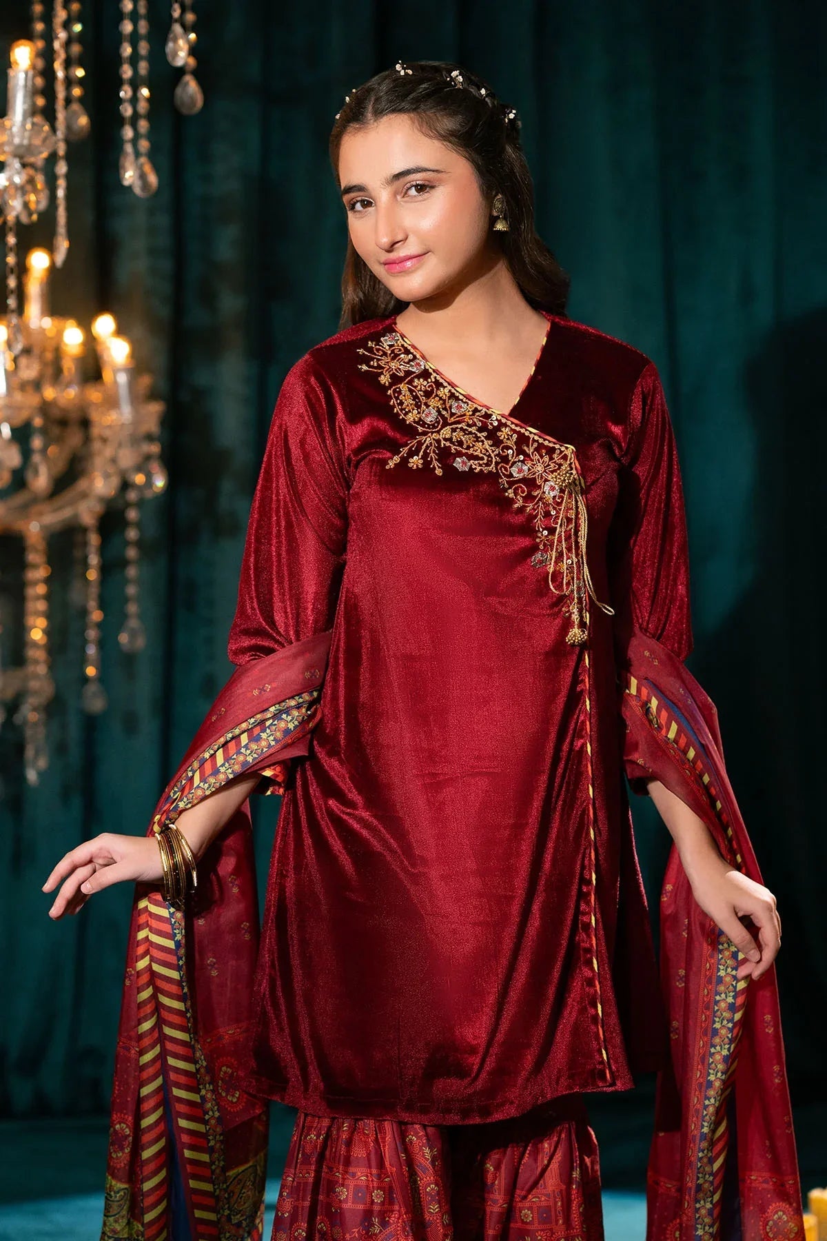 Top: Maroon Velvet Kurta With Hand Adda Work and Tassels