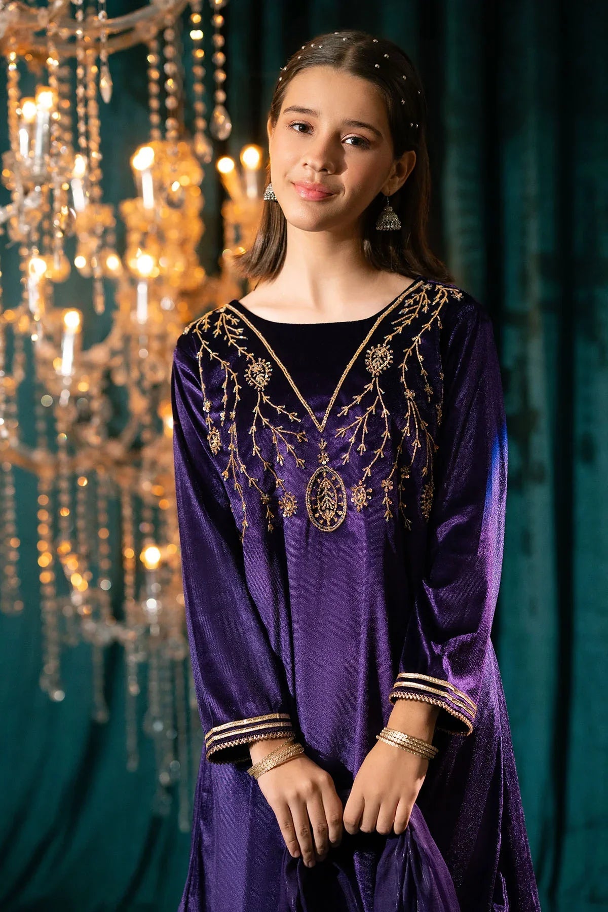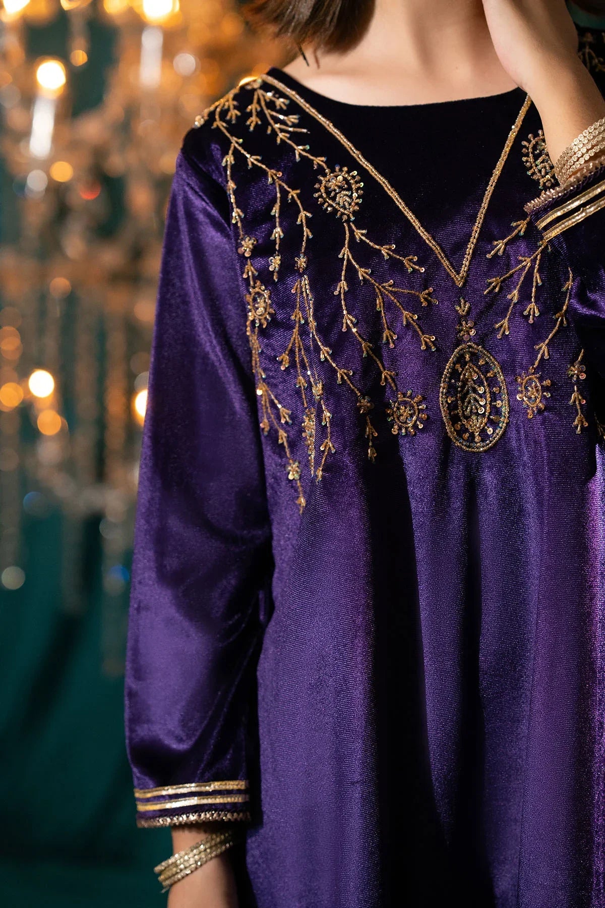 Top: Purple Velvet Kurta With Hand Adda Work and Gota Laces