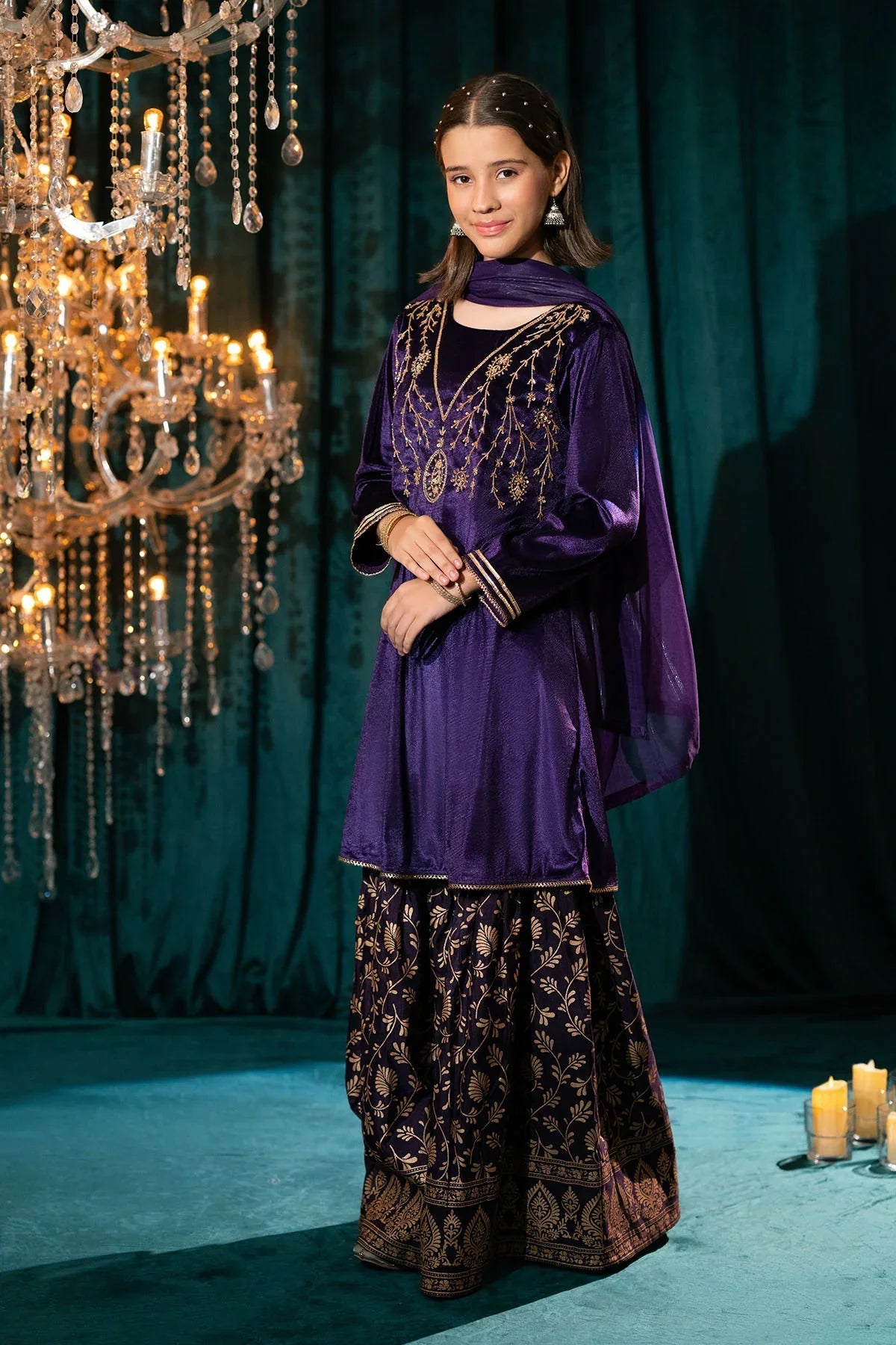 Bottom: Purple Raw Silk Gharara With Screen Print.