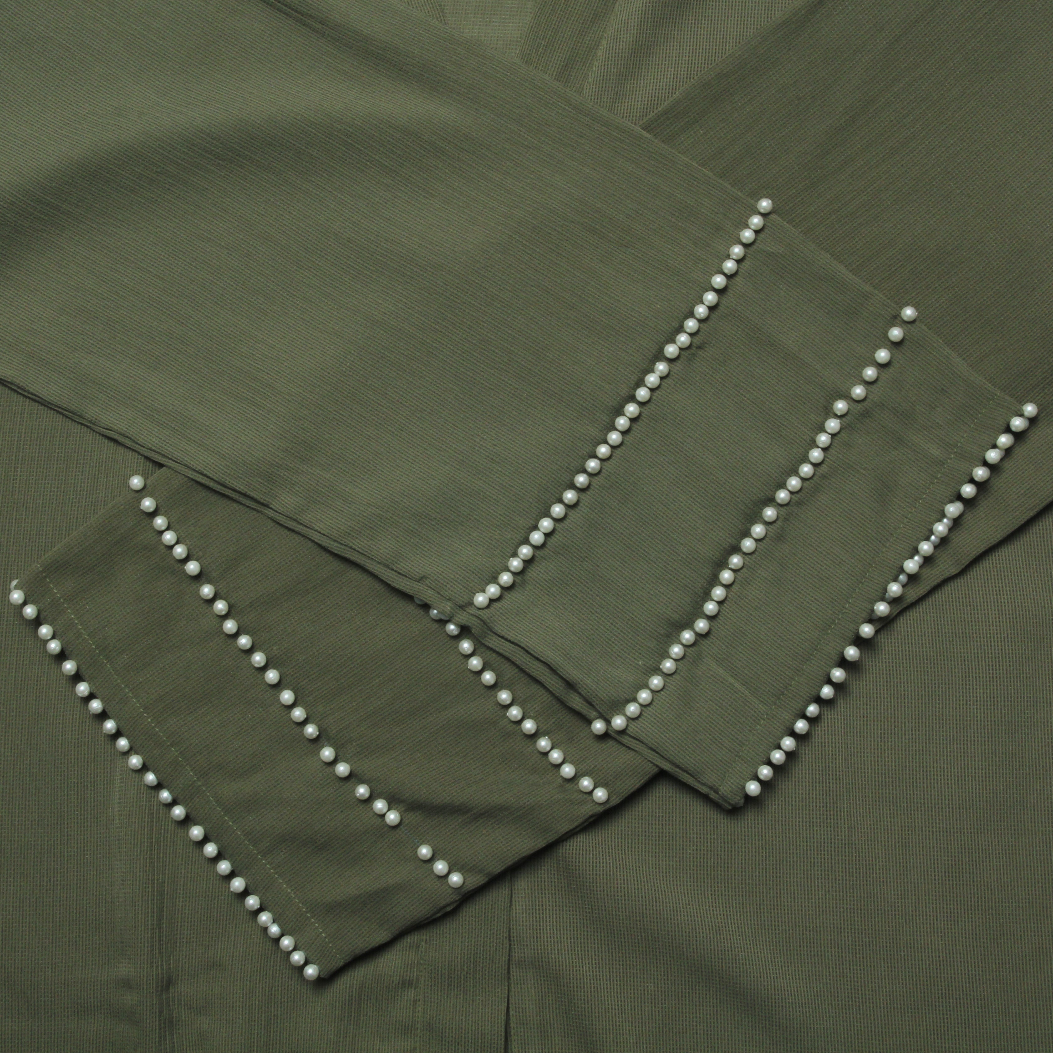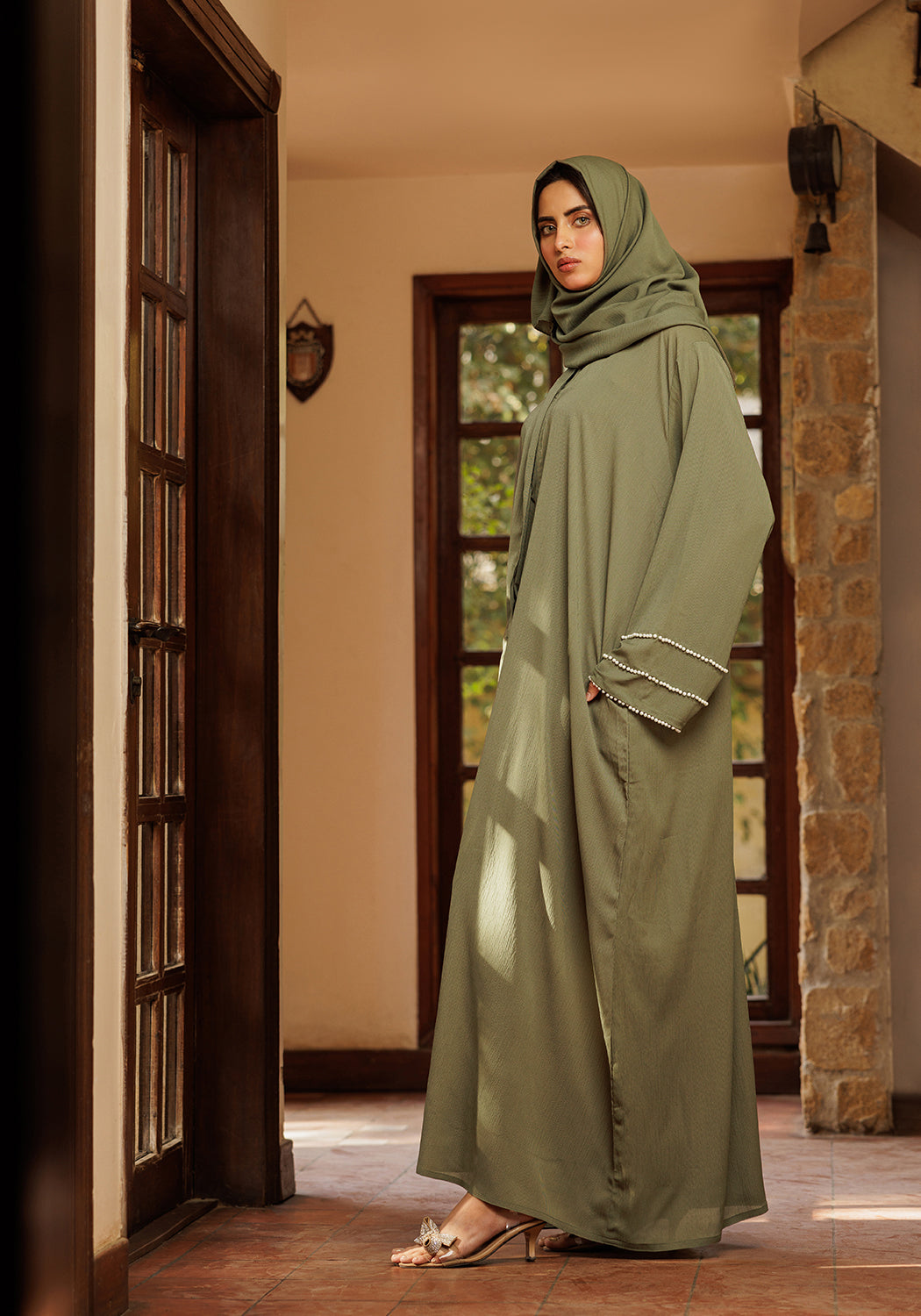 Step into elegance with the Olive Pearl Sleeve Abaya, a perfect blend of sophistication and grace. Designed in a rich olive hue, this abaya radiates a serene yet stylish vibe.