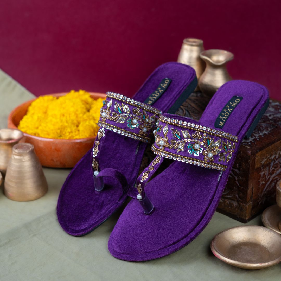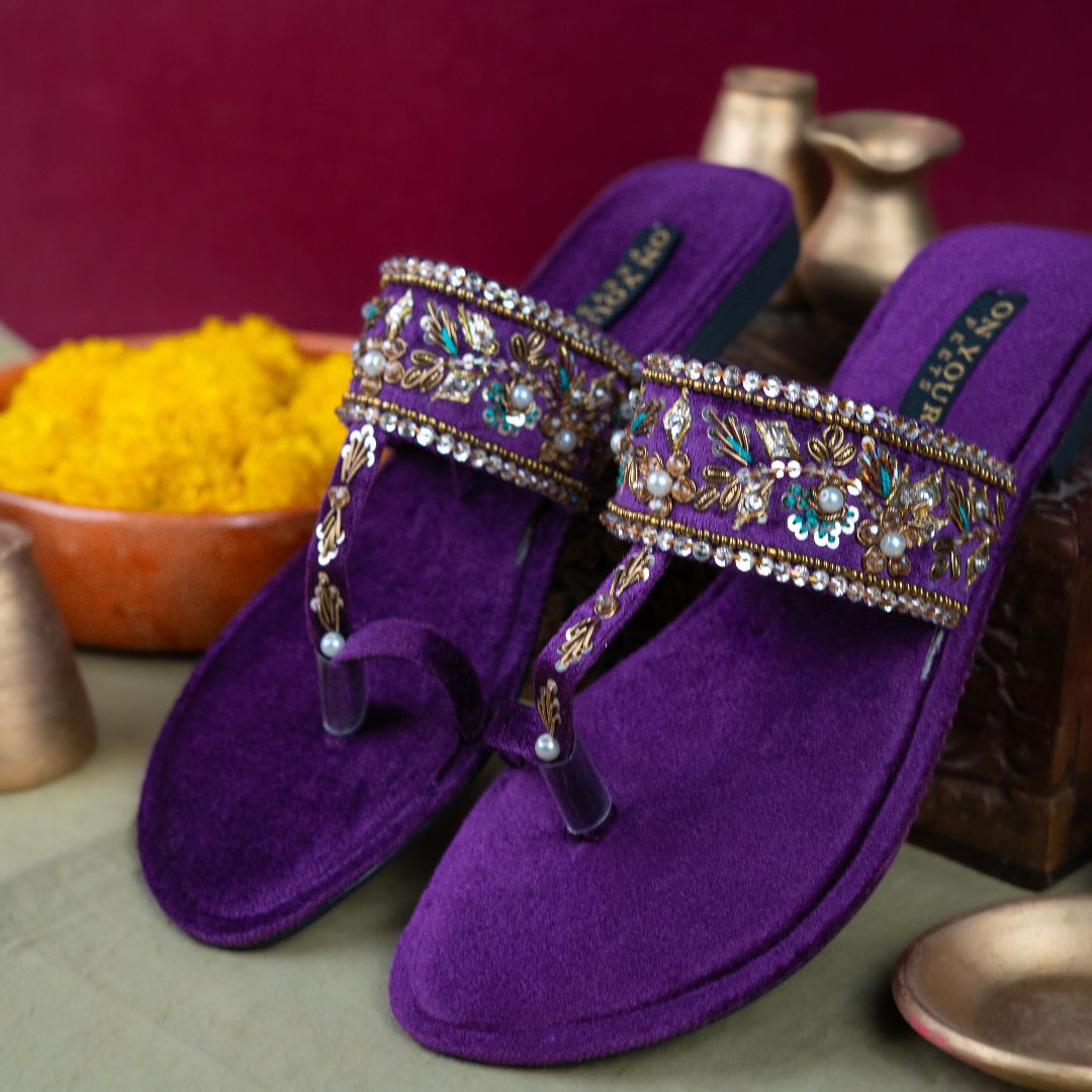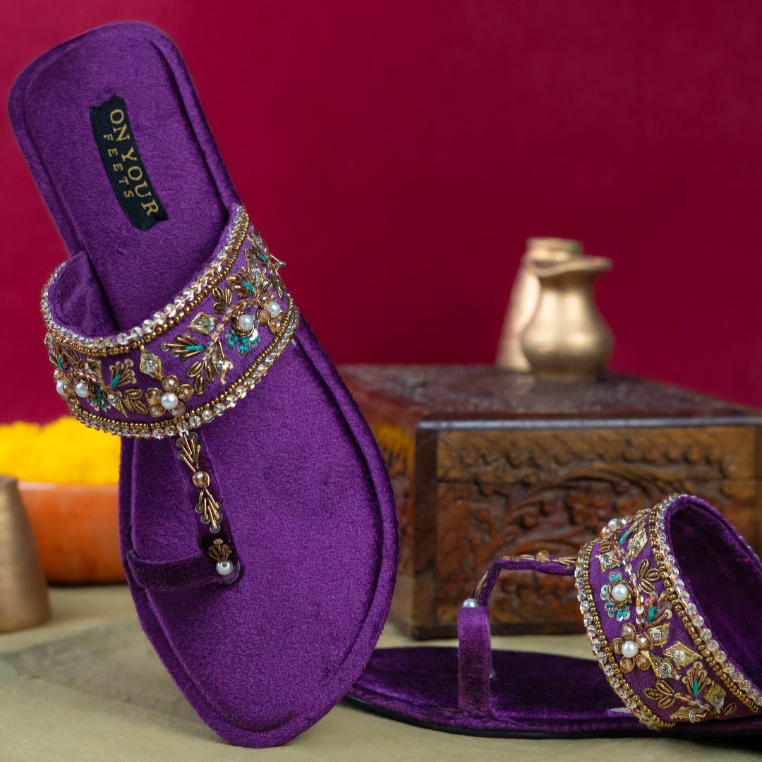 Embrace regal charm with the Amethyst Noor Kholapuri by ON YOUR FEETS, a graceful expression of heritage craftsmanship and contemporary elegance. Designed in a luxurious deep purple suede base, this handcrafted pair is beautifully adorned with gold threadwork, delicate pearls, sequins, and intricate floral embellishments.
